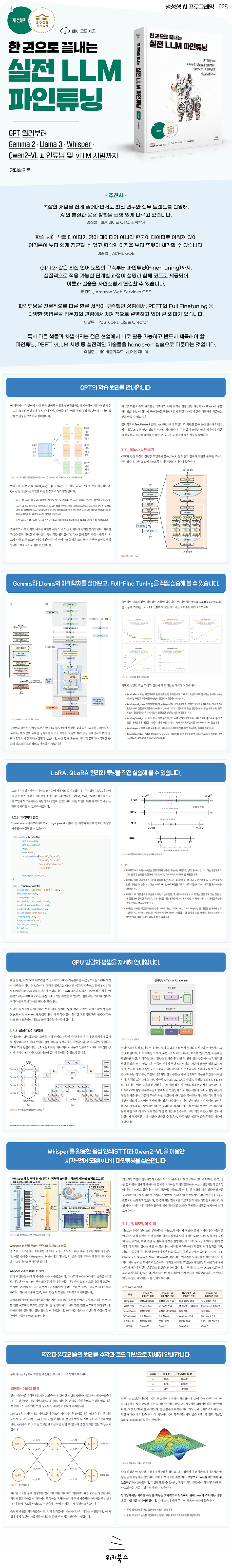 ÀÌ Ã¥Àº AI ±â¼úÀÇ ÃÖÀü¼±¿¡¼ ÇÊ¿äÇÑ LLM ÆÄÀÎÆ©´×ÀÇ ¸ðµç °úÁ¤À» À̷кÎÅÍ ½Ç½À±îÁö ´Ü°èº°·Î ¾È³»ÇÕ´Ï´Ù. Llama 3.1°ú Gemma 2 ¸ðµ¨À» ±â¹ÝÀ¸·Î ÆÄÀÎÆ©´×ÀÇ ÇÙ½É ±â¼úÀ» ÀÍÈ÷°í, À̹ø °³Á¤ÆÇ¿¡¼ »õ·Ó°Ô Ãß°¡µÈ À½¼º ÀνÄ(Whisper)°ú ½Ã°¢-¾ð¾î ¸ðµ¨(VLM) ½Ç½ÀÀ» ÅëÇØ ¸ÖƼ¸ð´Þ AI °³¹ß ¿ª·®±îÁö È®ÀåÇÒ ¼ö ÀÖ½À´Ï´Ù.