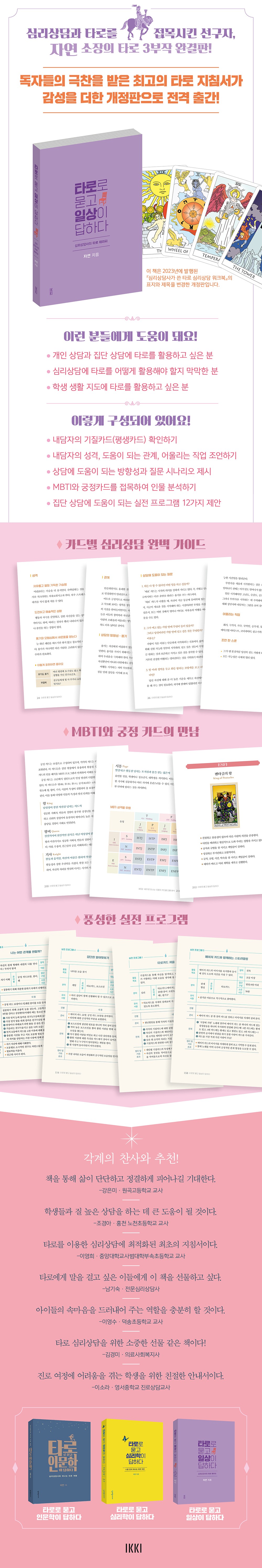 Ã¥ ¼Ó¿¡´Â ³»´ãÀÚÀÇ ±âÁú(Æò»ý)Ä«µå ÆÄ¾ÇÇϱâ, »ó´ãÀÇ ¹æÇ⼺°ú µµ¿òÀÌ µÇ´Â Áú¹® ½Ã³ª¸®¿À, ÀþÀº ÃþÀÇ Æ®·»µå¸¦ ¹Ý¿µÇÏ¿© MBTI¿Í ±ÃÁ¤Ä«µå¸¦ Á¢¸ñÇÑ Àι° ºÐ¼®, ±×¸®°í Áý´Ü »ó´ã¿¡ ¹Ù·Î Àû¿ëÇÒ ¼ö ÀÖ´Â 12°³ÀÇ ½ÇÀü ÇÁ·Î±×·¥±îÁö Ÿ·Î »ó´ã¿¡ ÇÊ¿äÇÑ ¸ðµç ³ëÇϿ찡 ºüÁü¾øÀÌ ´ã°Ü ÀÖ½À´Ï´Ù. ƯÈ÷ ÇлýµéÀÇ ¼Ó¸¶À½À» À̲ø¾î³»°í »ýȰÁöµµ¸¦ ÇØ¾ß ÇÏ´Â ±³»ç, ±íÀÌ ÀÖ´Â »ó´ã ȯ°æÀ» ¸¶·ÃÇϰíÀÚ ÇÏ´Â Àü¹® ½É¸®»ó´ã»çµé¿¡°Ô °¡Àå µçµçÇϰí Ä£ÀýÇÑ ±æÀâÀ̰¡ µÇ¾îÁÙ °ÍÀÔ´Ï´Ù