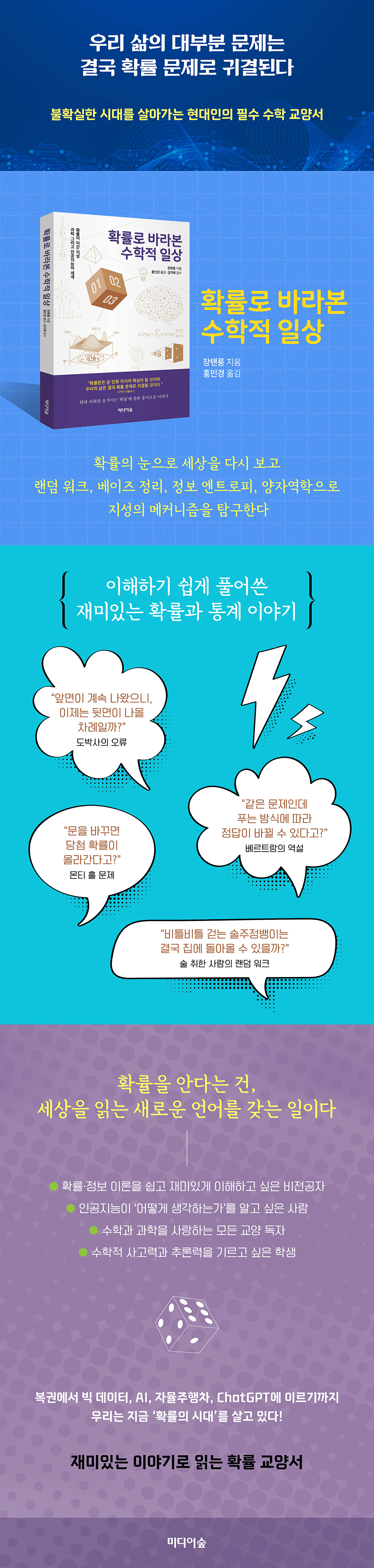 ÇÏÁö¸¸ ¡ºÈ®·ü·Î ¹Ù¶óº» ¼öÇÐÀû ÀÏ»ó¡»Àº ÀÌ À§ÇèÇÑ È帧¿¡ ¿Ã¶óź »ç¶÷µé¿¡°Ô ¼öÇÐÀû ÅëÂûÀ» ´øÁø´Ù. ÀÌ Ã¥Àº ´Ü¼øÇÑ ¼öÇÐ ±³¾ç¼°¡ ¾Æ´Ï´Ù. È®·üÀ̶ó´Â ·»Áî·Î Àΰ£ÀÇ Âø°¢À» µé¿©´Ùº¸°í AIó·³ ¼¼»óÀ» ´õ Çö¸íÇÏ°Ô ¹Ù¶óº¸´Â ¹ýÀ» ¾Ë·ÁÁÖ´Â »ýÁ¸Çü ±³¾ç¼´Ù. Ã¥¿¡ ³ª¿À´Â ¡®µµ¹Ú²ÛÀÇ ÆÄ»ê(Gambler¡¯s Ruin)¡¯ ¹®Á¦´Â Çö½ÇÀÇ ÅõÀÚ ½ÇÆÐ¸¦ ÀÌÇØÇÏ´Â µ¥ ³î¶ó¿î ±ú´ÞÀ½À» ÁØ´Ù. À̾߱â´Â ÀÌ·¸°Ô ½ÃÀ۵ȴÙ.