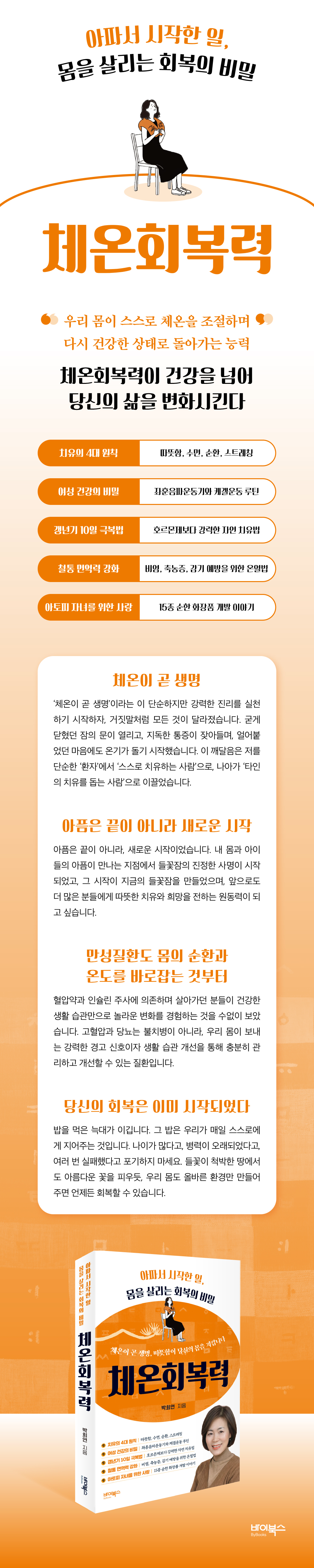 ÀÌ Ã¥Àº 1ºÎ¿¡¼ ¾ÆÇÄ¿¡¼ ½ÃÀÛµÈ ÀúÀÚÀÇ ¿©Á¤À» ÅëÇØ µé²ÉÀáÀÇ ±â¿øÀ» µé·ÁÁØ´Ù. ´Ü¼øÇÑ Ã¢¾÷ ½ºÅ丮°¡ ¾Æ´Ï¶ó ¿ì¸® ¸öÀÌ ½º½º·Î ü¿ÂÀ» Á¶ÀýÇÏ¸ç ´Ù½Ã °Ç°ÇÑ »óÅ·Πµ¹¾Æ°¡´Â ´É·ÂÀΠü¿Âȸº¹·Â¿¡ ¾î¶»°Ô °ü½ÉÀ» °¡Áö°Ô µÇ¾úÀ¸¸ç ±×°ÍÀ» »ç¾÷ÀÇ ¼º°ú¸¦ ÀÌ·ç¾î³Â´ÂÁö º¸¿©ÁØ´Ù. 2ºÎ¿¡¼´Â ´ç½ÅÀÇ »îÀ» ȸº¹½ÃÄÑÁÙ µé²ÉÀáÀÇ ¸ðµç °ÍÀ» ´Ù·ç°í Àִµ¥, µé²ÉÀáÀÇ µû¶æÇÑ Ã¶Çаú, ¸ÅÀÏ ½ÇõÇÏ´Â Ä¡À¯ ·çƾ, µé²ÉÀá Á¦Ç° À̾߱â, ±×¸®°í ±âÀû°ú °°Àº °í°´µéÀÇ °¨µ¿ ½ºÅ丮¸¦ ÅëÇØ °Ç°À» ³Ñ¾î ´ç½ÅÀÇ »îÀ» º¯È½ÃŰ´Â ü¿Âȸº¹·ÂÀÇ ºñ¹ÐÀ» ³ª´©°íÀÚ ÇÑ´Ù.