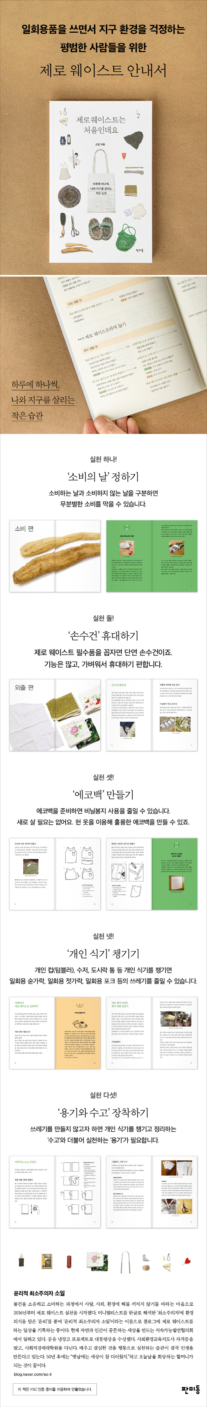 À» ¶§, ¾È¹æ °Å¿ïÀÌ ¿ï··¿ï··ÇÏ°í ¿òÁ÷¿´´Ù. ±×¶§ ³»°¡ ÀÚ¿¬½º·¹ ¶°¿Ã¸° °ÍÀº 2011³â µ¿ÀϺ» ´ëÁöÁø ÈÄÀÇ ¸ð½ÀÀ̾ú´Ù. °æÁÖ ÁöÁøÀº Àá±ñ ¿ï··´ë´Â Á¤µµ·Î ³¡³µÁö¸¸, ¾ÈÀü¿¡ ´ëÇÑ ºÒ¾ÈÇÑ ¸¶À½ÀÌ °¡½Å °ÍÀº ¾Æ´Ï¾ú´Ù. ¿©·¯ °¡Áö »ý°¢ÀÌ ÇØÀÏó·³ ¹Ð·Á¿Ô´Ù. ÇÑ ¹øµµ ÀÐ¾î º» Àû ¾ø´Â Ã¥ÀåÀÇ Ã¥°ú ÇÑ ¹øµµ ½á º» Àû ¾ø´Â ÂùÀåÀÇ À¯¸®ÄŵéÀÌ ½ñ¾ÆÁö¸é ¾î¶»°Ô µÇ³ª ÇÏ´Â °ÆÁ¤µµ ¾Õ¼¹´Ù. ÀϺ» ¾²³ª¹Ì¿Í °æÁÖ ÁöÁø±îÁö °Þ°í ³ª¼ ±×·¸°Ô ³ª´Â ¹Ì´Ï¸Ö¸®½ºÆ®°¡ µÇ¾ú´ÂÁöµµ ¸ð¸£°Ú´Ù. ¡®À±¸®Àû ÃÖ¼ÒÁÖÀÇÀÚ ¼ÒÀÏ¡¯À̶ó´Â Á¦·Î ¿þÀ̽ºÆ® ºí·Î±×¸¦ ½ÃÀÛÇÑ °Íµµ 2016³â 9¿ùÀÇ ÀÏÀÌ´Ù. -p.10 ³ªµµ Á¦·Î ¿þÀ̽ºÆ®(zero waste)¿¡ óÀ½ºÎÅÍ Àû±ØÀûÀ̾ú´ø °ÍÀº ¾Æ´Ï´Ù. ȯ°æ ¹®Á¦´Â ³Ê¹«³ªµµ °Å´ëÇØ¼ ¾î¶»°Ô ¼Õ¾´´Ù°í ÇØ°áµÉ ¼ö ÀÖ´Â ¹®Á¦°¡ ¾Æ´Ï¶ó ¿©±â°í Æ÷±âÇß´ø ½ÃÀýµµ ÀÖ¾ú´Ù. ±×·¯´Ù°¡ Áß±¹À» º¸°í »ý°¢À» ¹Ù²å´Ù. ¹Ì¼¼¸ÕÁö·Î »Ñ¿¸´ø Áß±¹ ÇÏ´ÃÀÌ APEC ȸÀÇ ±â°£ µ¿¾È Ǫ¸¥ Çϴ÷Π¹Ù²î´Â °ÍÀ» º» °ÍÀÌ´Ù. ±×°ÍÀº Äڷγª19 ±â°£ µ¿¾È¿¡µµ ÀÍÈ÷ °æÇèÇÑ »ç½ÇÀÌ´Ù. ȸ»ö ÇÏ´ÃÀ» ÆÄ¶õ Çϴ÷Π¸¸µå´Â °ÍÀ» º¸¸ç ±×°Íµµ ¸¶Âù°¡Áö·Î »ç¶÷ÀÇ ÈûÀ̶ó´Â Èñ¸ÁÀ» °®°Ô µÇ¾ú´Ù. ¡®³»°¡ ÇÒ ¼ö ÀÖ´Â ÀÛÀº ½ÇõÀÌ ¹Ì¼¼¸ÕÁö¸¦ ¾ø¾Ù ¼ö ÀÖ´Ù, ³ë·ÂÇÏ´Â ¸¸Å ¾²·¹±â¸¦ ÁÙÀÏ ¼ö ÀÖ´Ù.¡¯ ÇÏ´Â ÀÛÀº ¹ÏÀ½À» °®°Ô µÇ¾ú´Ù -p.11~12 ¿ì¸®´Â ¶§¶§·Î ¡®¾î¶² ¼±¹°À» ÇÒ±î?¡¯º¸´Ù ¡®¾î¶»°Ô ÇÏ¸é ¿¹»Ú°í È·ÁÇÏ°Ô Æ÷ÀåÇÒ ¼ö ÀÖÀ»±î?¡¯¿¡ ´ëÇØ °í¹ÎÇÑ´Ù. ÃÊÄݸ´À» ÁÖ´Â ³¯Àº ÃÊÄݸ´À» Æ÷ÀåÇϰí, »©»©·Î µ¥ÀÌ¿¡´Â »©»©·Î¸¦ Æ÷ÀåÇϰí, »ýÀÏ, Å©¸®½º¸¶½º, ±× ¿Ü °¢Á¾ ±â³äÀÏÀÌ¸é ¼±¹°À» ÁغñÇÏ´Â °Í¸¸ÅÀ̳ª ´Ù¾çÇÑ Æ÷Àå ±â¹ýÀ» µ¿¿øÇØ ¼±¹°À» Æ÷ÀåÇÏ´Â µ¥ Á¤¼ºÀ» ½ñ´Â´Ù. ±×·¯³ª Æ÷ÀåÀº ÆøÁ׳îÀÌó·³ ¹Ý¦ÀÌ´Â ¼ø°£ÀÌ Áö³ª¸é 100³â, 200³â µ¿¾È ½âÁö ¾Ê´Â ¾²·¹±â°¡ µÈ´Ù. -p.41 °£´Ü ¸í·áÇÏ°Ô ¸»ÇÒ ¼ö ÀÖ´Ù. ¡®Æí¸®ÇÔ¡¯ Çϳª¸¦ »©³õ°í »ý¼ö´Â ÁÁÀº Á¡ÀÌ ´Ü¿¬ÄÚ ¾ø´Ù. ÀÏ´Ü Ä£È¯°æÀûÀÎ ¸éÀÌ ¾ø´Ù´Â Á¡¿¡¼ Á¦·Î ¿þÀ̽ºÆ®ÀÇ °ÀûÀÌ´Ù. °Ô´Ù°¡ »ý¼ö´Â Àü±¹ÀÇ ¹° ÁÁ°í °ø±â ÁÁÀº °÷ÀÇ À̸§À» µû°Å³ª, Á÷Á¢ ±×°÷ÀÇ ¹°À» °³¹ßÇÑ´Ù. ¿¹¸¦ µé¾î È÷¸»¶ó¾ß ¾îµò°¡ÀÇ ¹°ÀÌ ±ú²ýÇÏ´Ù°í ÇÏ¸é ±× ¹°ÀÌ ÇÃ¶ó½ºÆ½¿¡ º´¿¡ ´ã±â±â±îÁö »êÀ» ±ð°í °øÀåÀ» Áö¾î ÇÃ¶ó½ºÆ½ º´¿¡ ´ãÀº µÚ ȼ® ¿¬·á¸¦ ÀÌ¿ëÇØ ¿î¼ÛÇÑ´Ù. ¿©±â±îÁö °úÁ¤¸¸À¸·Îµµ ÀÚ¿¬À» ÆÄ±«Çϰí ÀÚ¿øÀ» ¼ÒºñÇϴµ¥, ¼ÒºñÀÚÀÇ ¼ÕÀ» °ÅÃÄ(½ÉÁö¾î ¶Ñ²±À» µû´Ù°¡ ¹Ì¼¼ ÇÃ¶ó½ºÆ½ÀÌ ¹°¼ÓÀ¸·Î µé¾î°¥ ¼öµµ ÀÖ´Ù.) ÀçȰ¿ëÀ¸·Î ºÐ¸® ¹èÃâµÈ´Ù. -p.83 ¾ÆÄ§À» ±ú¿ì´Â ¸ð´×Ä¿ÇÇ ÇÑ ÀÜÀ» ¸¸µé±â À§ÇØ ¾ó¸¶¸¸ÅÀÇ ¹°ÀÌ ÇÊ¿äÇÒ±î? ÇÑ ÄÅÀÇ ¹°? ¾Æ´Ï´Ù. Àڱ׸¶Ä¡ 130§¤ÀÇ ¹°ÀÌ ÇÊ¿äÇÏ´Ù. À̰ÍÀÌ ¹Ù·Î ¸ð´×Ä¿ÇÇ ÇÑ ÀÜÀÌ ³²±ä ¡®¹°¹ßÀÚ±¹(water footprint)¡¯ÀÌ´Ù. ¹°¹ßÀÚ±¹Àº ¿ø·á äÃëºÎÅÍ »ý»ê, ¼ö¼Û ¹× À¯Åë, »ç¿ë, Æó±â±îÁö ¸ðµç °úÁ¤¿¡¼ ¾ó¸¶¸¸ÅÀÇ ¹°ÀÌ ¼ÒºñµÇ¾ú´ÂÁö¸¦ ³ªÅ¸³»´Â ÁöÇ¥´Ù. 1§¸ÀÇ ¿øµÎ¸¦ »ý»êÇϱâ À§ÇØ Ä¿Çdzª¹«¸¦ Ű¿ì°í, ¿¸Å¸¦ ¼öÈ®Çϰí, ¿øµÎ¸¦ ºº¾Æ À¯ÅëÇÏ´Â µ¥ ¾à 1¸¸ 8900§¤°¡ ÇÊ¿äÇÏ´Ù. 1§¸À» ±âÁØÀ¸·Î ´ß°í±âÀÇ ¹°¹ßÀÚ±¹Àº 4,335§¤, µÅÁö°í±â´Â 5,988§¤, ¼Ò°í±â´Â 1¸¸ 5415§¤´Ù. ¡¦ ´Ù¸¥ ½Äǰº¸´Ù ÈξÀ ¸¹Àº ¹°À» ¼ÒºñÇÏ´Â °ÍÀÌ ¹Ù·Î Ä¿ÇÇ´Ù. ±×¸¸Å ȯ°æ¿¡ ³¢Ä¡´Â ¿µÇâÀÌ ¸·´ëÇÏ´Ù ´Â Á¡À» ±â¾ïÇÏÀÚ. Ä¿ÇÇ ÇÑ ÀÜÀº ¾ÆÁÖ °ªºñ½Î´Ù. -p.133 ³ÃÀå½Ç, ³Ãµ¿½Ç¿¡´Â ¸ÔÀ»°Å¸®°¡ °¡µæ µé¾î ÀÖÁö¸¸, ÀÚ¼¼È÷ »ìÆìº¸¸é ÀÌ»óÇϰԵµ ¡®¸ÔÀ» ¸¸ÇÑ¡¯ °ÍÀº ¾ø´Ù. À½½ÄÀ» »óÇÏÁö ¾Ê°Ô º¸°üÇϱâ À§ÇÑ ³ÃÀå°í¸¦ ¿ì¸®´Â ¡®Ã¢°í¡¯·Î ¾²°í ÀÖ´Â °ÍÀº ¾Æ´Ò±î? -p.158 Ä£±¸, ÁöÀÎ, °¡Á·ÀÇ º¯È¸¦ À̲ø ¼ö ÀÖ´Â °¡Àå ºü¸¥ ¹æ¹ýÀº ±×µé¿¡°Ô ³» ¼±ÅÃÀ» ½ÇõÀ¸·Î º¸¿© ÁÖ´Â °ÍÀÌ´Ù. ³ªÃ³·³ ÇØº¸¶ó°í ¹«¾ðÀÇ ¾Ð¹ÚÀ» ÇÒ Çʿ䵵 ¾ø´Ù. ±×Àú ³»°¡ ÇÏ´Â ÇൿÀÌ ±×µé¿¡°Ô °ø°¨À» ºÒ·¯ÀÏŰ´Â °ÍÀ¸·Î ½ÃÀÛÀÌ µÈ´Ù. ³» ÇൿÀ¸·Î ÁÖº¯ »ç¶÷ÀÇ »ý°¢°ú ÇൿÀÌ º¯Çϵµ·Ï ¸¸µå´Â ÀÏ, ±×°ÍÀÌ ³ªÀÇ ½ÇõÀ¸·Î ¼¼»óÀ» ¹Ù²Ù´Â ½ÃÀÛÁ¡ÀÌ µÈ´Ù. ¾î¼¸é ¼¼»óÀº ¹ßǰ°ú ¼ÕǰÀ¸·Î Á¶±Ý¾¿, Á¶±Ý¾¿ ¹Ù²î´Â °ÍÀÎÁöµµ ¸ð¸¥´Ù. -p.253 ÃâÆÇ»ç ¼ÆòÀ±¸®Àû ÃÖ¼ÒÁÖÀÇÀÚ ¼ÒÀÏÀÇ