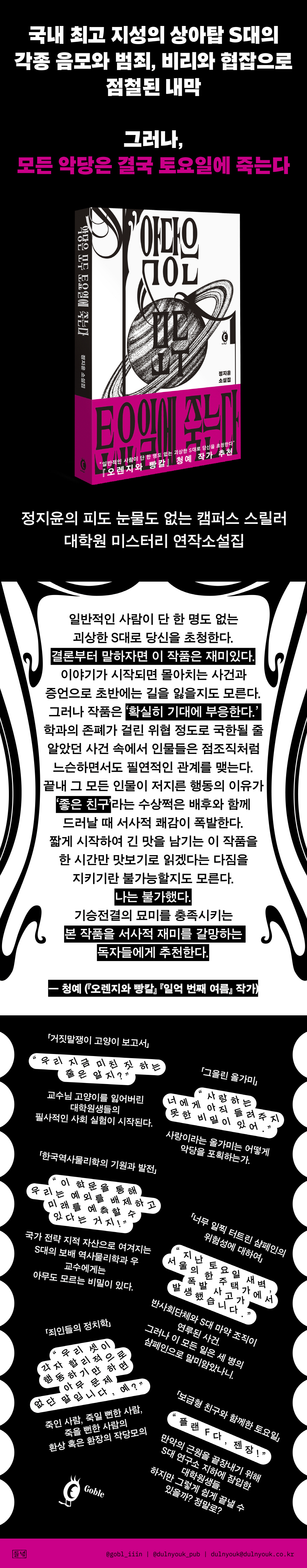 ÀÌ Ã¥¿¡ ¼ö·ÏµÈ ´ÜÆíµé Áß ÀϺδ 2020³â´ë ÃÊ µ¶¸³ÃâÆÇµÇ¾î À帣¼Ò¼³ ¸¶´Ï¾Æµé·ÎºÎÅÍ ¡®°¡È÷ µ¶¸³ÃâÆÇ°èÀÇ Àü¼³ÀÌ µÉ ¸¸ÇÑ ¼öÀÛ¡¯À̶ó´Â ÆòÀ» ¹Þ¾Ò´ø ¹Ù ÀÖ´Ù. ±Ý¹ø¿¡ °íºí¿¡¼ ¼±º¸ÀÌ´Â ¡º¾Ç´çÀº ¸ðµÎ Åä¿äÀÏ¿¡ Á״´١»´Â ±âÁ¸¿¡ µ¶¸³ÃâÆÇµÇ¾ú´ø ¡¸°ÅÁþ¸»ÀïÀÌ °í¾çÀÌ º¸°í¼¡¹ ¡¸±×À»¸° ¿Ã°¡¹Ì¡¹ ¡¸Çѱ¹¿ª»ç¹°¸®ÇÐÀÇ ±â¿ø°ú ¹ßÀü¡¹°ú ½ÅÀÛ ¼Ò¼³ ¼¼ ÆíÀ» ÇÔ²² ¿«¾î º¸´Ù È®ÀåµÈ ¼¼°è°üÀ» ¼±º¸ÀδÙ.