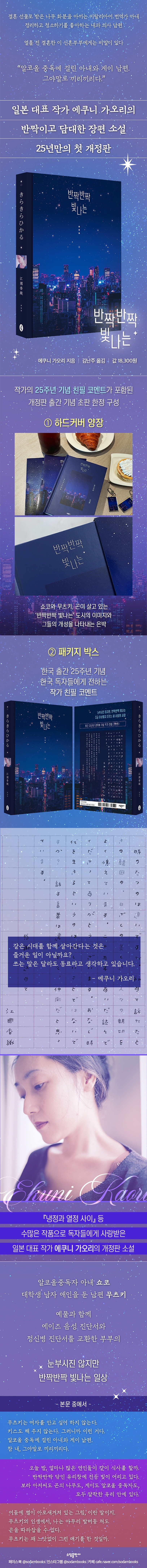 ÀϺ» ´ëÇ¥ ÀÛ°¡ ¿¡Äí´Ï °¡¿À¸® ¡º¹Ý¦¹Ý¦ ºû³ª´Â¡» Ãâ°£ 25Áֳ⠱â³ä °³Á¤ÆÇ Ãâ°£! °áÈ¥ ¼±¹°·Î ¹ÞÀº ³ª¹« È­ºÐÀ» ¾Æ³¢¸ç ÀÌÅ»¸®¾Æ¾î¸¦ ¹ø¿ªÇÏ´Â ¾Æ³» ¼îÄÚ. ¹¹µç ¹Ý¦¹Ý¦ ºû³ªµµ·Ï ±ò²ûÇÏ°Ô Á¤¸®Çϰí û¼ÒÇϱ⸦ ÁÁ¾ÆÇÏ´Â ³²Æí ¹«Ã÷Ű. Æò¹üÇØ º¸ÀÌÁö¸¸ ¾îµò°¡ µ¶Æ¯ÇØ º¸ÀÌ´Â, ¿­Èê Àü °áÈ¥ÇÑ ÀÌ ºÎºÎ¿¡°Ô´Â ºñ¹ÐÀÌ ÀÖ´Ù. ¾Æ³» ¼îÄÚ´Â ¾ËÄÚ¿Ã Áßµ¶°ú Á¶¿ïÁõÀ» ¾Î°í ÀÖ°í, ³²Æí ¹«Ã÷Ű´Â ´ëÇлý ¾ÖÀÎ °ïÀ» µÐ °ÔÀÌ´Ù. ¾ÖÀÎÀ» ¸¸µé¾îµµ µÈ´Ù´Â ¾à¼Ó°ú ÇÔ²² °áÈ¥ÇÑ µÎ »ç¶÷. ¿¹¹°°ú ÇÔ²² ¿¡ÀÌÁî À½¼º Áø´Ü¼­¿Í Á¤½Åº´ Áø´Ü¼­¸¦ ±³È¯ÇÑ ºÎºÎ. ¼îÄÚ´Â À̵û±Ý ³²Æí¿¡°Ô ¾ÖÀΰúÀÇ ÀÏÈ­¸¦ À̾߱âÇØ ´Þ¶ó°í Á¶¸£°í ¹«Ã÷Ű´Â ¾Æ³»¿¡°Ô ¾ÖÀÎÀ» ¸¸µé¶ó ±ÇÀ¯ÇÑ´Ù. °¢ÀÚÀÇ ¹æ½ÄÀ¸·Î ¼­·Î¸¦ »ç¶ûÇÏ´Â ¼¼ »ç¶÷ÀÇ ÀÏ»óÀº ´«ºÎ½ÃÁø ¾ÊÁö¸¸ ±×µé¸¸ÀÇ °³¼ºÀ¸·Î ¹Ý¦¹Ý¦ ºû³­´Ù. ¼Ò²ß³îÀÌ °°Àº ÆòÈ­·Ó°í ¾È¿ÂÇÑ ÀÏ»ó¿¡ Ç« ºüÁ® ÀÌ´ë·Î »ì°í ½ÍÀº ¼îÄÚ, ±× ´©±¸º¸´Ù ÀÌ »ýȰÀÌ À̾îÁö±â¸¦ ¹Ù¶ó´Â ¹«Ã÷Ű, ±×·± ±×µéÀÇ °ç¿¡ ¸Ó¹°¸ç ¾î¿ï¸®´Â °ï. ¾ðÁ¦ ³¡³¯Áö ¸ð¸£´Â ±×µé¸¸ÀÇ À§ÅÂ·Î¿î »ç¶ûÀÌ ¿¡Äí´Ï °¡¿À¸® ƯÀ¯ÀÇ Ã»¾ÆÇÏ°í ´ã´ãÇÑ ¹®Ã¼·Î ´«ºÎ½ÃÁø ¾ÊÁö¸¸ ¹Ý¦ÀÌ´Â º° ¹«¸®Ã³·³ ÆîÃÄÁø´Ù.