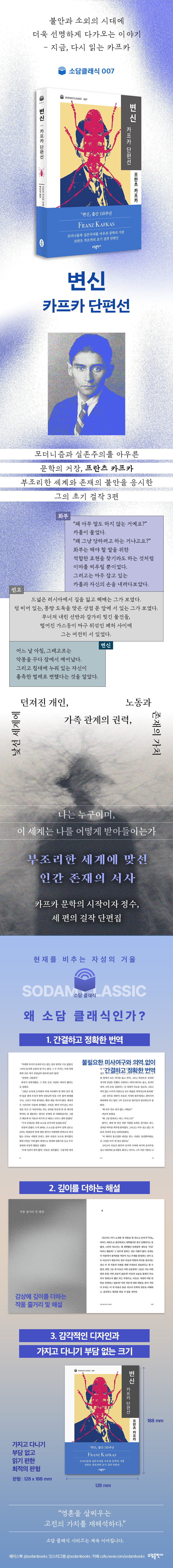 ÀÌ Ä«ÇÁÄ«ÀÇ Ãʱ⠴ëÇ¥ ´ÜÆí ¡¸ÈºÎ¡¹ ¡¸¼±°í¡¹ ¡¸º¯½Å¡¹À» Çѵ¥ ¹Àº Ä«ÇÁÄ« ´ÜÆí¼± ¡ºº¯½Å¡»ÀÌ ¼Ò´ã Ŭ·¡½Ä ½Ã¸®Áî·Î »õ·Ó°Ô µ¶ÀÚµéÀ» ã¾Æ¿Â´Ù. ÀÌ ´ÜÆí¼±Àº Àΰ£ Á¸ÀçÀÇ ºÒ¾È°ú »çȸÀû ¼Ò¿Ü, ºÎÁ¶¸®ÇÑ Çö½Ç°ú ÀÚ¾ÆÀÇ °¥µîÀ» ¹Ðµµ ³ô°Ô ±×·Á ³½ Ä«ÇÁÄ« ¹®ÇÐÀÇ Á¤¼ö¸¦ ´ã°í ÀÖ´Ù.