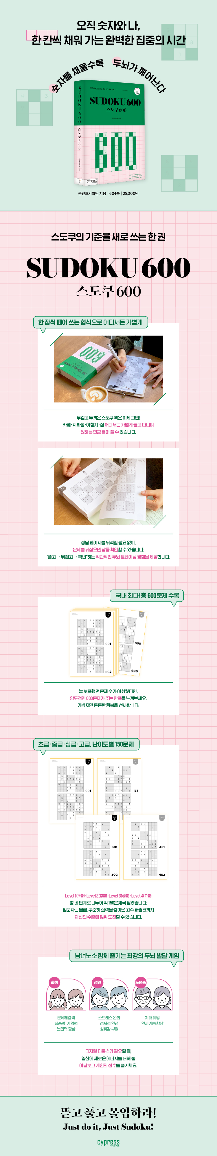 ¶ÇÇÑ ÀÌ Ã¥Àº ´Ü¼øÈ÷ ¹®Á¦ ¼ö¸¸ ¸¹Àº °ÍÀÌ ¾Æ´Ï´Ù. Level 1(ÃʱÞ)¡¤Level 2(Áß±Þ)¡¤Level 3(»ó±Þ)¡¤Level 4(°í±Þ) ³× ´Ü°è·Î ³À̵µ¸¦ ü°èÈÇϰí, °¢ ´Ü°è¿¡ 150¹®Á¦¾¿ ´ã¾Ò´Ù. Ãʱ޿¡¼´Â ½ºµµÄíÀÇ ±âº» ¿ø¸®¸¦ ÀÍÈ÷¸ç Ç®ÀÌ¿¡ ÀڽۨÀ» ¾ò°í, Áß±Þ°ú »ó±Þ¿¡¼´Â ±ÔÄ¢ ÀÀ¿ë°ú ÆÐÅÏ ÀÎ½Ä ´É·ÂÀ» ±â¸¦ ¼ö ÀÖ´Ù. °í±Þ ´Ü°è¿¡¼´Â ´õ º¹ÇÕÀûÀÎ »ç°í¿Í ³í¸® Àü°³ ¹æ½ÄÀ» È®ÀåÇÒ ¼ö ÀÖ´Ù. ¶§¹®¿¡, ½ºµµÄí¸¦ óÀ½ ÇÏ´Â ÀÔ¹® ÆÛÁñ·¯µéµµ, ¿À·¡ Áñ°Ü¿Â °í¼ö ÆÛÁñ·¯µéµµ ÃæºÐÈ÷ ¸¸Á·ÇÒ ¸¸ÇÑ ±íÀ̸¦ Á¦°øÇÑ´Ù. µ¶ÀÚ´Â ±×³¯ÀÇ ÄÁµð¼ÇÀ̳ª ÀÚ½ÅÀÇ ½Ç·Â ¼öÁØ¿¡ ¸ÂÃç ÀÚÀ¯·Ó°Ô ³À̵µ¸¦ ¼±ÅÃÇϸç Ç®ÀÌÇÒ ¼ö ÀÖ´Ù.