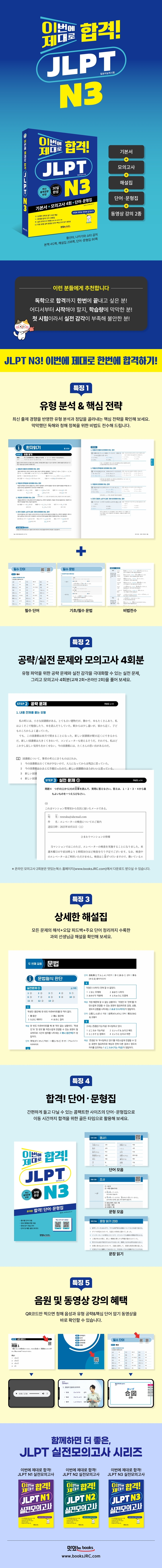 ¡ºÀ̹ø¿¡ Á¦´ë·Î ÇÕ°Ý! JLPT ÀϺ»¾î´É·Â½ÃÇè N3¡»´Â ÃֽŠÃâÁ¦ °æÇâÀ» ¿Ïº®ÇÏ°Ô ºÐ¼®ÇÏ°í »Ì¾Æ³½ ÇÙ½É Àü·«À» ´ãÀº ±âº»¼¸¦ ÅëÇØ ÇнÀ ¹æÇâÀ» ¸íÈ®ÇÏ°Ô Á¦½ÃÇÕ´Ï´Ù. ¶ÇÇÑ, ¸ðµç ¹®Á¦¿¡ ´ëÇÑ ºóÆ´¾ø°í »ó¼¼ÇÑ ÇØ¼³À» ½Ç¾î ¿Ö Á¤´äÀÎÁö, ¿Ö ¿À´äÀÎÁö ½º½º·Î ¿Ïº®ÇÏ°Ô ÀÌÇØÇÒ ¼ö ÀÖµµ·Ï ±¸¼ºÇß½À´Ï´Ù. ÃÑ 4ȸºÐ(±³Àç 2ȸ+¿Â¶óÀÎ 2ȸ)ÀÇ ¸ðÀǰí»ç¸¦ Á¦°øÇÏ¿© ½ÃÇè Àü ÃÖÁ¾ Á¡°ËÀ» ¿Ïº®ÇÏ°Ô Áö¿øÇϰí, È޴뼺À» ±Ø´ëÈÇÑ ÄÞÆÑÆ®ÇÑ »çÀÌÁîÀÇ ´Ü¾î/¹®ÇüÁýÀº ÀÚÅõ¸® ½Ã°£±îÁö Ȱ¿ëÇÏ¿© Çʼö ¾îÈÖ¿Í ¹®ÇüÀ» ¾Ï±âÇÒ ¼ö ÀÖ°Ô µµ¿ÍÁÝ´Ï´Ù. ÀÌ ÇÑ ±ÇÀÇ Ã¥À¸·Î À̹ø¿¡ Á¦´ë·Î JLPT N3¸¦ °ø·«ÇØ º¸½Ã±â ¹Ù¶ø´Ï´Ù.