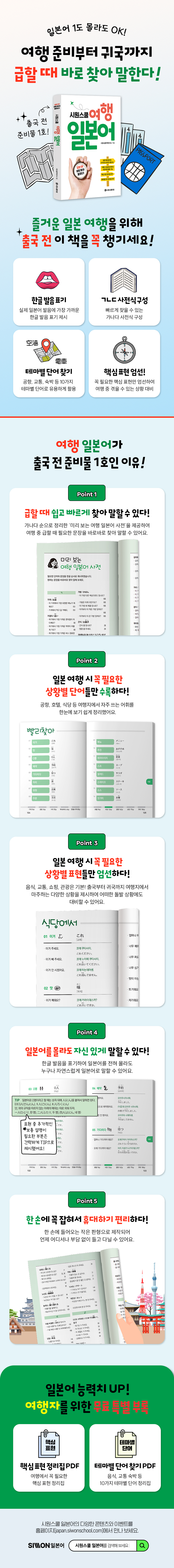 Ã¥¼Ò°³¡º½Ã¿ø½ºÄð ¿©Çà ÀϺ»¾î¡»´Â ¿©Çà ÁغñºÎÅÍ ±Í±¹±îÁö ÀϺ» ¿©Çà¿¡ ²À ÇÊ¿äÇÑ Çʼö ´Ü¾î¿Í Ç¥ÇöµéÀ» Å©°Ô 10°¡Áö »óȲÀ¸·Î ºÐ·ùÇÏ¿© Á¤¸®ÇÑ µµ¼ÀÌ´Ù. ±ÞÇÒ ¶§ ÇÊ¿äÇÑ ¹®ÀåÀ» ºü¸£°Ô ã¾Æ ¸»ÇÒ ¼ö ÀÖµµ·Ï ¸ðµç Ç¥ÇöÀ» °¡³ª´Ù »çÀü½ÄÀ¸·Î ±¸¼ºÇÏ¿´´Ù. ¶ÇÇÑ ÀϺ»¾î¸¦ ¸ô¶óµµ ÀÇ»ç¼ÒÅë¿¡ ÀüÇô ¾î·Á¿òÀÌ ¾øµµ·Ï ¸ðµç ´Ü¾î¿Í ¹®Àå¿¡ ½ÇÁ¦ ¹ßÀ½¿¡ °¡Àå °¡±î¿î ÇÑ±Û ¹ßÀ½À» Ç¥±âÇÏ¿© Á¦½ÃÇÏ¿´´Ù.