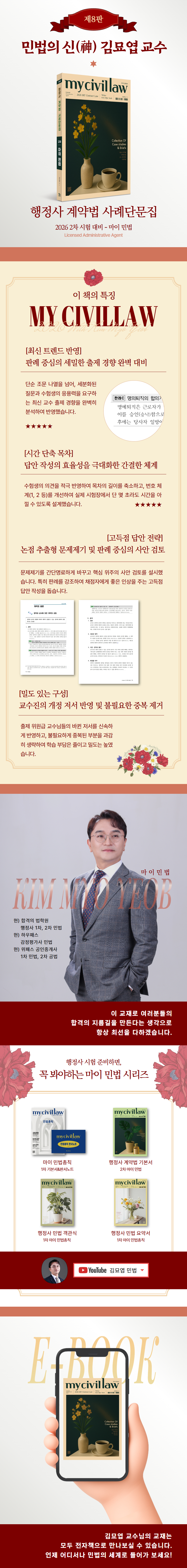 2025³â ÇàÁ¤»ç ¹®Á¦ºÎÅÍ ±³¼ö´ÔµéÀÌ ´õ¿í ¼¼¹ÐÇÑ ÆÇ·Ê Áß½ÉÀÇ ÃâÁ¦¹æÇ⼺À» ¿ÏÀüÈ÷ È®¸³µÇ¾ú´Ù´Â ´À³¦À» ¹Þ¾Ò½À´Ï´Ù. ´Ü¼øÇÑ Á¶¹®ÀÇ ¿°Å¸¦ Áö¾çÇÏ°í °è½Ã°í, Áú¹®À» ¼¼ºÐÈÇϼż ¼öÇè»ýÀÇ ÀÀ¿ë·Âµµ ÇÔ²² º¸½Ã´Â ¹®Á¦¸¦ ÃâÁ¦Çϼ̽À´Ï´Ù. ¹ý´ë±³¼ö´ÔµéÀº ±âº»°³³äÀÇ Á¤¸³À» ÇʼöÀûÀÌ¶ó ¿©±â½Ã°í, º¯ÇüµÈ ¹®Á¦µµ ¸ÂÃâ ¼ö ÀÖ´Â ¼öÇè»ý°ú ±×·¸Áö ¾ÊÀº ¼öÇè»ýÀÇ Â÷À̰¡ ¹Ù·Î ¼öÇè»ýÀ» º¯º°ÇÒ ¼ö ÀÖ´Â °¡Àå ÁÁÀº ¼ö´ÜÀ̶ó°í »ý°¢ÇϽñ⠶§¹®¿¡ ±×¿¡ ´ëÇÑ ´ëºñµµ ÇØ¾ß ÇÒ °ÍÀÔ´Ï´Ù. ¼ö¾÷ÀÇ Æ¯Â¡ÀÔ´Ï´Ù. 1.¿©·¯ºÐµé²² ¹Ì¾ÈÇÕ´Ï´Ù. ¹Î¹ýÀ̶ó´Â °ú¸ñÀÇ ¾çÀ» ÃÖ¼ÒÇÑÀ¸·Î ÇÏ¿© °øºÎ·®À» ÁÙ¿©µå¸®°í, Á¡¼ö´Â °íµæÁ¡À» ¹Þ°Ô ÇØµå·ÈÁö¸¸ ÀÌÁ¦´Â °øºÎ·®À» ´Ã·Áµå·Á¾ß ÇÏ´Â ½ÃÁ¡ÀÌ µÇ¾ú½À´Ï´Ù. ¹Î¹ý¿¡¼ ºÎ´ã°¨À» µå¸®°Ô µÇ¾î¼ ¹Ì¾ÈÇÕ´Ï´Ù. 2. ´ë½Å¿¡ ÆÇ¼³ëÆ®¸¦ Á¦°øÇؼ Çʱ⸦ ÁÙ¿©µå¸®°í, ÁýÁß·ÂÀ» ³ôÀ̱â À§ÇØ ÀüÀÚÄ¥ÆÇÀ» Ȱ¿ëÇϰڽÀ´Ï´Ù. ¸ðµç Ã¥À» ÀüÀÚÃ¥À¸·Î Ãâ°£ÇØ¼ ÈÞ´ë¿¡ ´ëÇÑ ºÒÆíÇÔµµ ÃÖ¼ÒÈ ÇϰڽÀ´Ï´Ù. 3.°øºÎ·®À» ¸¹ÀÌ ´Ã¸®±â ¶§¹®¿¡ ÆÇ·Ê¿Í ±³ÀçÀÇ ³»¿ë Áß¿¡¼ Çʼö ´Ü¾î¿Í ¹®Àå¿¡ ¹ØÁÙÀ» ±×¾î °¡¸é¼ ³»¿ëÀ» ÀÌÇØÇÏ°í ¾Ï±âÇÒ ¼ö ÀÖµµ·Ï Á¤¸®ÇÕ´Ï´Ù. 4.¼ö¾÷ Áß¿¡ ³íÁ¡À» ã´Â ÈÆ·ÃÀ» ¹Ýº¹Çؼ ÁøÇàÇÒ ¿¹Á¤ÀÔ´Ï´Ù. ¼ö¾÷ Áß¿¡ ÃâÁ¦°¡´ÉÇÑ ¹üÀ§¿¡ ´ëÇØ¼ °ÀÇ·Î °Á¶ÇßÁö¸¸ Á÷Á¢ ÀڷḦ Á¦°øÇؼ ³íÁ¡À» ã´Â ÈÆ·ÃÀ» ¹Ýº¹Çؼ ¼÷·Ãµµ¸¦ ³ôÀ̰ڽÀ´Ï´Ù. ½ÃÇèÀå¿¡¼ÀÇ ºÒ¾È°¨À» ÃÖ¼ÒÈÇÏ°í ´Ù¾çÇÑ ÇüÅÂÀÇ ¹®Á¦¸¦ Á¢Çϵµ·Ï ÇϰڽÀ´Ï´Ù. À̹ø ±³ÀçÀÇ Æ¯Â¡ÀÔ´Ï´Ù. 1.±âÃâ¹®Á¦¿¡ ´ëÇÑ ÇØ¼®À» ÃÖ±Ù ÃâÁ¦ Æ®·£µå¿¡ ¸ÂÃß¾î¼ ²Ä²ÄÈ÷ Çß½À´Ï´Ù. ü°èÀûÀÎ ´ä¾ÈÁö ÀÛ¼º¿¡ ÁßÁ¡µµ µÎ¾úÁö¸¸, ´ä¾ÈÁöÀÇ È£È¯ÀÌ °¡´ÉÇϵµ·Ï ½Å°æµµ ½è½À´Ï´Ù. 2.±³¼ö´ÔµéÀÇ ¹Ù²ï Àú¼¸¦ ÃÖ´ëÇÑ ¹Ý¿µÇϰí, ÃâÁ¦°¡´ÉÇÑ ³íÁ¡À» ´Ù½Ã±Ý Ãß·Á³Â½À´Ï´Ù. 3.ÁÖÀ§ÀÇ Á¶¾ð¿¡ µû¶ó ´ä¾ÈÁö ÀÛ¼ºÀÇ ½Ã°£Àû È¿À²¼ºÀ» À§ÇØ ¸ñÂ÷ÀÇ ±æÀ̸¦ ÃÖ´ëÇÑ °£·«ÇÏ°Ô ±âÀçÇß½À´Ï´Ù. ¶ÇÇÑ À۳⠱³Àç¿¡ ÀÖ´ø °¡. ³ª. ¶ó´Â ¸ñÂ÷¸¦ 1), 2)·Î ¹Ù²Ù¾ú½À´Ï´Ù. ¾ÆÁÖ ¾à°£ÀÌ¶óµµ ½Ã°£À» ¾Æ³¥ ¼ö ÀÖ´Ù´Â ¼öÇè»ýÀÇ ÀǰßÀ» Àû±Ø ¹Ý¿µÇß½À´Ï´Ù. 4.¹®Á¦Á¦±â¸¦ ³íÁ¡À» Ã߸®´Â °£´ÜÇÑ ¹æ½ÄÀ¸·Î ¹Ù²Ù°í, »ç¾ÈÀÇ °ËÅäµµ °¡±ÞÀû °£·«ÇÏ°Ô Çٽɸ¸À» ¼³½ÃÇß½À´Ï´Ù. ±×¸®°í ÇØ´ç ¹®Á¦¿¡ µû¸¥ ÆÇ·Ê¸¦ ±âÀçÇÏ°Ô ÇÏ¿© ´ä¾ÈÁö¿¡ ´õ¿í ÁÁÀº À̹ÌÁö¸¦ °¡Áö°Ô Çϵµ·Ï Çß½À´Ï´Ù. 5.±³Àç¿¡¼ ºÒÇÊ¿äÇÏ°Ô Áߺ¹µÈ ºÎºÐÀ¸·Î ±³ÀçÀÇ ¾çÀÌ ´Ã¾î³ª´Â °ÍÀ» ¸·±âÀ§Çؼ °ú°¨ÇÏ°Ô »ý·«Çß½À´Ï´Ù. ÇØ¸¶´Ù ¿©·¯ºÐµéÀÇ ¾ÖÁ¤ ¾î¸° °ü½É°ú ¾Æ³¦¾ø´Â Á¶¾ð¿¡ ±íÀÌ °¨»çµå¸³´Ï´Ù. ¿ÀÅ»ÀÚ¿Í À߸øµÈ ÇØ¼³À» ã¾Æ¼ ÁöÀûÇØ ÁֽŠ¿©·¯ºÐµé¿¡°Ô Á¤¸»·Î ¹Ì¾ÈÇÏ°í °¨»çÇÑ ¸¶À½ÀÔ´Ï´Ù. ÀúÀÇ ±³À縦 ¹Ï°í °øºÎÇØ Áֽô ¸ðµç ºÐµéÀ» »ý°¢Çϸç Á¤¼ºÀ» ´ÙÇØ¼ ¼öÁ¤°ú º¸¾ÈÀ» Çß½À´Ï´Ù. ´Ùµé ³Ê¹« °¨»çµå¸³´Ï´Ù. Á¦ °ÀÇ¿Í ±³Àç°¡ ¿©·¯ºÐµéÀÌ ¿øÇÏ´Â ÀλýÀÇ ÅÍ´×Æ÷ÀÎÆ®°¡ µÇ±æ ¹Ù¶ø´Ï´Ù. ¿©·¯ºÐµéÀÇ ÇÕ°ÝÀ» ±â¿øÇÕ´Ï´Ù. 2026. 1. 20 ±è¹¦¿± ¹è»ó ÃâÆÇ»ç ¼Æò¡°´Ü 1ÃÊÀÇ ½Ã°£µµ ÇêµÇÀÌ ¾²Áö ¾Êµµ·Ï, ¼öÇè»ýÀÇ ´«³ôÀÌ¿¡¼ ¾´ °è¾à¹ýÀÇ ÇØ´ä¡±