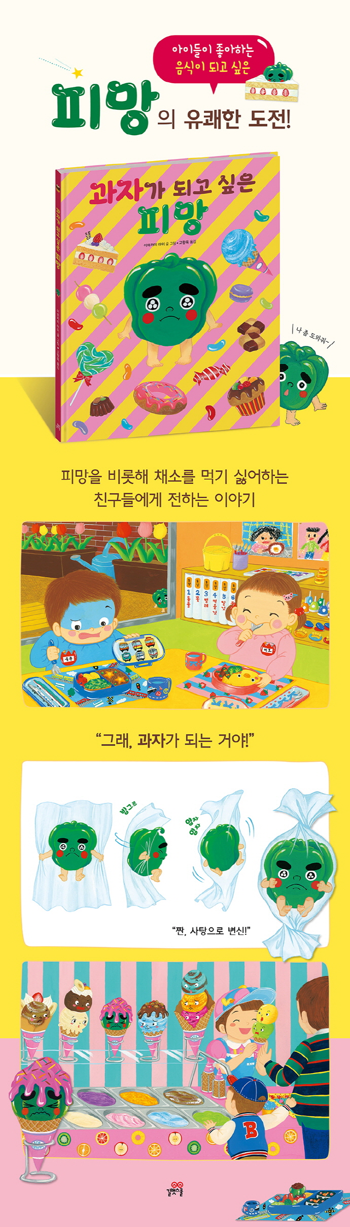ÀÛ°¡ ÀÌ¿ÍÄ«¹Ì ¾ÆÀÌ´Â À¯¾Æ ±³½Ç¿¡¼ ¾ÆÀ̵éÀ» °¡¸£Ä¡¸é¼, ÇǸÁÀ» ½È¾îÇÏ´Â ¾ÆÀ̸¦ º¸°í ¡º°úÀÚ°¡ µÇ°í ½ÍÀº ÇǸÁ¡»±×¸²Ã¥À» ±âȹÇß½À´Ï´Ù. ÇǸÁÀ» ºñ·ÔÇØ ä¼Ò¸¦ ¸Ô±â ½È¾îÇÏ´Â ¾ÆÀÌ¿¡°Ô À½½Ä¿¡ ´ëÇÑ Àç¹Ì³ »ó»ó·ÂÀ» ½É¾î ÁÖ±â À§ÇؼÁö¿ä. ÇǸÁÀ» Ä£±¸ ´ëÇϵíÀÌ Çϴ å ¼Ó ÁÖÀΰøÀÇ ¸ð½ÀÀº ¾ÆÀ̵éÀÌ Ã¤¼Ò¿¡ Ä£±Ù°¨À» ´À³¥ ¼ö ÀÖµµ·Ï µµ¿ÍÁÝ´Ï´Ù. ÇǸÁ ¸Ô±â¸¦ ½ÃµµÇÏ´Â Àå¸é ¶ÇÇÑ Ã¤¼Ò¿¡ È£±â½ÉÀ» °®°í, ¸ÔÀ» ¼ö ÀÖ´Ù´Â ÀڽۨÀ» °®°Ô ÇÏÁö¿ä. ÀÌó·³ ¡º°úÀÚ°¡ µÇ°í ½ÍÀº ÇǸÁ¡»Àº ´©±º°¡ °¿äÇØ¼°¡ ¾Æ´Ï¶ó, ¾ÆÀ̰¡ ½º½º·Î ä¼Ò¿¡ Èï¹Ì¸¦ ´À³¥ ¼ö ÀÖµµ·Ï µµ¿ÍÁÖ´Â ±×¸²Ã¥ÀÔ´Ï´Ù.