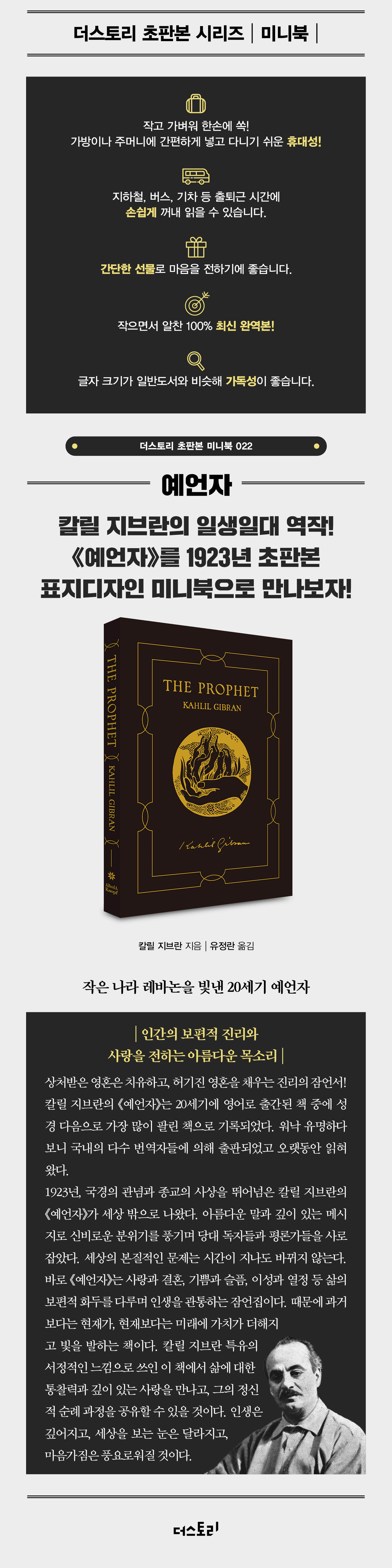 1923³â, ±¹°æÀÇ °ü³ä°ú Á¾±³ÀÇ »ç»óÀ» ¶Ù¾î³ÑÀº Ä®¸± Áöºê¶õÀÇ ¡¶¿¹¾ðÀÚ¡·°¡ ¼¼»ó ¹ÛÀ¸·Î ³ª¿Ô´Ù. ¾Æ¸§´Ù¿î ¸»°ú ±íÀÌ ÀÖ´Â ¸Þ½ÃÁö·Î ½Åºñ·Î¿î ºÐÀ§±â¸¦ dz±â¸ç ´ç´ë µ¶ÀÚµé°ú Æò·Ð°¡µéÀ» »ç·ÎÀâ¾Ò´Ù. ¼¼»óÀÇ º»ÁúÀûÀÎ ¹®Á¦´Â ½Ã°£ÀÌ Áö³ªµµ ¹Ù²îÁö ¾Ê´Â´Ù. ¹Ù·Î ¡¶¿¹¾ðÀÚ¡·´Â »ç¶û°ú °áÈ¥, ±â»Ý°ú ½½ÇÄ, À̼º°ú ¿Á¤ µî »îÀÇ º¸ÆíÀû ȵθ¦ ´Ù·ç¸ç ÀλýÀ» °üÅëÇÏ´Â Àá¾ðÁýÀÌ´Ù. ¶§¹®¿¡ °ú°Åº¸´Ù´Â ÇöÀç°¡, ÇöÀ纸´Ù´Â ¹Ì·¡¿¡ °¡Ä¡°¡ ´õÇØÁö°í ºûÀ» ¹ßÇϴ åÀÌ´Ù. Ä®¸± Áöºê¶õ ƯÀ¯ÀÇ ¼Á¤ÀûÀÎ ´À³¦À¸·Î ¾²ÀÎ ÀÌ Ã¥¿¡¼ »î¿¡ ´ëÇÑ ÅëÂû·Â°ú ±íÀÌ ÀÖ´Â »ç¶ûÀ» ¸¸³ª°í, ±×ÀÇ Á¤½ÅÀû ¼ø·Ê °úÁ¤À» °øÀ¯ÇÒ ¼ö ÀÖÀ» °ÍÀÌ´Ù. ÀλýÀº ±í¾îÁö°í, ¼¼»óÀ» º¸´Â ´«Àº ´Þ¶óÁö°í, ¸¶À½°¡ÁüÀº dz¿ä·Î¿öÁú °ÍÀÌ´Ù.