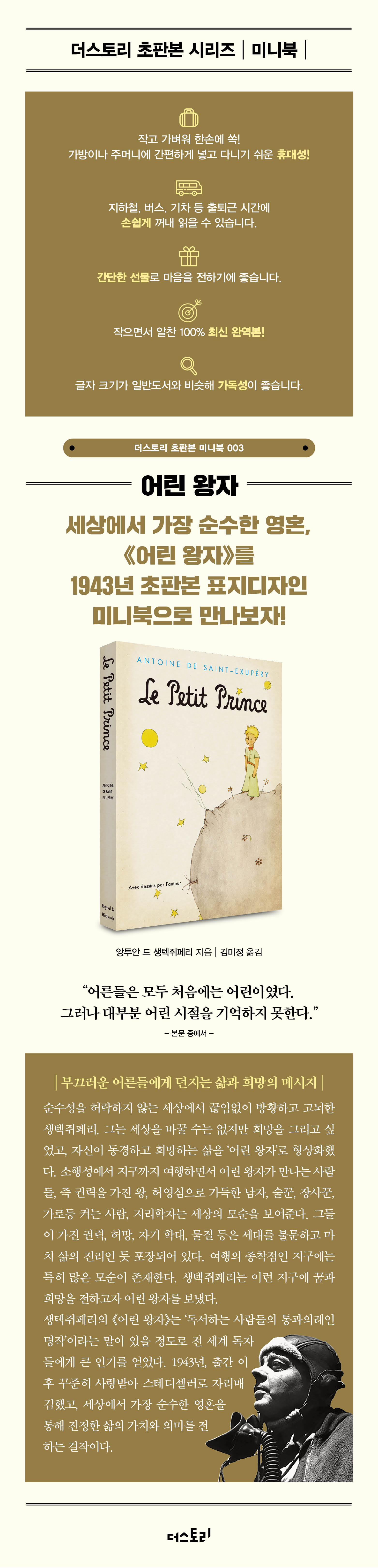 µµ¼ÃâÆÇ ´õ½ºÅ丮¿¡¼ Ãâ°£ÇÑ ¹Ì´ÏºÏ ÃÊÆÇº» ¡¶¾î¸° ¿ÕÀÚ¡·´Â 1943³â ´º¿å¿¡¼ ÃâÆÇµÈ ÇÁ¶û½º¾îÆÇ ÃÊÆÇº» Ç¥ÁöµðÀÚÀÎÀ» ±×´ë·Î µÇ»ì·È´Ù. ¾îµÓÁöµµ ³Ê¹« ºû¹Ù·¡Áöµµ ¾ÊÀº ³ë¶õ»ö Ç¥Áö¿Í ¾î¸° ¿ÕÀÚÀÇ ¿¬µÔºû ¿ÊÀÇ »ö°¨À» ÃÖ´ëÇÑ »ì·Á³Â°í, º»¹®¿¡´Â »ýÅØÁãÆä¸®ÀÇ Ä£ÇÊ »çÀÎÀÌ µé¾î ÀÖ´Ù. ¶ÇÇÑ ÀÛ°¡°¡ Á÷Á¢ ±×¸° ÀÏ·¯½ºÆ®µéÀÌ ½ÃÀûÀÌ°í ¾Æ¸§´Ù¿î ¾î¸° ¿ÕÀÚÀÇ À̾߱⸦ ´õ¿í dz¼ºÇÏ°Ô ¸¸µé¾îÁØ´Ù. ÇÑ ¼Õ¿¡ ÈÞ´ëÇϱ⠰£ÆíÇÑ ¹Ì´Ï »çÀÌÁî¿¡ ÇÕ¸®ÀûÀÎ °¡°ÝÀ¸·Î ´©±¸³ª ¼Õ½±°Ô »ç¼ ÀÐÀ» ¼ö ÀÖÀ» °ÍÀÌ´Ù.