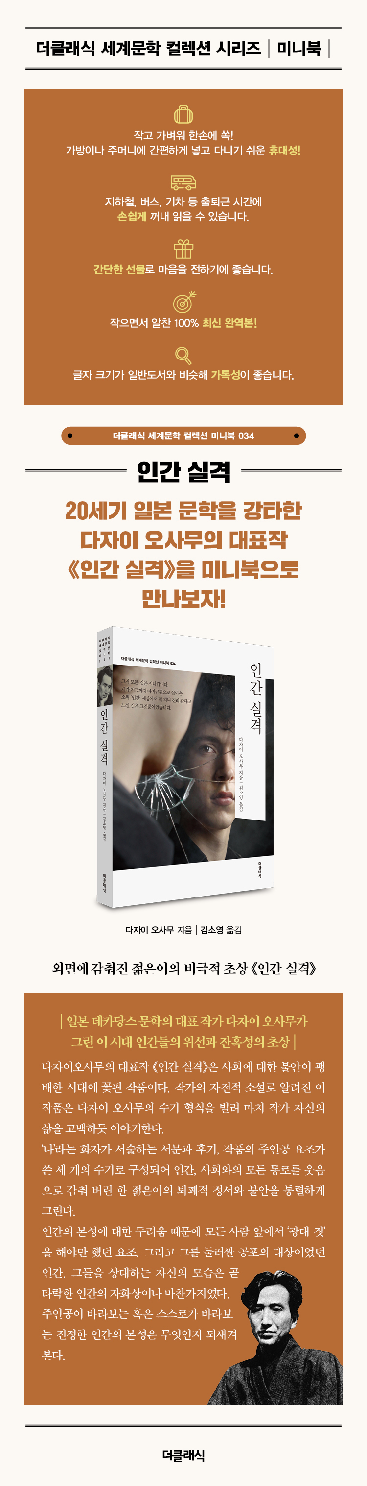 ´ÙÀÚÀÌ¿À»ç¹«ÀÇ ´ëÇ¥ÀÛ ¡¶Àΰ£ ½Ç°Ý¡·Àº »çȸ¿¡ ´ëÇÑ ºÒ¾ÈÀÌ ÆØ¹èÇÑ ½Ã´ë¿¡ ²ÉÇÉ ÀÛǰÀÌ´Ù. ÀÛ°¡ÀÇ ÀÚÀüÀû ¼Ò¼³·Î ¾Ë·ÁÁø ÀÌ ÀÛǰÀº ´ÙÀÚÀÌ ¿À»ç¹«ÀÇ ¼ö±â Çü½ÄÀ» ºô·Á ¸¶Ä¡ ÀÛ°¡ ÀÚ½ÅÀÇ »îÀ» °í¹éÇϵí À̾߱âÇÑ´Ù. ¡®³ª¡¯¶ó´Â ÈÀÚ°¡ ¼¼úÇÏ´Â ¼¹®°ú Èıâ, ÀÛǰÀÇ ÁÖÀΰø ¿äÁ¶°¡ ¾´ ¼¼ °³ÀÇ ¼ö±â·Î ±¸¼ºµÇ¾î Àΰ£, »çȸ¿ÍÀÇ ¸ðµç Åë·Î¸¦ ¿ôÀ½À¸·Î °¨Ãç ¹ö¸° ÇÑ ÀþÀºÀÌÀÇ ÅðÆóÀû Á¤¼¿Í ºÒ¾ÈÀ» Åë·ÄÇÏ°Ô ±×¸°´Ù. ¡®Àΰ£µé¡¯À» ÀÌÇØÇÒ ¼ö ¾ø¾úÀ¸³ª ±× ¼¼°è¿¡ µ¿ÈµÇ±â À§ÇØ ¡®ÀÍ»ì²Û¡¯À» ÀÚóÇß´ø ¿äÁ¶´Â °á±¹ ¡®Àΰ£ ½Ç°ÝÀÚ¡¯°¡ µÇ°í ¸¸´Ù. ¼Ò¿ÜµÈ ¿äÁ¶¸¦ ÅëÇØ Àΰ£ ¼¼»óÀÇ À§¼±°ú ÀÜȤ¼ºÀ» üÇèÇÏ°Ô ÇÏ´Â ¼öÀÛ! ¡®¿äÁ¶¡¯¸¦ ÅëÇØ ´©±¸³ª Àΰ£À̶ó¸é ÇѹøÂë ´À²¼À» ¸¸ÇÑ Àΰ£ ³»¸éÀÇ °¥µî, ¹ÏÁö ¸øÇÏ´Â Àΰ£ ¼¼»ó¿¡¼ °ú¿¬ Àΰ£´Ù¿î Àΰ£À̶õ ¹«¾ùÀΰ¡¿¡ ´ëÇØ ÀÚ¹®ÇØ º¼ ¼ö ÀÖ´Â ÀÛǰÀÌ´Ù.