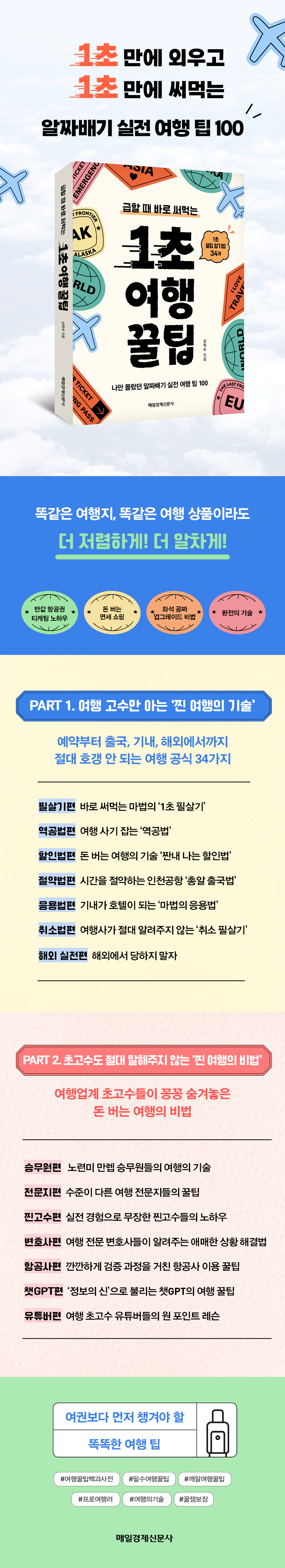 PART 1ÀÇ ¸ðµç ²ÜÆÁÀº ´õµµ ´úµµ ¸»°í µü 1ÃÊ¸é ¿Ü¿ï ¼ö ÀÖ´Â ¡®1ÃÊ ¾Ï±â¹ý¡¯ 34°³·Î °ø½ÄÈÇß´Ù. µ·°ú ½Ã°£À» Àý¾àÇÏ´Â ¿©ÇàÀÇ ±â¼úºÎÅÍ ¿©Çà»ç°¡ Àý´ë ¾Ë·ÁÁÖÁö ¾Ê´Â Ãë¼Ò ÇÊ»ì±â±îÁö. ½» º¸°í ¹Ù·Î ½á¸ÔÀ¸¸é µÈ´Ù. Àý´ë È£°» ¾È µÇ´Â ¿©Çà °ø½Ä 34°³, µü 1ÃÊ¸é ¿ÏÀü Á¤º¹ °¡´ÉÇÏ´Ù. PART 2¿¡´Â ½Â¹«¿ø, Ç×°ø»ç µî ¿©Çà ¾÷°è Ãʰí¼öµéÀ» ºñ·ÔÇØ °ûÆ©ºê, ¿µ¾Ë³² µî ¿©Çà ÀÎÇ÷ç¾ð¼µéÀÇ ²ÜÆÁÀ» Çѵ¥ ¸ð¾Ò´Ù. ½ÉÁö¾î ¡®Á¤º¸ÀÇ ½Å¡¯ êGPT°¡ ³»³õÀº ²ÜÆÁ±îÁö ÃѸÁ¶óÇß´Ù. ƯÈ÷ ºÐÀïÀÇ ¼ÒÁö°¡ ¸¹Àº ¾Ö¸ÅÇÑ »óȲ¿¡ ´ëÇØ¼´Â ¿©Çà Àü¹® º¯È£»çµéÀÌ ÁÖ´Â Á¶¾ð±îÁö ¾Æ³¦¾øÀÌ ´ã¾Ò´Ù. ¾ËÂ¥¹è±â ²ÜÆÁ¸¸ ²Ë ä¿î ½Ç¿ë¼´ä°Ô ºÎ·Ïµµ ³õÄ¡Áö ¾Ê¾Ò´Ù. ³ª¶óº° Àü¾ÐºÎÅÍ È¯Àü ÆÁ±îÁö, ¼¼°è ¾îµð¸¦ °¡µµ ´çȲÇÒ ÀÏ ¾ø´Â ¡®³ª¶óº° ¿©Çà ²ÜÆÁ¡¯Àº ÀØÁö ¸»°í ì°Ü°¡ÀÚ.
