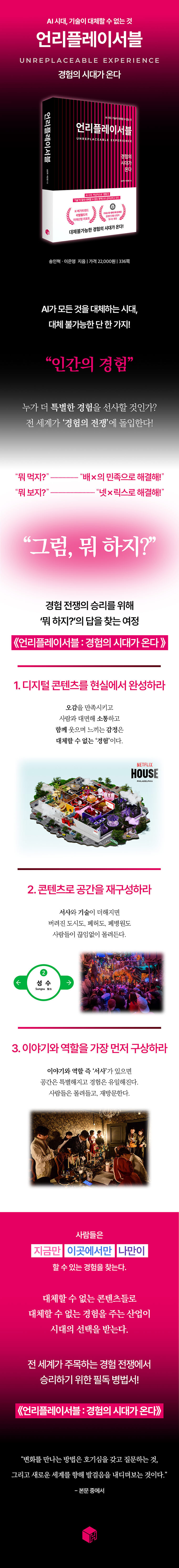Ã¥¼ÓÀ¸·Îp. 4 ÇÁ·Ñ·Î±×: Áú¹®ÀÇ º¯È¿¡ ¼û°ÜÁø ½Ã´ëÀÇ ´Ü¼¸¦ ã¾Æ¶ó ñé ¸ðµç °ÍÀÌ º¯ÇÏ´Â ½Ã´ë, ¼¼»ó¿¡ º¯ÇÏÁö ¾Ê´Â À¯ÀÏÇÑ Áø½ÇÀº ¡®¸ðµç °ÍÀÌ º¯ÇÑ´Ù¡¯´Â »ç½ÇÀ̶ó´Â ¸»ÀÌ ½Ç°¨ ³ª´Â ¿äÁòÀÌ´Ù. ¡¦ ¹æÇâÀÌ ¾Æ´Ï¶ó ÁöÁ¡¸¸À» »ìÇÇ´Â °ÍÀº °á±¹ ¡®°¢ÁÖ±¸°Ë(ʾñÇÏ´Ëü)¡¯ÀÏ»ÓÀÌ´Ù. ¾î¶»°Ô ÇØ¾ß ÇÒ±î? ÀÌ¿¡ ´ëÇØ ¸¹Àº ±â¾÷°¡µé°ú °æ¿µ»ç»ó°¡µéÀº °øÅëÀûÀ¸·Î ¸»ÇÑ´Ù. º¯ÈÀÇ ½Ã´ë¸¦ ÀÐ°í ½Í´Ù¸é »ç¶÷µéÀÇ ¡®Áú¹®¡¯À» ÁÖ¸ñÇ϶ó°í. p. 8 ÇÁ·Ñ·Î±×: Áú¹®ÀÇ º¯È¿¡ ¼û°ÜÁø ½Ã´ëÀÇ ´Ü¼¸¦ ã¾Æ¶ó ñé AI ½Ã´ë, ¿ª¼³ÀûÀ¸·Î °æÇèÀº ±â¼úÀÌ Àý´ë ´ëüÇÒ ¼ö ¾ø´Â ¿µ¿ªÀ¸·Î ±ÞºÎ»óÇϰí ÀÖ´Ù. °æÇèÀº ³ªÀÇ °¨Á¤, ³ªÀÇ ÀǽÄ, ³ªÀÇ Á¸Àç, ³ªÀÇ ¼¼°è°¡ »ç¶÷µé°ú ¿¬°áµÇ¾î ´À³¢´Â °ÍÀ¸·Î, ÀÌ´Â ½ÇÁ¸ÀÇ ¿µ¿ªÀ̱⠶§¹®ÀÌ´Ù. ¶§¹®¿¡ ¡°¿À´Ã ¹¹ ÇÏÁö?¡±ÀÇ ÁöÁ¡¿¡¼ ±âȸ¸¦ Æ÷ÂøÇÒ ¼ö ÀÖ´Ù. ¿ì¸®°¡ Á¢±ÙÇØ¾ß ÇÏ´Â °ÍÀº ¡®¿Ö Áú¹®µéÀÌ Áö±Ý ´ëµÎµÇ¾úÀ»±î?¡¯ÀÌ´Ù. ±× ¹°À½¿¡ ´äÇÏ´Â ¼ø°£, ¿ì¸®´Â ¹Ì·¡ÀÇ ±æ¸ñ¿¡ ¸ÕÀú µµÂøÇÏ°Ô µÈ´Ù. p. 20 Á¦1Àå °æÇè »ê¾÷ ½Ã´ë°¡ ¿Â´Ù ñé À̵éÀÌ µðÁöÅÐ ³Ê¸Ó·Î ÇâÇÏ´Â ÀÌÀ¯´Â ¸íÈ®ÇÏ´Ù. µðÁöÅзδ °¨°¢À» ´Ù ä¿ï ¼ö ¾ø±â ¶§¹®ÀÌ´Ù. ¼ÕÀ¸·Î ¸¸Áö°í, ¸öÀ¸·Î ´À³¢°í, ±Í·Î µè°í, ÇÔ²² ¿ô°í ¿ï ¼ö ÀÖ´Â °Í. ½ÇÀçÇÏ´Â °æÇ踸ÀÌ ÁÙ ¼ö ÀÖ´Â °¨Á¤Àû Ãæ¸¸ÇÔ. À̵éÀÌ ³îÀ̰ø¿ø, Àü½Ãȸ, ÆË¾÷½ºÅä¾î, üÇèÇü ÄÜÅÙÃ÷¿¡ ¿±¤ÇÏ´Â ÀÌÀ¯µµ ¿©±â¿¡ ÀÖ´Ù. ±×°ÍÀº ´ÜÁö ÄÜÅÙÃ÷¸¦ ¼ÒºñÇÏ´Â °ÍÀÌ ¾Æ´Ï¶ó, ÀڽŸ¸ÀÇ ¼»ç¸¦ ¸¸µé°í ±× ¼»ç¸¦ ½Ç½Ã°£À¸·Î ±â·ÏÇϰí ÀüÆÄÇÏ´Â ¡®Çö½Ç ¼ÓÀÇ ÆÛÆ÷¸Õ½º¡¯´Ù. pp. 46-47 Á¦1Àå °æÇè »ê¾÷ ½Ã´ë°¡ ¿Â´Ù ñé ±â¼úÀÌ Àΰ£ÀÇ »î ´ëºÎºÐÀ» ÀçÇöÇÏ°í ´ëüÇÒ ¼ö ÀÖ´Â ½Ã´ëÀϼö·Ï, ¿ÀÈ÷·Á ´õ¿í ºÐ¸íÇØÁö´Â »ç½ÇÀÌ ÀÖ´Ù. ±×°ÍÀº ±â¼úÀÌ ´êÀ» ¼ö ¾ø´Â °íÀ¯ÇÑ Àΰ£ÀÇ °¨Á¤ÀÌ Ç¥ÃâµÇ´Â ¡®°æÇ衯ÀÌ´Ù. ÀÌÁ¦ »ç¶÷µéÀº ´Ü¼øÈ÷ Á¦Ç°À» ¼ÒÀ¯Çϰųª Á¤º¸¸¦ ½ÀµæÇÏ´Â µ¥ ¸¸Á·ÇÏÁö ¾Ê°í, ¹«¾ð°¡¸¦ ¡®°æÇèÇÑ´Ù¡¯´Â ±× ÀÚü¿¡ ´õ Å« °¡Ä¡¸¦ µÐ´Ù. ±×¸®°í ±× °æÇèÀÌ ³ª¸¸ÀÇ ¼»ç¿Í ¿¬°áµÇ¾î ÀÖÀ» ¶§, ºñ·Î¼Ò ¿ì¸®´Â °¨Á¤ÀûÀ¸·Î ¿òÁ÷À̰í, ÇൿÇϸç, ±×°Í¿¡ ¸ôÀÔÇÑ´Ù. µû¶ó¼ AI¸¦ À§½ÃÇÑ ÃÖ±ÙÀÇ ¾öû³ ±â¼ú ¹ßÀüÀº »ý»ê¼ºÀÇ Çâ»ó, Àΰ£ ³ëµ¿·ÂÀÇ ´ëü¶ó´Â ±â´ÉÀûÀÎ °üÁ¡À¸·Î¸¸ º¼ °ÍÀÌ ¾Æ´Ï¶ó, »õ·Î¿î ¡®½Ã°£ÀÇ È®À塯 ±×¸®°í ±× ³Ê¸ÓÀÇ ¡®±âȸ¡¯·Î º¸¾Æ¾ß ÇÑ´Ù. ´õ ¸¹Àº ½Ã°£Àº ´õ ¸¹Àº °æÇèÀ» ÀǹÌÇϰí, ±× °æÇèÀ» ¹«¾ùÀ¸·Î ä¿ì´À³Ä°¡ »ê¾÷ÀÇ ¹Ì·¡¸¦ °áÁ¤Áþ´Â´Ù. ¶§¹®¿¡ ¿ì¸®´Â ´Ü¼øÈ÷ »ê¾÷ÀÌ ¹Ù²î´Â ÀüȯÁ¡¿¡ ¼ ÀÖ´Â °ÍÀÌ ¾Æ´Ï¶ó, Àΰ£ÀÇ º»ÁúÀû ¿å±¸°¡ »ê¾÷ÀÇ Áß½ÉÀÌ µÇ´Â ÁøÁ¤ÇÑ ¡®°æÇèÀÇ ½Ã´ë¡¯·Î ÁøÀÔÇÏ´Â ¼¸·¿¡ ¼ ÀÖ´Ù. p.93 Á¦2Àå µµ½Ã, ¼¼»ó¿¡¼ °¡Àå °Å´ëÇÑ Å׸¶ÆÄÅ©°¡ µÇ´Ù ñé µµ½Ã´Â »õ·Î¿î °æÇèÀÇ Ç÷§ÆûÀÌ µÉ ¼ö ÀÖ´Ù. ¹«¾ð°¡¸¦ ÆÈ±â À§ÇØ ¸ðÀÌ´Â Àå¼Ò°¡ ¾Æ´Ï¶ó, ¹«¾ð°¡¸¦ ÇÔ²² ¸¸µé¾î°¡°í °æÇèÇÏ´Â Àå¼Ò·Î¼ÀÇ µµ½Ã. ¸¶Ä¡ ¿¬±ØÃ³·³, °°Àº °¢º»ÀÌ¶óµµ ¹«´ë°¡ ´Ù¸£¸é ÀüÇô ´Ù¸¥ °¨Á¤ÀÌ µÇµí, µµ½Ã¶ó´Â ¹«´ë´Â ¹«ÇÑÇÑ º¯ÁÖ¸¦ ¸¸µé¾î³½´Ù. µµ½Ã´Â °ÇÃ๰ÀÇ ¹Ðµµ³ª ÇàÁ¤±¸¿ªÀÇ °æ°è¸¦ ³Ñ¾î¼±´Ù. µµ½Ã´Â »ç¶÷µéÀÌ ¸ðÀ̰í Èð¾îÁö°í À̾߱⸦ ¸¸µé°í °æÇèÀ» ½×´Â ÀåÀÌ´Ù. ±×·¸´Ù¸é ¿ì¸®´Â µµ½Ã¸¦ ¾î¶»°Ô ¾µ °ÍÀΰ¡? µµ½Ã Àüü¸¦ Ç÷¹À̱׶ó¿îµå·Î »ïÀ» ¶§, ¿ì¸®ÀÇ ÀÏ»óÀº ¸ðÇèÀÌ µÈ´Ù. ±×¸®ÇÏ¿© µµ½Ã´Â °¡Àå Àç¹Õ´Â °ÔÀÓÀÇ ¹«´ë°¡ µÈ´Ù. p.96 Á¦2Àå µµ½Ã, ¼¼»ó¿¡¼ °¡Àå °Å´ëÇÑ Å׸¶ÆÄÅ©°¡ µÇ´Ù ñé ÇÇÁöÅÐ ½Ã´ë°¡ µÇ¸é¼ ÀÌÁ¦´Â ¹°¸®ÀûÀÎ °ø°£ÀÌ ÄÜÅÙÃ÷¿¡ ÀÇÇØ ÀçÁ¤Àǵǰí ÀÖ´Ù. °°Àº ¸éÀûÀÌ¶óµµ ¾î¶² ÄÜÅÙÃ÷°¡ ä¿öÁ® ÀÖ´À³Ä¿¡ µû¶ó ¹æ¹®ÀÚÀÇ Ã¼·ù ½Ã°£°ú ¸¸Á·µµ, ±â¾ïÀÇ ¹Ðµµ°¡ ´Þ¶óÁø´Ù. ÀÌ´Â ¹°¸®Àû °ø°£ÀÌ ´õ ÀÌ»ó °íÁ¤µÈ Àǹ̸¦ °®Áö ¾ÊÀ¸¸ç, ÄÜÅÙÃ÷°¡ °ø°£À» ±ÔÁ¤ÇÏ´Â ½Ã´ë°¡ µµ·¡ÇßÀ½À» ¶æÇÑ´Ù. p.146 Á¦3Àå ÄÜÅÙÃ÷ÀÇ ¹Ì·¡ ñé Áö±Ý, ÄÜÅÙÃ÷´Â ±× ƲÀ» ±ú°í ÀÖ´Ù. ½ºÅ©¸° ¾È¿¡ °¤Çû´ø ¼¼°è°¡ ½ºÅ©¸° ¹Ù±ùÀ¸·Î Èê·¯³ª¿À°í ÀÖ´Ù. ´õ ÀÌ»ó È¥ÀÚ º¸´Â ¿µÈ, È¥ÀÚ Ç÷¹ÀÌÇÏ´Â °ÔÀÓÀÌ ¾Æ´Ï´Ù. ÀÌÁ¦ ÄÜÅÙÃ÷´Â ÇÔ²² ¿òÁ÷À̰í ÇÔ²² È£ÈíÇÏ¸ç »ì¾Æ ÀÖ´Â °æÇèÀ¸·Î ÁøÈÇÏ´Â ÁßÀÌ´Ù. ÄÜÅÙÃ÷´Â ÀÌÁ¦ °ø°£À» °®´Â´Ù. ¸öÀ¸·Î ºÎµúÄ¡°í, Á÷Á¢ ¼±