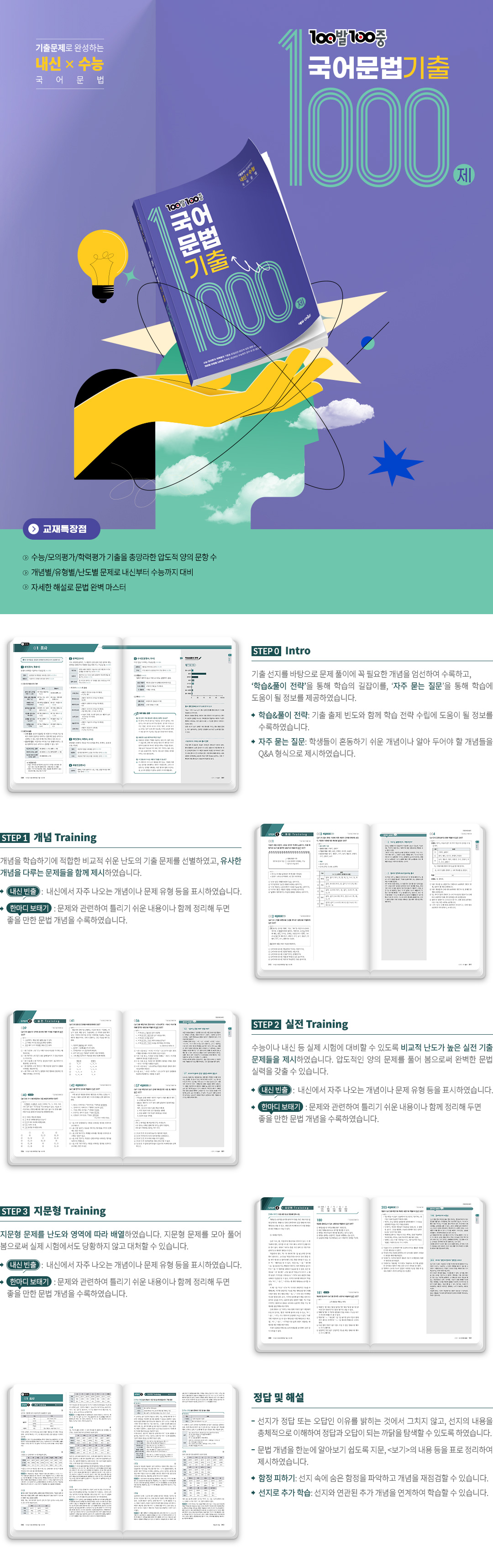 Ã¥¼Ò°³1000¹®Ç×ÀÇ ±âÃâ ¹®Á¦¸¦ ÅëÇØ ±¹¾î ¹®¹ýÀ» ¿Ïº®ÇÏ°Ô ¸¶½ºÅÍÇÒ ¼ö ÀÖ´Â ½ÇÀü¼ÀÌ´Ù. ¼ö´É/¸ðÀÇÆò°¡/ÇÐ·ÂÆò°¡¿¡¼ °¢ °³³ä¿¡ ¸Â´Â ±âÃâ ¹®Á¦¸¦ À¯Çüº°, ³µµº°·Î Á¤¸®ÇÏ¿© Á¦½ÃÇÏ¿´´Ù. ¹®Á¦¸¦ Ç®±â Àü¿¡ ±âÃâ ¼±Áö¸¦ Åä´ë·Î ÇÑ ÇÙ½É °³³ä°ú ¹®Á¦ Ç®ÀÌ Àü·«À» ÇнÀÇÑ ÈÄ ºñ±³Àû ³µµ°¡ ³·Àº °³³ä ÈÆ·Ã ±âÃâ ¹®Á¦¸¦ Ç®¸é¼ ¾Õ¼ ÇнÀÇÑ °³³äÀ» Àû¿ëÇÒ ¼ö ÀÖ´Ù. ±×¸®°í ºñ±³Àû ³µµ°¡ ³ôÀº ½ÇÀü ±âÃâ ¹®Á¦¸¦ Ǭ ÈÄ¿¡ Áö¹®Çü ¹®Á¦¸¦ µû·Î ¸ð¾Æ Ç®¸é¼ Áö¹®Çü ¹®Á¦ ÇØ°á ´É·ÂÀ» ±â¸¦ ¼ö ÀÖ´Ù.
