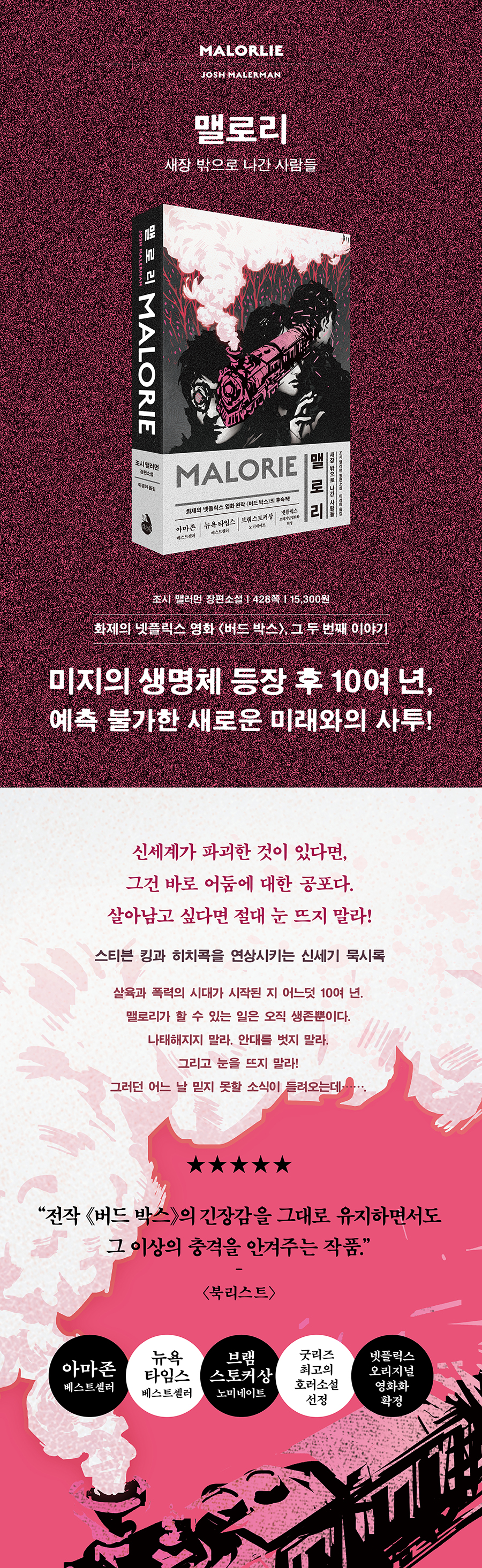 ÀηùÀÇ ÀûÀ» ¾ø¾Ö´Â °ÍÀÌ ¾Æ´Ï¶ó ±×°Íµé°ú °øÁ¸ÇÒ ¼ö¹Û¿¡ ¾ø´Â Çö½ÇÀ» ¹Þ¾ÆµéÀ̰í, ¼¼»ó°ú ÈÇØÇÏ°í °¥µîÀ» ÇØ¼ÒÇØ°¡´Â °úÁ¤°ú ÁøÅëÀ» ±×¸° ¡¶¸È·Î¸®¡·´Â SF/È£·¯/¼½ºÆæ½º ½º¸±·¯ÀÌÀÚ, 10´ë ¾ÆÀ̵éÀÇ ¼ºÀå ¿©Á¤À» ´Ù·é ¼ºÀå¼Ò¼³ÀÌÀÚ, ºÒ°¡´É¿¡ µµÀüÇÏ´Â ÀηùÀÇ µµÀü°ú ¸ðÇèÀ» ±×¸° ¸ðÇè ¼Ò¼³·Îµµ ÀÐÈù´Ù. ¹Ì±¹ÀÇ ÁÖ¿ä Àϰ£Áö ¡´¿ö½ÌÅÏ Æ÷½ºÆ®¡µ´Â ¡®°¡Á· µå¶ó¸¶, ·Îµå ¼Ò¼³, ÃÊÀÚ¿¬ ½º¸±·¯ µî ´Ù¾çÇÑ ¿ä¼ÒµéÀÌ Ã¥ ¼Ó Àι°µé°ú ±×µéÀÇ Èûµç »î°ú ÇÔ²² Á¶È¸¦ ÀÌ·é ÀÛǰ¡¯À̶ó È£ÆòÇß´Ù. 2020³â ¼¼°è ÃÖ´ëÀÇ ¼Æò »çÀÌÆ® ¡®±Â¸®Á¿¡¼ ÃÖ°íÀÇ È£·¯¼Ò¼³ Áß ÇÑ ±ÇÀ¸·Î ¼±Á¤ÇßÀ¸¸ç, ºê·¥ ½ºÅäÄ¿ »ó¿¡ ³ë¹Ì³×ÀÌÆ®µÇ¾ú´Ù. ÇöÀç ³ÝÇø¯½º¿¡¼ ¿µÈ ¡´¹öµå ¹Ú½º¡µÀÇ ÈļӯíÀ¸·Î ¿À¸®Áö³Î ¿µÈȸ¦ È®Á¤Çß´Ù.