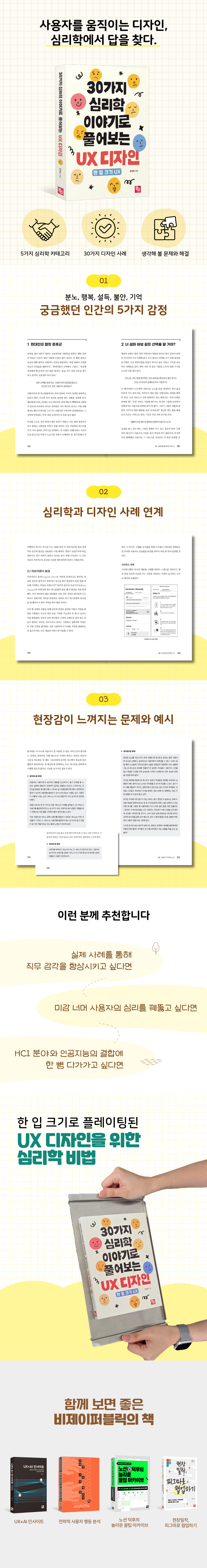 ¡º30°¡Áö ½É¸®ÇÐ À̾߱â·Î Ç®¾îº¸´Â UX µðÀÚÀΡ»¿¡¼´Â Àΰ£ÀÇ °¨Á¤°ú ÇൿÀ» ºÐ³ë, Çູ, ¼³µæ, ºÒ¾È, ±â¾ïÀ̶ó´Â ´Ù¼¸ °¡Áö Ä«Å×°í¸®·Î ³ª´©¾î ¼ºñ½º »ç·Ê¿Í ÇÔ²² ¿«½À´Ï´Ù. ±×¸®°í ´Ù¾çÇÑ »óȲ°ú ¿¹½Ã¸¦ ÅëÇØ ÇöÀå°¨¿¡ ¸ôÀÔÇÏ¿© µÎ °¡Áö Çй®À» Á¢¸ñÇØº¼ ¼ö ÀÖµµ·Ï µ½½À´Ï´Ù. µµ±¸ÀÇ »ç¿ë¹ýÀÌ ¾Æ´Ñ UX µðÀÚÀÎÀÇ º»ÁúÀ» ޱ¸ÇÏ¸ç ¾î¶² ¹é±×¶ó¿îµå¿¡¼µµ ¼ºñ½º ¹× ÇÁ·Î´öÆ®¿Í Àΰ£ ½É¸®¸¦ ¿«¾î³»¾î Àû¿ëÇÒ ¼ö ÀÖµµ·Ï ÇÙ½ÉÀ» ²ç¶Õ½À´Ï´Ù. ÀÌ Ã¥°ú ÇÔ²² ÀÏ»óÀûÀÎ »ç·Ê·Î ½±°Ô, ÇÏÁö¸¸ »ç¿ëÀÚÀÇ ½ÉÃþ±îÁö ÅëÂûÇÒ ¸¸Å ±í°Ô »ç¿ëÀÚ °æÇèÀ» À§ÇÑ ½É¸®Çп¡ ´ëÇØ °íÂûÇØº¾½Ã´Ù.