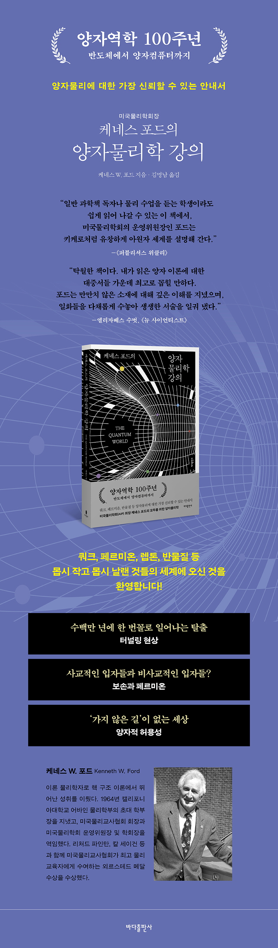 Æ÷µå´Â ¸®Ã³µå ÆÄÀθÕ, Ä® ¼¼À̰ǰú ÇÔ²² ¹Ì±¹ ÃÖ°íÀÇ ¹°¸®±³À°ÀÚ¿¡°Ô ¼ö¿©ÇÏ´Â ¿Ü¸£½ºÅ×µå ¸Þ´ÞÀ» ¼ö¿©¹Þ±âµµ ÇÏ¿´´Ù. ͏®Æ÷´Ï¾Æ ´ëÇб³ ¾î¹ÙÀÎ, º¸½ºÅÏ ´ëÇб³ µî¿¡¼ ±³¼ö¸¦ ¿ªÀÓÇÏ°í ´º¸ß½ÃÄÚ °ø°ú´ëÇÐ ÇÐÀå, ¹Ì±¹¹°¸®±³»çÇùȸ(AAPT) ȸÀå, ¹Ì±¹¹°¸®ÇÐȸ(AIP) ÇÐȸÀå µîÀÇ ±½Á÷ÇÑ ¿äÁ÷À» °ÅÄ£ µÚ, Æ÷µå´Â ÀÚ½ÅÀÇ ¸¶Áö¸· ÀÌ·ÂÀ¸·Î ¹Ì·¡ÀÇ ¾ÆÀν´Å¸ÀÎ, ÆÄÀθÕÀÌ µÉ ÀþÀºÀ̵éÀ» °¡¸£Ä¡°í ÁýÇÊ¿¡ Àü³äÇÏ´Â ±æÀ» ÅÃÇß´Ù. ÀÌ Ã¥Àº ¹Ù·Î ÀÌ·± ÇлýµéÀ» ´ë»óÀ¸·Î °ÀÇÇÑ ³»¿ëÀ» ¹Àº °ÍÀ¸·Î, ¾î·Æ´Ù°í ÇÇÇØ °¡Áö ¾Ê°í Â÷±ÙÂ÷±Ù ¼³¸íÇÏ´Â ¿¬·û°ú ÁöÇý°¡ ºû³´Ù. Á¦Àڵ鿡°Ô ¹Ì¸® ÀÐÇô µ¶ÀÚµéÀÇ ´«³ôÀ̸¦ ¼¼½ÉÇÏ°Ô ¸ÂÃß¾úÀ¸¸ç, ¾Æ³¦¾ø´Â ¼º¿øÀ» º¸³½ µ¿·á ±³»çµéÀÇ Ãæ°íµµ ÀØÁö ¾Ê¾Ò´Ù. ¾çÀÚ ¼¼°èÀÇ ÁÖ¿äÇÑ °³³äµéÀ» ¸ÕÀú ¼³¸íÇϰí, Áö±Ý±îÁö ¹°¸®ÇÐÀÚµéÀÌ ¹ß°ßÇÑ ÀÔÀÚ °¡Á·µéÀ» ¼Ò°³Çϸç, ¾çÀÚ À̷п¡ ´ëÇÑ º¹½À ¹®Á¦¿Í µµÀü ¹®Á¦·Î ÀÌÇØ Á¤µµ¸¦ ¤¾î º¸°Ô ÇÏ´Â ¸¶Áö¸· Àå¿¡ À̸£±â±îÁö, µ¶ÀÚµéÀº °÷°÷¿¡ ½º¸çµç ÀúÀÚÀÇ ¼Õ±æÀ» ´À³¥ ¼ö ÀÖÀ» °ÍÀÌ´Ù.