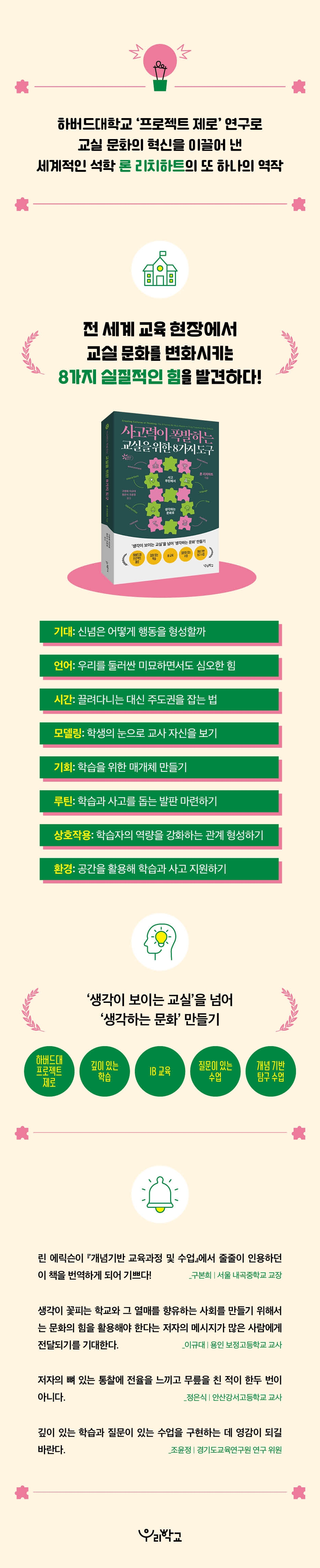 Áý´ÜÀÌ Ã³ÇÑ ¾î¶² ¸Æ¶ô¿¡¼µçÁö ¹®ÈÀû ÈûÀÇ Á¸À縦 ÀνÄÇÏ¸é ¿¹ºñ ±³»ç¿Í ¼÷·ÃµÈ ±³»ç ¸ðµÎ ¹®È¸¦ Çü¼ºÇÏ´Â µ¥ º¸´Ù Àû±ØÀûÀÎ ¿ªÇÒÀ» ÇÒ ¼ö ÀÖ´Ù. ±×·¸°Ô ÇÒ ¶§ ¿ì¸®´Â °¡¸£Ä§À» ´Ü¼øÇÑ Áö½Ä Àü´Þ·Î º¸´Â °üÁ¡¿¡¼ ¹þ¾î³¯ °ÍÀ̰í, ±³À°°úÁ¤ÀÌ »ì¾Æ ¼û ½¬´Â »ç°í¿Í ÇнÀÀÇ ¹®È¸¦ âÁ¶ÇÏ´Â ¹æÇâÀ¸·Î ³ª¾Æ°¥ ¼ö ÀÖÀ» °ÍÀÌ´Ù._27ÂÊ ´Ù¾çÇÑ ¾îÈÖ°¡ ¾²ÀÌ°í Æ¯¼ºÀÌ Á¶±Ý¾¿ ´Ù¸£°Ô ÇØ¼®µÇ±â´Â ÇÏÁö¸¸, °á°úÀûÀ¸·Î µå·¯³ª´Â °ÍÀº ¼ÒÅëÇϰí Çõ½ÅÇϸç Çù·ÂÇÏ°í ¹®Á¦¸¦ ÇØ°áÇÒ ¼ö ÀÖ´Â, Àû±ØÀûÀÌ°í ´Éµ¿ÀûÀÎ »ç°í·ÂÀ» °®Ãá Çлý»óÀÌ´Ù. ¿ì¸®´Â °³º°ÀûÀÎ Áö½ÄÀÇ ÁýÇÕÀÌ ¾Æ´Ï¶ó ÇнÀ¿¡ µ¿±â¸¦ ºÎ¿©Çϰí À¯¿ëÇÑ Áö½ÄÀÇ Ã¢Ãâ·Î À̾îÁö´Â ±¤¹üÀ§ÇÑ Æ¯¼ºÀ» ¹ß´Þ½ÃŰ´Â ÀÏÀ» °¡Àå Áß¿äÇÏ°Ô ¿©°Ü¾ß ÇÑ´Ù. _37ÂÊ »ç°í ¾ð¾î´Â °èȹÀ» ÇÒ ¶§»Ó¸¸ ¾Æ´Ï¶ó ¼ºÂûÇÏ´Â µ¥ ¸ÞŸ ÀÎÁö¸¦ »ç¿ëÇÒ ¶§µµ µµ¿òÀ» ÁØ´Ù. »ç°í¿¡ ´ëÇØ »ý°¢ÇÒ ¶§, ¿ì¸®´Â Çß´ø ÀÏÀ̳ª »ç°íÀÇ °á°ú¸¦ µ¹¾Æº¼ »Ó ¾Æ´Ï¶ó ¿ì¸®°¡ »ç¿ëÇ߰ųª »ç¿ëÇÏÁö ¾ÊÀº °úÁ¤À» °ËÅäÇÏ°Ô µÈ´Ù. »ç°í ¾ð¾î´Â »ç°í °úÁ¤À» ºÐ¼®ÇÏ´Â µ¥ µµ¿òÀ» ÁØ´Ù. ±×·¯³ª ¸ÞŸ ÀÎÁö´Â ´Ü¼øÈ÷ µÇµ¹¾Æº¸´Â ÀÏÀÌ ¾Æ´Ï´Ù. »ç¶÷ÀÇ »ç°í¸¦ Áö¼ÓÀûÀ¸·Î °üÂûÇϰí Áö½ÃÇÏ´Â ÀÏÀ̱⵵ ÇÏ´Ù._119ÂÊ ¿ì¸®°¡ ½Ã°£À» ´Ü¼øÈ÷ ä¿ö ³Ö¾î¾ß ÇÒ ÇÏ·çÀÇ ´ÜÀ§·Î º¸´Â °ÍÀÌ ¾Æ´Ï¶ó ¹«¾ùÀ» °¡Ä¡ ÀÖ°Ô ¿©±â´ÂÁö¸¦ µå·¯³»°í ÇлýµéÀÇ ÇнÀÀ» Çü¼ºÇÏ´Â ¹®ÈÀû ÈûÀ¸·Î ¹Ù¶óº¼ ¶§, ½Ã°£¿¡ ´ëÇÑ ÆÐ·¯´ÙÀÓÀÇ ÀüȯÀÌ ½ÃÀ۵ȴÙ. À̶§ ±³»ç¿Í Çлý ¸ðµÎÀÇ »ç°í¸¦ ÁöÁöÇÏ´Â ¹æÇâÀ¸·Î ½Ã°£À» ¹èÄ¡Çϰí Ȱ¿ëÇÏ´Â °ÍÀÌ Áß¿äÇÏ´Ù. Áï ½Ã°£Ç¥³ª Áøµµ¿¡ ¸ÅÀÌÁö ¾Ê°í, ¼ö¾÷ ¼Ó¿¡¼ ¹Ýµå½Ã ÀϾ¾ß ÇÏ´Â ÇнÀ°ú »ç°í¿¡ ÁýÁßÇÒ ¼ö ÀÖµµ·Ï ¿ì¼±¼øÀ§¸¦ ¸íÈ®È÷ ÇÏ´Â °ÍÀÌ´Ù. ½Ã°£ÀÇ º»Áú¿¡ ´ëÇÑ ÀÌÇØ¸¦ ¹ÙÅÁÀ¸·Î ¿ì¸®´Â Çлýµé¿¡°Ô »ý°¢ÇÒ ½Ã°£À» º¸ÀåÇϰí, ¼ö¾÷ ¼Ó¿¡ Ȱµ¿ÀûÀ̰í Âü¿©ÀûÀÎ ÇнÀ ½Ã°£À» °¡´ÉÇÑ ÇÑ ¸¹ÀÌ ¸¸µé°í, Çбâ ÃʹݺÎÅÍ ÇÙ½ÉÀûÀÎ ½Çõ¿¡ ½Ã°£À» ÅõÀÚÇØ »ý°¢ÇÏ´Â ¹®È¸¦ ±¸ÃàÇϰí, ÇнÀ¿¡ ÇÊ¿äÇÑ ¿¡³ÊÁö¸¦ Ű¿ì¸ç ȸº¹ÇÏ´Â ³ë·Â¿¡ ´õ¿í Àڽۨ ÀÖ°í È¿°úÀûÀ¸·Î ÀÓÇÒ ¼ö ÀÖ°Ô µÈ´Ù._184ÂÊ ¿ì¸®´Â »õ·Î¿î ´ã·Ð ÆÐÅÏÀ» ¸¸µé°í, ÇнÀÀ» ±¸Á¶ÈÇÏ´Â ¿ªÇÒÀ» Çлýµé¿¡°Ô ºÎ¿©Çϸç, ÁÁÀº Áú¹®À» ´øÁüÀ¸·Î½á ±³½Ç ³» »óÈ£ÀÛ¿ëÀ» Å©°Ô º¯È½Ãų ¼ö ÀÖ´Ù. ÀÌ·¯ÇÑ ½ÇõÀº ÇлýµéÀ» ÅëÁ¦ÇÏ·Á ÇÏÁö ¾Ê°í ±×µéÀ» ÀÚÀ²ÀûÀÎ ÇнÀÀÚ·Î ¼ºÀå½ÃŰ·Á´Â ºÐÀ§±â¿¡¼ ´õ¿í °·ÂÇÑ È¿°ú¸¦ ¹ßÈÖÇÑ´Ù. ¶ÇÇÑ ÀÌ ¸ñÇ¥´Â ´õ ³ÐÀº ¸Æ¶ô ¼Ó¿¡ ÀÚ¸® Àâ°í ÀÖ´Ù. ÇлýµéÀÌ ÁøÁ¤À¸·Î »ç¶û¹Þ°í Á¸Áß¹Þ´Â ºÐÀ§±â¿¡¼¸¸ ´Þ¼ºµÉ ¼ö ÀÖ´Ù._363ÂÊ ¡®»ý°¢ÇÏ´Â ¹®È¡¯´Â ´Ü¼øÈ÷ ½ÇÇàÇÒ ¼ö ÀÖ´Â ÇÁ·Î±×·¥ÀÌ ¾Æ´Ï±â ¶§¹®¿¡ ÀÏȸ¼º Á¢±ÙÀ¸·Î´Â ½ÇÇöÇÒ ¼ö ¾ø´Ù. ±×·³¿¡µµ ¾î¶² Çб³µéÀº »ý°¢ÇÏ´Â ¹®È¸¦ ±¸ÃàÇÏ´Â µµ±¸µé, ¿¹¸¦ µé¾î »ç°í ·çƾÀÇ È°¿ë¿¡¸¸ ÁýÁßÇÏ´Ù°¡ ªÀº ¼Ò°³¿Í ¸î Â÷·Ê ¼º°øÀûÀÎ ½ÇÇà ÀÌÈÄ ¸ØÃß°í ¸¸´Ù. ±×·¯³ª »ý°¢ÇÏ´Â ¹®È¸¦ ¸¸µé¾î °¡´Â ÀÏÀº Áö¼ÓÀûÀÎ °úÁ¤À¸·Î ÀÌÇØµÇ¾î¾ß Çϸç, »ç°í ·çƾÀ» »ç¿ëÇÔÀ¸·Î½á ½ÃÀÛÇÒ ¼ö´Â ÀÖÁö¸¸ °Å±â¼ ¸ØÃßÁö ¾Ê¾Æ¾ß ÇÑ´Ù._417ÂÊ ÃâÆÇ»ç ¼ÆòÇϹöµå ±³À°´ëÇпø ¡®ÇÁ·ÎÁ§Æ® Á¦·Î¡¯ ¿¬±¸·Î
