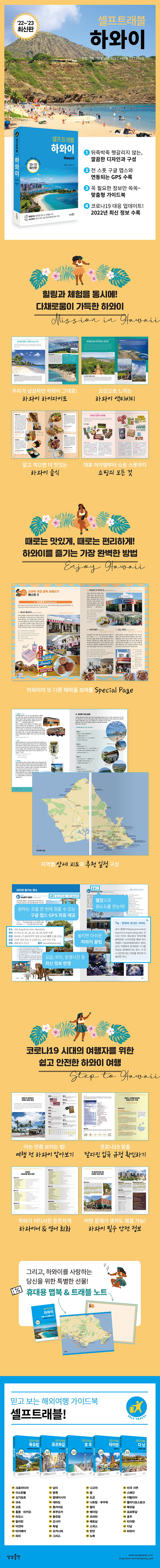 ¡º¼¿ÇÁÆ®·¡ºí¡»Àº ¿©ÇàÁöÀÇ º¼°Å¸®, ¸Ô°Å¸®, ¼îÇÎ ¼ó, ¼÷¼Ò µî ½ºÆýº° ¿©Çà Á¤º¸¸¦ ÇöÁö °¡À̵åó·³ Ä£ÀýÇÏ°Ô ¼Ò°³ÇÏ´Â ÇØ¿Ü¿©Çà °¡À̵åºÏ ½Ã¸®Áî´Ù. ƯÈ÷ ¡ºÇÏ¿ÍÀÌ ¼¿ÇÁÆ®·¡ºí¡»Àº ¡®¹Ï°í º¸´Â ÇØ¿Ü¿©Çà °¡À̵åºÏ¡¯À̶ó´Â ijġÇÁ·¹ÀÌÁî ¾Æ·¡ ¿©ÇàÀÇ ¼³·½À» ¾È°ÜÁÙ ´Ù¾çÇÑ ÇÏ¿ÍÀÌÀÇ Ç³°æ »çÁø°ú Áöµµ, ÃֽŠÁ¤º¸, ¹®È À̾߱⸦ ¸ðµÎ ´ã¾Æ ±¸¼ºÇß´Ù. µ¶ÀÚµéÀÌ ¿øÇÏ´Â °ÍÀÌ ¹«¾ùÀÎÁö °í¹Î ³¡¿¡ ¹«ÀÛÁ¤ ¸¹Àº Á¤º¸¸¦ Àü´ÞÇϱ⺸´Ù´Â ÇÏ¿ÍÀÌ ¿©ÇàÀÌ Ã³À½ÀÎ »ç¶÷µµ °ÆÁ¤ ¾øÀÌ, ºÎ´ã ¾øÀÌ ¿©ÇàÇÒ ¼ö ÀÖµµ·Ï ÇÙ½É Á¤º¸¸¸ ²Ä²ÄÇÏ°Ô Ãß·Á ´ã¾Ò´Ù. ¡ºÇÏ¿ÍÀÌ ¼¿ÇÁÆ®·¡ºí¡» ÇÑ ±ÇÀ¸·Î Áñ°Ì°í, µçµçÇÏ°Ô ¿©ÇàÀ» ÁغñÇØº¸ÀÚ.
