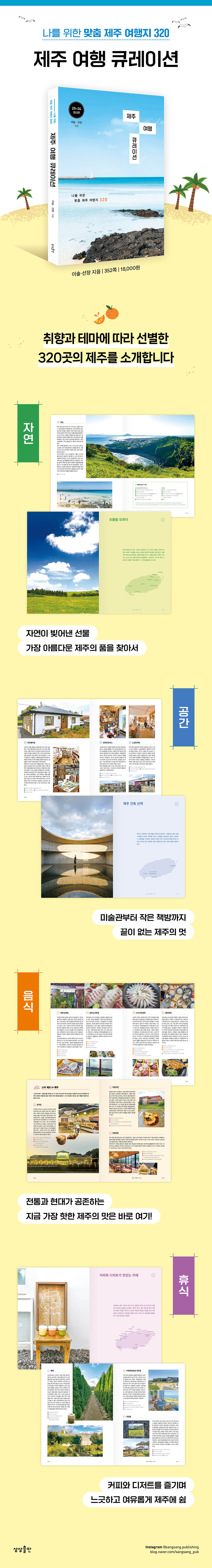 ¡ºÁ¦ÁÖ ¿©Çà Å¥·¹À̼ǡ»Àº ¹Ì¼ú°ü Å¥·¹ÀÌÅͰ¡ ÀÛǰÀ» ¼±Á¤ÇÏµí ¿©Çà ÀÛ°¡µéÀÌ Á¦ÁÖÀÇ ¸í¼Ò, ¸ÀÁý, Ä«Æä, ¼÷¼Ò µîÀ» ²Å¾Ò´Ù. Á¦ÁÖ¸¦ ´ëÇ¥ÇÏ´Â ÀÚ¿¬, °ø°£, À½½Ä, ÈÞ½ÄÀ̶õ Å׸¶¸¦ ÅëÇØ 320¿© °÷ÀÇ ½ºÆýÀ» ÃëÇâ´ë·Î ³ª´©¾î º¸±â ½±°Ô ´ã¾Æ³Â´Ù. ¡®¿ª»ç¡¯³ª ¡®ÀÛÀº ¸¶À»¡¯À» ÁÖÁ¦·Î ÇÑ ºÎºÐ¿¡¼± Àι®ÇÐÀû ±íÀ̱îÁö ´À²¸Áø´Ù. °È±â ¿©ÇàÀ» ÁÁ¾ÆÇÏ´Â ¿©ÇàÀÚ¸¦ À§ÇÑ ¿Ã·¹ ÄÚ½º Áöµµµµ »©³õÁö ¾Ê¾Ò´Ù. µå¶ó¸¶¿¡ µîÀåÇÑ ¸í¼Ò, ½ºÅ¸ ¼ÎÇÁµéÀÇ ¸ÀÁý, »çÀå´ÔÀ¸·Î º¯½ÅÇÑ ¿¬¿¹ÀεéÀÇ Àα⠽ºÆý µîÀº ½ºÆä¼È ÆäÀÌÁö·Î ±¸¼ºÇß´Ù. ÀÌ Ã¥Àº ±âÁ¸ÀÇ °¡À̵åºÏó·³ ÀÌ¹Ì ¿Ï¼ºµÈ ¿©Çà ÄÚ½º¸¦ Á¦½ÃÇÏÁö ¾Ê´Â´Ù. ÀÛ°¡ÀÇ Å¥·¹ÀÌÆÃ ¿Ü¿¡ ¿©ÇàÀÚ°¡ Á÷Á¢ ¼±º°ÇÏ´Â ÀÛ¾÷ ¶ÇÇÑ Áß¿ä Æ÷ÀÎÆ®À̱⠶§¹®ÀÌ´Ù. ´õÇϱ⺸´Ù ´ú¾î³»±â¸¦ ÅëÇØ ÃëÇâ°ú ¸ñÀû¿¡ ¸Â´Â ³ª¸¸ÀÇ ¿Ïº®ÇÑ Á¦ÁÖ ¿©ÇàÀ» °èÈ¹ÇØ º¸ÀÚ.