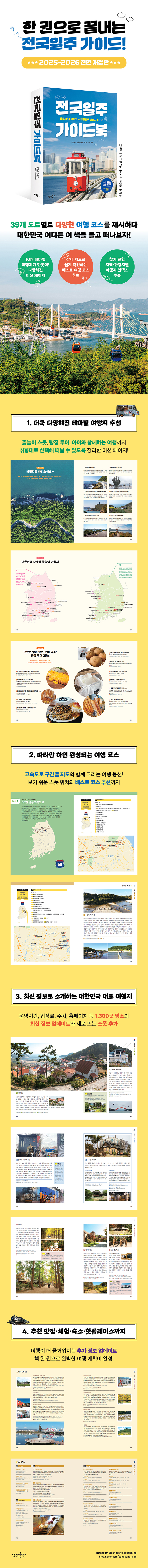 ÀÌ Ã¥Àº °í¼Óµµ·Î¸¦ ºüÁ®³ª¿À¸é¼ºÎÅÍ ÃÖ´ëÇÑ ¸¹Àº °÷À» µ¹¾Æº¼ ¼ö ÀÖµµ·Ï Â¥¿©, Ãßõ ÄÚ½º¸¸ ¹â¾Æµµ ´ëÇ¥ ¿©ÇàÁö ¿Ü ÁÖº¯ ¸í¼Ò±îÁö ¸ðµÎ µÑ·¯º¼ ¼ö ÀÖ´Ù. ¡´Travel Point¡µ¿¡¼´Â °¢ ¸í¼ÒÀÇ ¿ª»ç¿Í Ư¡, ÇÔ²² µ¹¾Æº¸¸é ÁÁÀº ½ºÆý±îÁö µÎ·ç ¼Ò°³ÇÑ´Ù. ³»ºñ°ÔÀÌ¼Ç ÁÖ¼Ò¿Í ÀüȹøÈ£, ¿î¿µ½Ã°£, ÀÔÀå ¿ä±Ý, ÁÖÂ÷ºñ, ȨÆäÀÌÁö µî ±âº» Á¤º¸¿Í ÇÔ²² ³õÄ¡¸é ¾Æ½¬¿ï ¿©Çà ÆÁ±îÁö È®ÀÎÇÒ ¼ö ÀÖ´Ù. Ưº°È÷ À̹ø °³Á¤ÆÇÀº 2025³â 3¿ùÀ» ±âÁØÀ¸·Î ½ºÆýÀÇ Á¤º¸¸¦ ¾÷µ¥ÀÌÆ®Çß´Ù. Äڷγª ÀÌÈÄ Æó¾÷Çϰųª ¿î¿µ Á¤º¸°¡ ´Þ¶óÁø ½ºÆýÀÌ ¸¹À¸´Ï, ²À Ã¥À» È®ÀÎÇØ ¿©Çà °èȹÀ» ¼¼¿ìÀÚ. ÀÌ¾î¼ ³ª¿À´Â ¡´More&More¡µ¿¡´Â ÇÔ²² º¸¸é ÁÁÀº ¿©ÇàÁö¸¦ dz¼ºÇÏ°Ô ¼Ò°³ÇßÀ¸¸ç, ¡´Travel Plus¡µ¿¡¼´Â ÀÚ³à ȤÀº ¿¬Àΰú ÇÔ²²ÇÒ ¼ö Àִ üÇè Á¤º¸¿Í ¼÷¼Ò, ¸ÀÁý, ¸Þ´º¿¡ ´õÇØ SNS ÇÖÇ÷¹À̽º±îÁö ´ã¾Ò´Ù. ¡ºÀü±¹ÀÏÁÖ °¡À̵åºÏ¡» ÇÑ ±ÇÀÌ¸é ¡®°ü±¤-½Äµµ¶ô-È޾硯ÀÇ »ï¹ÚÀÚ¸¦ ¸ðµÎ °®Ãá ¿©ÇàÀÌ °¡´ÉÇÏ´Ù.