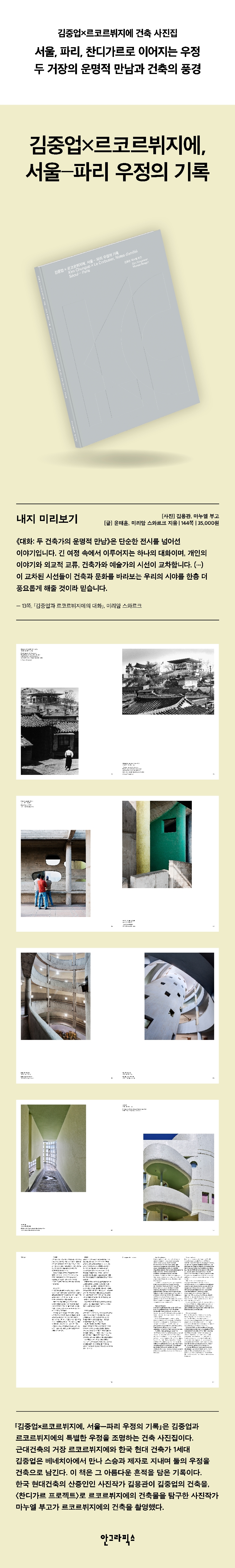 13ÂÊ, ¡¸±èÁß¾÷°ú ¸£ÄÚ¸£ºßÁö¿¡ÀÇ ´ëÈ¡¹ - ¹Ì¸®¾Ï ½º¿Í¸£Å© ¼Õ»óµÇ°í ÈÑ¼ÕµÈ °ÇÃ๰ÀÏÁö¶óµµ ±× ¾È¿¡ ±êµç Á¤½Å°ú °ÇÃàÀû ¿¸ÁÀ» µÇ»ì¸®´Â ÀÏÀÌ Áß¿äÇÏ´Ù. ±è¿ë°üÀº ±× º»·¡ÀÇ Àǵµ, ±èÁß¾÷ÀÌ Ç°¾ú´ø °ø°£Àû ºñÀüÀ» »çÁøÀ¸·Î ´Ù½Ã ã¾Æ³»°íÀÚ Çß´Ù. ÀÌ Ã¥¿¡ ½Ç¸° »çÁøµéÀº ¹Ù·Î ±× '°ÇÃàÀÇ º»Áú'À» ´Ù½Ã ºÒ·¯³»´Â ½Ãµµ´Ù. 18ÂÊ, ¡¸2025³â¿¡ ±èÁß¾÷À» ÃÔ¿µÇÑ´Ù´Â °Í¡¹ - À±ÅÂÈÆ ÁÖÇÑÇÁ¶û½º´ë»ç°üÀº ±èÁß¾÷ÀÌ ¸ð´õ´ÏÁò°ú Çѱ¹¼ºÀ» °áÇÕ½ÃŲ ´ëÇ¥ °Ç¹°·Î, Çѱ¹ Çö´ë°ÇÃàÀÇ ¼±¾ð¹®À̶ó ºÒ¸°´Ù. (...) ¶¥ÀÇ °æ»ç¸éÀ» µû¶ó ¼¼ °³ÀÇ ÆÄºô¸®¿ÂÀ» ¹è¿ÇÑ ±¸¼ºÀº ¸£ÄÚ¸£ºßÁö¿¡ÀÇ °ÇÃàÀû »êÃ¥ °³³ä°ú, ºÎ¼®»ç °°Àº Çѱ¹ »çÂûÀÇ ´Ü°èÀû ¹èÄ¡¸¦ Àý¹¦ÇÏ°Ô Á¢¸ñÇÑ °á°ú´Ù. 19ÂÊ, ¡¸2025³â¿¡ ±èÁß¾÷À» ÃÔ¿µÇÑ´Ù´Â °Í¡¹ - À±ÅÂÈÆ ¸£ÄÚ¸£ºßÁö¿¡´Â 22¹ø ±¸¿ªÀÇ Âùµð°¡¸£ ÁÖÅà ¸ðµ¨À» ¼³°èÇϱâ Àü, ÀεµÀÇ »ýȰ ½À°ü°ú ÀüÅëÀ» ±íÀÌ ¿¬±¸Çß½À´Ï´Ù. ±×ÀÇ Ãʱ⠱¸»óÀº ¸¶¸£¼¼À¯ÀÇ À¯´ÏÅ×´ÙºñŸ½Ã¿Ëó·³ °íÃþ °øµ¿ÁÖÅÃÀ» ¿©·¯ ä ¼¼¿ì´Â °ÍÀ̾ú°í, ÆÄ¸®¸¦ À§ÇØ ¼³°èÇß´ø º¸¾ÆÀï °èȹ(Plan Voisin)°ú °°Àº ÇüÅ¿´½À´Ï´Ù. ±×·¯³ª ±×´Â °ð ÀεµÀÎÀÇ »ýȰ ¹æ½ÄÀÌ °³ÀÎ ÁÖÅÃ, Áï 1-2Ãþ ±Ô¸ðÀÇ »ýȰ°ø°£¿¡ ¸ÂÃçÁ³´Ù´Â °ÍÀ» ±ú´Ý½À´Ï´Ù. (...) °á±¹ Âùµð°¡¸£ ÁֹεéÀÌ ¸£ÄÚ¸£ºßÁö¿¡ÀÇ °ÇÃà¿¡ ¾î·ÆÁö ¾Ê°Ô ÀûÀÀÇß´ø ÀÌÀ¯´Â, ¿ÀÈ÷·Á ¸£ÄÚ¸£ºßÁö¿¡°¡ ±×µéÀÇ »ýȰ¾ç½Ä¿¡ ¸ÂÃç ¼³°è ¹æ½ÄÀ» Á¶Á¤Ç߱⠶§¹®À̾ú½À´Ï´Ù. 95ÂÊ, ¡¸¸¶´©¿¤ ºÎ°í ÀÎÅͺ䡹 - ¹Ì¸®¾Ï ½º¿Í¸£Å© ÀúÈñ°¡ ±èÁß¾÷ ¼±»ý´Ô²² ¹ÙÄ¡´Â Àü½Ã¸¦ ÁغñÇÏÁö¸¸ ÀÌ °úÁ¤ ÀÚü°¡ ±â¾ïÇÏ°í ±â·ÏÇÏ´Â ÇàÀ§¶ó »ý°¢ÇÕ´Ï´Ù. Áö±ÝÀº ÀúÈñ°¡ ´©¸®°ÚÁö¸¸, ½Ã°£ÀÌ Áö³ª¸é ÀÌ ±â·ÏÀÌ Á¡Á¡ '¿ì¸®'¸¸ÀÇ ±â·Ï¿¡ ¸Ó¹°Áö ¾ÊÀ» °Ì´Ï´Ù. ´õ ³ª¾Æ°¡ Ã¥°ú »çÁøÀº Çö¹°ÀÇ ±â·ÏÀ̶ó´Â Á¡¿¡¼ Áö±Ýº¸´Ù Áß¿äÇÏ°í ±ÍÇØÁú °Ì´Ï´Ù. ±×·¸±â ¶§¹®¿¡ ÀÌ·± ±â·ÏÀÇ °¡Ä¡´Â ¹Ì·¡ ¼¼´ë¿¡¼ º¸´Ù Áß¿äÇØÁú °Í °°½À´Ï´Ù. 133ÂÊ, ¡¸±è¿ë°ü ÀÎÅͺ䡹 - À±ÅÂÈÆ ÃâÆÇ»ç ¼ÆòÇö´ë°ÇÃàÀÇ °ÅÀå ±èÁß¾÷°ú ¸£ÄÚ¸£ºßÁö¿¡