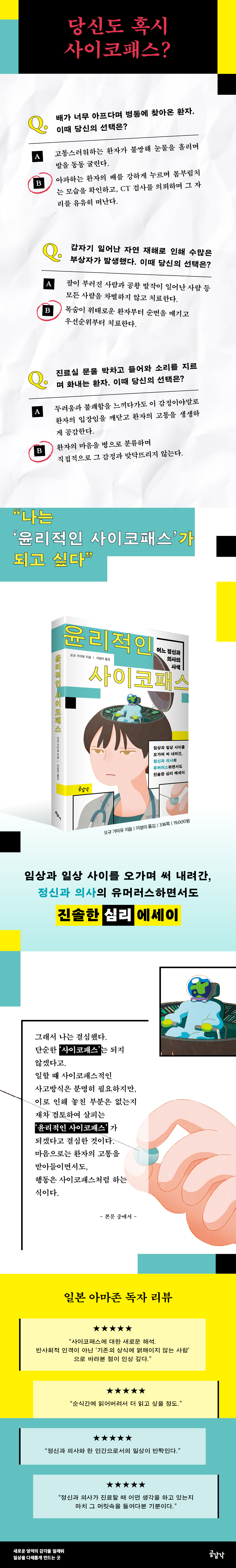 Ã¥ÀÇ Á¦¸ñÀÎ ¡®À±¸®ÀûÀÎ »çÀÌÄÚÆÐ½º¡¯´Â ÀúÀÚ°¡ ÀÇ»ç·Î¼ Ãß±¸ÇϰíÀÚ ÇÏ´Â ÀÚ¼¼¸¦ °¡¸®Å²´Ù. Á¤½Å°ú¸¦ ã´Â ¸ðµç ȯÀÚÀÇ Á¤¼Àû °íÅëÀ» ÀÌÇØÇÏ·Á Çϸé ÀÇ»çÀÇ ½É½ÅÀÌ ¸ÕÀú ÁöÄ¥ °¡´É¼ºÀÌ ÀÖ´Ù. ¸ðµç »ç¶÷À» Á¦´ë·Î »ìÇDZâ À§Çؼ´Â ¡®´©±º°¡ÀÇ Á¤¼Àû »óó¸¦ ºÎÂ÷ÀûÀ¸·Î µÎ´Â °Í¡¯, À̸¥¹Ù ¡®»çÀÌÄÚÆÐ½ºÀû¡¯ ÇൿÀÌ ÇÊ¿äÇÏ´Ù. ÀúÀÚ´Â Áø·á ÇöÀå¿¡¼ ºÒ°¡ÇÇÇÏ°Ô ¿ä±¸µÇ´Â »çÀÌÄÚÆÐ½ºÀûÀÎ ³ÃÁ¤ÇÔÀ» ÀÎÁ¤Çϸ鼵µ, ±× ¾È¿¡¼ ȯÀÚÀÇ ¸¶À½°ú ÀڽŸ¸ÀÇ À±¸®¸¦ µÇµ¹¾Æº»´Ù. À̼ºÀûÀÎ ÆÇ´Ü µÚ¿¡ ³õÄ£ ºÎºÐÀº ¾ø´ÂÁö ȯÀÚµéÀ» ÀçÂ÷ °ËÅäÇÏ°í »ìÇÇ´Â ¡®À±¸®ÀûÀÎ »çÀÌÄÚÆÐ½º¡¯°¡ µÇ°Ú´Ù°í °á½ÉÇÑ´Ù.