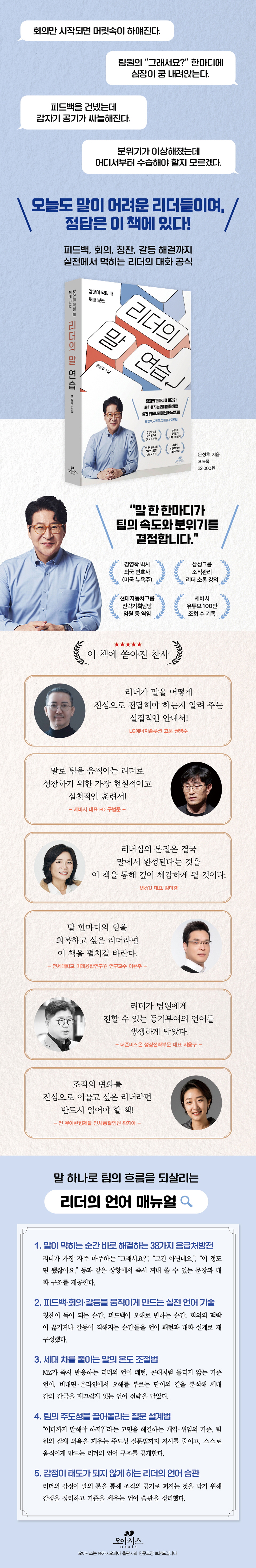 -p.009 ¸®´õ°¡ ¸»À» ¸ÚÀÖ°Ô Çϸé ÁÁÁö ¾ÊÀ»±î? ¹°·Ð ÁÁ´Ù. ±×·±µ¥ Áö³ªÄ¡°Ô ¸ÚÀ» ºÎ¸®¸é Å« ºÎÀÛ¿ëÀÌ Çϳª »ý±ä´Ù. ¸®´õÀÇ ¸»Àº ÆÀ¿øÀ» ½ÇÇàÀÇ ¹®ÅαîÁö À̲ø¾î¾ß ÇÑ´Ù. ±×·±µ¥ ¸ÚÀ» ºÎ¸®¸é Áß¿äÇÑ ¸»À» Á÷Á¢ Àü´ÞÇÏÁö ¸øÇÏ´Â ÇÊÅͰ¡ »ý±â°í, ±× ÇÊÅÍ ¶§¹®¿¡ ÆÀ¿øÀ» ½ÇÇà±îÁö À̲ô´Â ÈûÀÌ ¾àÇØÁø´Ù. ÀÚµ¿Â÷ ¹Ú¹°°ü¿¡ °¡ º¸¸é ¿Ü°üÀº ¹øÂ½¹øÂ½Çѵ¥ »ç½ÇÀº ¿£ÁøÀÌ ºñ¾ú°Å³ª ÀüÇô ÁÖÇàÇÒ ¼ö ¾ø´Â Â÷µéÀÌ ¸¹´Ù. ¸®´õÀÇ ¸»Àº ÀÚµ¿Â÷ÀÇ ¿£Áø°ú °°´Ù. ´ç½ÅÀº Áö±Ý ¿£Áø ¾ø´Â Â÷ °°Àº »óÅ¿¡ Ã³ÇØ ÀÖ´ÂÁöµµ ¸ð¸¥´Ù. ¸®´õÀÇ ¸»ÀÌ ±×·¡¼´Â ¾È µÈ´Ù. -p.019 ¡°ÀßÇØ ºÁ¡±, ¡°¿½ÉÈ÷ Á» ÇØ ºÁ¡± °°Àº ¸»µéÀº Àǹ̸¦ °Á¶Çϱâ À§ÇÑ º¸Á¶ ¼ö´ÜÀÌÁö ±× ÀÚü·Î ¶Ñ·ÇÇÑ ¸Þ½ÃÁö¸¦ Àü´ÞÇÏÁö´Â ¾Ê´Â´Ù. ¾ÆÀú¾¾µéÀÌ ÈçÈ÷ ÇÏ´Â ¸»Àå³ÀÌ ÀÖÁö ¾ÊÀº°¡. ¡°Àú´Â ȸ»ç¸¦ Á¤¸» ¿½ÉÈ÷ ´Ù´Ï°Ú½À´Ï´Ù.¡±, ¡°¿½ÉÈ÷´Â ±âº»À̰í ÀßÇØ¾ßÁö. ¿½ÉÈ÷¸¸ ´Ù´Ï¸é ¹¹ÇØ?¡± ³»°¡ º¼ ¶© ¡®¿½ÉÈ÷¡¯³ª ¡®Àß¡¯À̳ª ±×°Ô ±×°Å´Ù. ¸®´õ´Â ÀÌ·¸°Ô ¸ðÈ£ÇÏ°Ô Áö½ÃÇØ¼´Â ¾È µÈ´Ù. ¡®Çൿ ´ÜÀ§¡¯·Î ¿äûÇϰí Àü´ÞÇÏ´Â ·çƾÀÌ ÇÊ¿äÇÏ´Ù. -p.031 ¸»¼Ø¾¾°¡ ¹Ù·Î ÁÁ¾ÆÁö´Â ¼¼ °¡Áö ÆÁÀº ´ÙÀ½°ú °°´Ù. ù°, ÇÑ ¹øÀÇ ´ëÈ¿¡´Â ÇϳªÀÇ ÁÖÁ¦¸¦ °íÁ¤ÇÏ°í »ÏÁ·ÇÏ°Ô ¸»ÇÏ´Â ½À°üÀ» µé¿©¶ó. µÑ°, ¾Æ¹«¸® ¸»Çϱ⿡ ¼Åø·¯µµ 5ºÐ ¸»Çϱ⸦ À§ÇØ 15ºÐÀ» ÁغñÇ϶ó. ¿¬½ÀÇÏ¸é ¸»À» ÀßÇÒ ¼ö¹Û¿¡ ¾ø´Ù. ¼Â°, ¸»ÀÇ ±¸Á¶¸¦ Á¤ÇØ µÎ°í ¼ø¼´ë·Î ¸»Ç϶ó. »ç¶÷Àº ±¸Á¶°¡ Â¥¿© ÀÖÀ¸¸é ÀÌÇØ³ª ¼±ÅÃÀÌ ½¬¿öÁø´Ù. ÀÌ ¼¼ °¡Áö ÆÁÀ» ²ÙÁØÈ÷ ½ÇõÇÑ´Ù¸é ¿À ºÎÀåµµ ÃæºÐÈ÷ ¸» ÀßÇÏ´Â ¸®´õ·Î ¼ºÀåÇÒ ¼ö ÀÖÀ» °ÍÀÌ´Ù. -p.064 °¨Á¤Àû ³ëµ¿Àº °¨Á¤Àû ÇǷηΠÀ̾îÁö°í, Á÷¹« ¸¸Á·µµ°¡ ³·¾ÆÁö´Â °á°ú·Î À̾îÁø´Ù. ƯÈ÷ ¸®´õ¿Í ÆÀ ¿ø °£ÀÇ ±Ç·Â °Å¸®°¡ Ŭ¼ö·Ï, Áï À§°è°¡ ¶Ñ·ÇÇÒ¼ö·Ï ÆÀ¿øµéÀº Ç¥¸éÀû ÇൿÀ» ´õ ¸¹ÀÌ ÇÏ°Ô µÇ°í ±×¸¸Å ºÎÁ¤Àû ¿µÇâµµ ´õ Ä¿Áø´Ù. ÆÀÀåÀÇ ¾È ¿ô±ä ³ó´ãº¸´Ù »çÀåÀÇ ÀæÀº ¡®¾ÆÀç °³±×¡¯°¡ ´õ ÇǰïÇÑ °ÍÀÌ´Ù. -p.119 ¸»ÇÏ´Ù°¡ ħ¹¬ÇÏ¸é ±× »ç¶÷À» ÃÄ´Ùº¸°Ô µÈ´Ù. ±×¶§ µè´Â »ç¶÷ÀÇ ÁýÁß·ÂÀº ³ô¾ÆÁö°í ³»¿ëÀÇ µÞºÎºÐ¿¡ ´ëÇØ Áß¿äÇÏ°Ô »ý°¢ÇÏ°Ô µÈ´Ù. ħ¹¬Àº µè´Â »ç¶÷ÀÇ ÁýÁß·ÂÀ» ¸¸µå´Â ½ºÅ³ÀÌ´Ù. ÆÀ¿øµé¿¡°Ô âÀÇÀûÀÎ ¾ÆÀ̵ð¾î¸¦ ³»¶ó°í ÂÉ´Â ´ë½Å ħ¹¬ÇÏ°í ¿©¹éÀ» ¸¸µé¾î ÁÖ¾î¶ó. »ç¶÷Àº ħ¹¬À» °ßµðÁö ¸øÇÏ´Â ¸éÀÌ ÀÖ¾î ÀÚ±â¶óµµ ±× ħ¹¬À» ±ú°í ½Í¾î ¾È´ÞÀÌ ³´Ù. Á¶¿ëÇÏ´ø ÆÀ¿øµµ ¸»À» ÇÏ°Ô µÉ °ÍÀÌ´Ù. -p.177 ¾ÖÃÊ¿¡ º¯È¸¦ ÁÁ¾ÆÇÏ´Â ÆÀ¿øÀº ¸¹Áö ¾Ê´Ù. ¸®´õµµ ¸¶Âù°¡Áö´Ù. ȸ»ç¿¡¼ »õ·Î¿î Á¦µµ¸¦ µµÀÔÇÏ¸é ¡°ÀÌ°Ô ¸»ÀÌ µÇ³ª¿ä?¡±, ¡°¿À·¡ ¸ø °¥ °Å¿¹¿ä¡±¶ó´Â ºÒ¸¸ºÎÅÍ ³ª¿Â´Ù. °Ô´Ù°¡ º¯È°¡ »ý±â¸é ¡®ÀÏÀÌ ´Ã°Ú³×¡¯¶ó´Â »ý°¢ÀÌ ¸ÕÀú µç´Ù. ±×·¯´Ù º¸´Ï º¯È°¡ ºÎ´ã½º·¯¿ï ¼ö¹Û¿¡. º¯È´Â ´Ã ºÒÆíÇÏ´Ù. ±× ¿Ü¿¡µµ º¯È¿¡ ÀúÇ×ÇÏ´Â ÀÌÀ¯´Â ¸¹´Ù. ±× ÀÌÀ¯¸¦ ÆÄ¾ÇÇÏ´Â °Íµµ ¸®´õÀÇ ÀÏÀÌ´Ù. ÆÀ¿øÀÌ º¯È¿¡ ÀúÇ×ÇÑ´Ù¸é ¸®´õ´Â ±× ÀÌÀ¯¸¦ »ìÆìº¸°í ´ëȸ¦ ¼³°èÇØ¾ß ÇÑ´Ù. ¹Ý°ñ ÆÀ¿ø°ú´Â ´ÙÀ½°ú °°ÀÌ ´ëÈÇØ º¸ÀÚ. -p.285 ÃâÆÇ»ç ¼Æò¸®´õ½ÊÀÇ ¼ºÆÐ´Â °á±¹