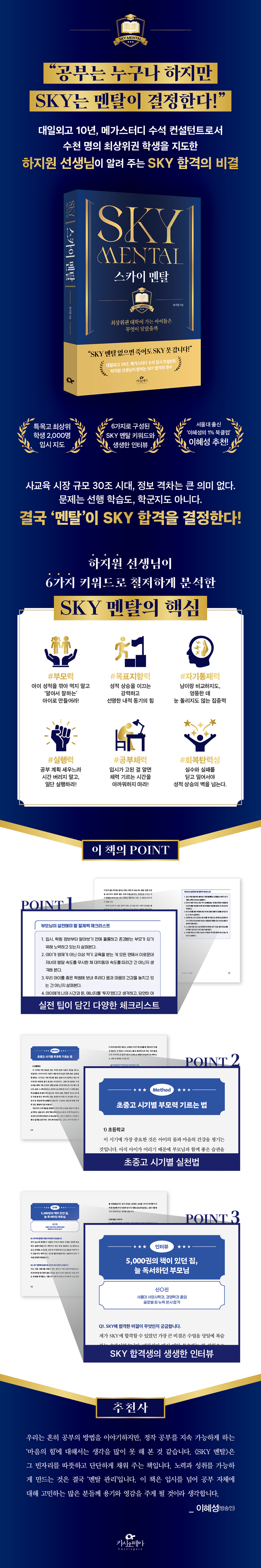 ÃÖ»óÀ§±Ç ÇлýµéÀÇ °ç¿¡¼ °øºÎ¸¦ ÁöµµÇÏ°í ¸¹Àº ÇлýÀÌ ÀԽÿ¡¼ ¿øÇÏ´Â ¸ñÇ¥¸¦ ¼ºÃëÇØ ³ª°¡´Â °úÁ¤À» ÁöÄѺ¸¸é¼ ±× ÇлýµéÀÌ Ã³ÇÑ È¯°æ°ú °ü°è¾øÀÌ ´ëÀÔ¿¡¼ ¿øÇÏ´Â ¸ñÇ¥¸¦ ÀïÃëÇÏ´Â Çлýµé¸¸ÀÇ °øÅëÁ¡, 'SKY ¸àÅ»'ÀÌ ÀÖ´Ù´Â »ç½ÇÀ» ±ú´Ý°Ô µÇ¾ú´Ù. ȯ°æÀ» ¶Ù¾î³Ñ´Â Èû, ¹Ù·Î ¸àÅ»ÀÇ Á߿伺À» ±ú´Ý°í ¼ö¸¹Àº Çлý°ú Çкθð´ÔÀ» À§ÇØ ÀÌ Ã¥À» ÁýÇÊÇß´Ù.