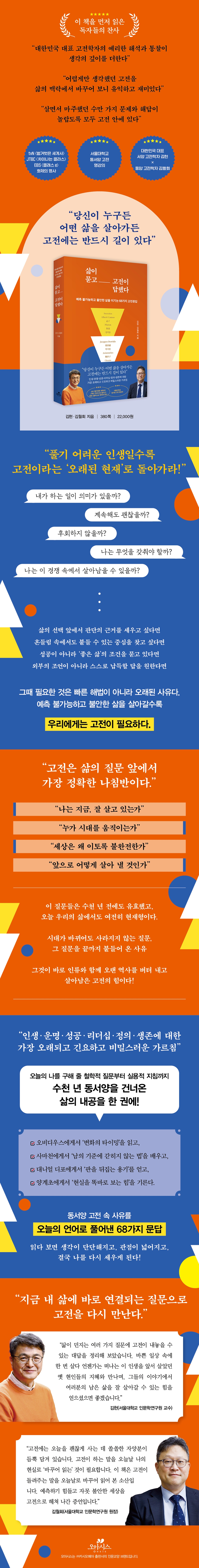 ´ëÇѹα¹À» ´ëÇ¥ÇÏ´Â Àι®ÇÐÀÚ ±èÇå ±³¼ö¿Í ±è¿ùȸ ±³¼ö´Â °íÀüÀÇ ¾È³»ÀÚÀÌÀÚ ÀλýÀÇ ¸àÅä·Î¼, ÀÚÁ¸°ú ¼ºÀå, ó¼¼¿Í ±Ç·Â, Çø¿À¿Í ¿å¸Á, ŵµ¿Í Ã¥ÀÓ µî »îÀÇ ÇÙ½É Å°¿öµå¸¦ µ¿¼¾ç °íÀü¿¡¼ ±æ¾î ¿Ã·Á ¿À´Ã³¯ ¿ì¸®ÀÇ Çö½Ç·Î ¿Å°Ü ¿Â´Ù. ¼¿ï´ëÇб³¿¡¼ Àι®ÇÐ °ÀÇ·Î °íÀü ¿Ç³À» À̲ø¾î ¿Â µÎ ÀúÀÚ´Â °íÀüÀ» ÅëÇØ Àΰ£ÀÇ º»Áú°ú »î¿¡ ´ëÇØ Áú¹®ÇÔÀ¸·Î½á ÀλýÀ» dz¿ä·Ó°Ô ¸¸µé ¼ö ÀÖ´Ù°í °Á¶ÇØ ¿Ô´Ù. µÎ »ç¶÷ÀÇ ¸Þ½ÃÁö´Â °ÀÇ½Ç ¹Û¿¡¼µµ À̾îÁ® Á÷¾÷, ³ªÀÌ, ¼ºº°, Çз°ú °ü°è ¾øÀÌ ´Ù¾çÇÑ »ç¶÷µé°ú ¼ÒÅëÇØ ¿Ô°í, À̵鿡°Ô¼ °øÅëµÈ Áú¹®ÀÌ ÀÖ´Ù´Â »ç½ÇÀ» ±ú´Þ¾Ò´Ù. "ÀλýÀÇ Àǹ̶õ ¹«¾ùÀΰ¡¿ä?", "¼¼»óÀÇ Æò°¡¿¡ ¾î¶»°Ô ´ëÃ³ÇØ¾ß ÇÒ±î¿ä?", "¾î¶»°Ô ¿Ç°í ±×¸§À» ²ç¶Õ¾î ºÁ¾ß ÇÒ±î¿ä?" ±×·¸°Ô ½ÃÀÛµÈ °ÍÀÌ ¡¶»îÀÌ ¹¯°í °íÀüÀÌ ´äÇß´Ù¡·ÀÌ´Ù.