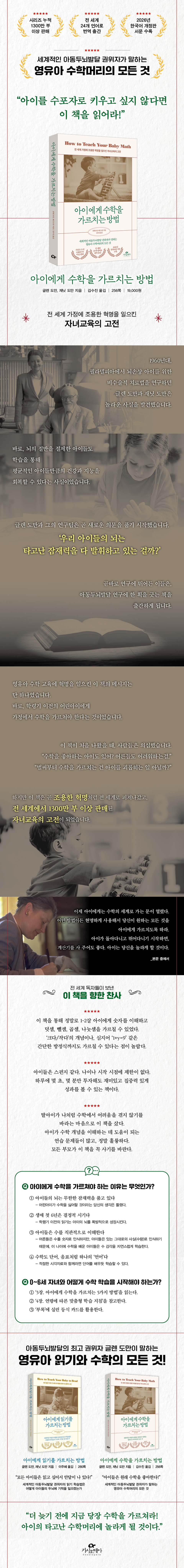 _¡®1Àå. ¾ÆÀ̵éÀº ¼öÇиӸ®¸¦ Ÿ°í³´Ù¡¯, pp.26~27 ´äÀÌ ±×·¸°Ô °£´ÜÇÏ°íµµ ¸íÈ®ÇÒ ¼ö ÀÖÀ»±î? ³ª´Â ÀÌ¹Ì 100°¡Áö¿¡ ´ÞÇÏ´Â ÈξÀ ´õ º¹ÀâÇÑ ´äÀ» °í·ÁÇÏ°í ¹èÁ¦Çß¾ú´Ù. ¾ÆÄ§¿¡ ´«À» ¶ßÀÚ¸¶ÀÚ ³»°Ô ã¾Æ¿Â °£°áÇÑ ÇØ´äÀº À̰ÍÀ̾ú´Ù. Ȥ½Ã ¿ì¸® ¾î¸¥µéÀº ³Ê¹«µµ ¿À·§µ¿¾È (Àû¾îµµ ¼öÇп¡¼´Â) ¡®»ç½ÇÀ» ³ªÅ¸³»´Â ±âÈ£¡¯¿¡ Àͼ÷ÇØÁ®¼, ±âÈ£°¡ ³ªÅ¸³»´Â »ó¡¸¸ º¸°í ±× ³Ê¸ÓÀÇ »ç½ÇÀº ÀÎÁöÇÒ ¼ö ¾ø°Ô µÈ °ÍÀÌ ¾Æ´Ò±î? ¹Ý¸é, ¾ÆÀ̵éÀº ¡®»ç½Ç ±× ÀÚü¡¯¸¦ ÀÎÁöÇÒ ¼ö ÀÖ´Â °ÍÀÌ ºÐ¸íÇß´Ù. ¾ÆÀ̵éÀº ½ÇÁ¦·Î ±×·¸°Ô Çϰí ÀÖ¾ú±â ¶§¹®ÀÌ´Ù. _¡®1Àå. ¾ÆÀ̵éÀº ¼öÇиӸ®¸¦ Ÿ°í³´Ù¡¯, pp.30~31 ¸ÕÀú, ¼öÇÐÀ̶ó´Â ü°è ÀÚü´Â Àΰ£ÀÇ ³ú¿¡ ³»ÀåµÈ ±â´ÉÀÌ ¾Æ´Ï´Ù. Àΰ£Àº ¼öÇÐÀ» ¡®¹ß¸í¡¯Çß°í, ±× °¡¸£Ä§ÀÇ ¹æ½Ä ¿ª½Ã ºÒ¿ÏÀüÇÏ´Ù. ¸ðµç Àΰ£ÀÌ ¾ð¾î¸¦ ¹ß¸íÇÑ °Í°ú´Â ´Þ¸®, ¸ðµç Àΰ£ÀÌ ¼öÇÐÀ» ¹ß¸íÇÑ °ÍÀº ¾Æ´Ï´Ù. Àΰ£ÀÌ ¼ÓÇØ »ì¾Ò´ø ¿©·¯ ºÎÁ· Áß¿¡´Â ºê¶óÁú ½Ì±¸ Áö¿ªÀÇ ¸î¸î ºÎÁ·Ã³·³ ÀüÇô ¼ÀÀ» ÇÏÁö ¾Ê´Â °æ¿ìµµ ÀÖ°í, ´Ù¼¸±îÁö¸¸ ¼¼´Â °æ¿ìµµ ÀÖ´Ù. ¾ÆÀÌ¿¡°Ô ¼öÇÐÀû »ç½ÇÀ» °¡¸£Ä¡°í, ±âÈ£·Î¼ÀÇ ¼ýÀÚ ¡®1, 2, 3, 4, 5, 6¡¦¡¯À̳ª ·Î¸¶ÀÚ ¡®I, II, III, IV, V, VI¡¦¡¯ÀÌ ¾Æ´Ñ ¡®Çϳª, µÑ, ¼Â, ³Ý¡¦¡¯ °°Àº ¼öÀÇ °³³äÀ» °¡¸£Ä£´Ù¸é ¾ÆÀÌ´Â µ¡¼À, »¬¼À, °ö¼À, ³ª´°¼À, ´ë¼öÇÐ µîÀ¸·Î ºÒ¸®´Â ¼öÇÐÀû ±ÔÄ¢µéÀ» ½º½º·Î ¹ß°ßÇØ ³½´Ù. _¡®2Àå. ¾ÆÀ̵éÀº ¼öÇÐÀ» ¹è¿ì°í ½Í¾î ÇÑ´Ù¡¯, pp.70~71 20°³ÀÇ µ¡¼À ¹®Á¦¸¦ ¹Ýº¹Çؼ Ç®°Ô ÇÏ´Â ´ë½Å, 1,000°³ÀÇ »õ·Î¿î ¹®Á¦¸¦ ºü¸£°í Áñ°Ì°Ô º¸¿© ÁÖ¸é ¾î¶³±î? ¹°·Ð, µ¡¼À µî½Ä 1,000°³°¡ 20°³º¸´Ù ÈξÀ ¸¹´Ù´Â »ç½ÇÀº ¼öÇРõÀç°¡ ¾Æ´Ï¶óµµ ´Ù ¾Ë ¼ö ÀÖ´Ù. ¾ÆÀ̵éÀº ¿ì¸®°¡ Á¦°øÇÏ´Â ¾çº¸´Ù ÈξÀ ¸¹Àº Á¤º¸¸¦ ¼ö¿ëÇÒ ¼ö ÀÖ´Ù. ¿©±â¼ ÇÙ½ÉÀº 21¹øÂ° ¹®Á¦¸¦ º¸¿© ÁÖ¾úÀ» ¶§¿Í 1,001¹øÂ° ¹®Á¦¸¦ º¸¿© ÁÖ¾úÀ» ¶§ °¢°¢ ¾î¶² ÀÏÀÌ ÀϾ´Â°¡¿¡ ÀÖ´Ù. ¾î¸°¾ÆÀ̸¦ °¡¸£Ä¡´Â ºñ°áÀÌ ¹Ù·Î ¿©±â¿¡ ÀÖ´Ù. _¡®3Àå. ¾ÆÀÌ¿¡°Ô ¼öÇÐÀ» °¡¸£Ä¡´Â 5°¡Áö ¹æ¹ý¡¯, p.101 ¹æ ¾È¿¡¼ °¡±¸³ª ±×¸² µî ½Ã°¢ÀûÀ¸·Î ¾ÆÀÌÀÇ ÁýÁß·ÂÀ» ¶³¾î¶ß¸± ¼ö ÀÖ´Â ¹°°ÇÀÌ ¸¹Áö ¾ÊÀº °÷À» °í¸¥´Ù. ÀÚ, ÀÌÁ¦ºÎÅÍ Áñ°Å¿òÀÌ ½ÃÀ۵ȴÙ. ±×Àú ¾ÆÀÌ ¼ÕÀÌ ´êÁö ¾ÊÀ» ¸¸Å ¶³¾îÁø °Å¸®¿¡¼ ¡®1 Ä«µå¡¯¸¦ µé°í ¶Ç·ÇÇÏ°í ¿ÀÇ ÀÖ´Â ¸ñ¼Ò¸®·Î ¡°ÀÌ°Ç ÀÏ(1)À̾ß.¡±¶ó°í ¸»ÇÏ¸é µÈ´Ù. ±×¹Û¿¡ ºÎ¿¬ ¼³¸íÀº ÇÊ¿äÇÏÁö ¾Ê´Ù. Ä«µå´Â 1ÃÊ ÀÌÇÏ·Î ¾ÆÁÖ Âª°Ô º¸¿© ÁØ´Ù. ±×·± ´ÙÀ½, ¡®2 Ä«µå¡¯¸¦ µé¾î º¸ÀÌ¸é¼ À̹ø¿¡µµ ¸Å¿ì ¿Á¤ÀûÀÎ ¸ñ¼Ò¸®·Î ¡°ÀÌ°Ç ÀÌ(2)¾ß.¡±¶ó°í ¸»ÇÑ´Ù. _¡®3Àå. ¾ÆÀÌ¿¡°Ô ¼öÇÐÀ» °¡¸£Ä¡´Â 5°¡Áö ¹æ¹ý¡¯, p.111 ¾ÆÀÌ´Â ÀÏ´Ü ¼öÇÐÀÌ ÀÚ½ÅÀÇ ÀÇÁö·Î ÀÌ·ç¾îÁø´Ù°í ´À³¥ ¶§, ±×¸®°í µµÆ® Ä«µå°¡ Àڱ⠰ÍÀ̶ó°í ´À³¥ ¶§ ¼öÇÐÀ» »ç¶ûÇÏ°Ô µÉ °ÍÀÌ´Ù. ÇÏÁö¸¸ óÀ½ À̰͵éÀº ºÎ¸ðÀÇ °ÍÀ̰í, ³¸¼± Á¸Àç´Ù. ±×·¯´Ï óÀ½¿¡´Â ÇÏ·ç Áß ÀûÀýÇÑ ¼ø°£À» °ñ¶ó µµÆ® Ä«µå 5Àå ÇÑ ¼¼Æ®¸¦ ¾ÆÁÖ »¡¸® º¸¿© ÁØ ´ÙÀ½ Ä¡¿ö ¹ö¸°´Ù. ±×·¯´Ù°¡ Àû´çÇÑ ¼ø°£ÀÌ ¿À¸é ´Ù½Ã º¸¿© ÁØ´Ù. _¡®4Àå. ¿¬·É¿¡ µû¸¥ ¸ÂÃãÇü ÇнÀ Áöħ¡¯, p.199 ¾î¸°¾ÆÀÌ´Â ¹«¹Ì°ÇÁ¶ÇÑ ¾î¸¥µé°ú´Â ´Ù¸¥, Ȱ±â ³ÑÄ¡´Â Á¸Àç´Ù. ¾î¸°¾ÆÀÌ´Â »ç½ÇÀ» ÅëÇØ ¼¼»óÀ» ¹è¿î´Ù. »ç½ÇÀ» º¸¿© ÁÖ¸é, ¾ÆÀ̵éÀº ±× »ç½ÇÀ» Áö¹èÇÏ´Â ¹ýÄ¢À» Á÷°üÀûÀ¸·Î ÀÌÇØÇÑ´Ù. ÀÌ´Â °úÇÐÀÚµéÀÌ ¼¼»óÀ» ÀÌÇØÇÏ´Â ¹æ½Ä°ú °°´Ù. »çÀü¿¡¼´Â °úÇÐÀ» °¡¸®ÄÑ ¡®»ç½ÇÀ» Áö¹èÇÏ´Â ¹ýÄ¢À» µå·¯³»µµ·Ï ü°èÀûÀ¸·Î Á¶Á÷µÈ ÀÏ·ÃÀÇ »ç½ÇÀ» ´Ù·ç´Â Áö½Ä ºÐ¾ß¡¯¶ó°í Á¤ÀÇÇÑ´Ù. ÀÌ·± »çÀüÀû Á¤ÀÇ¿¡ µû¸£¸é, ¾î¸°¾ÆÀ̾߸»·Î °úÇÐÀÚ´Ù. ±×·¯¹Ç·Î ¾ÆÀ̵鿡°Ô À̷аú Ãß»óÀûÀÎ ³»¿ëÀ» ¾Ë·Á Áֱ⺸´Ù´Â »ç½Ç°ú Çö½ÇÀ» º¸¿© Áֱ⸦ ¹Ù¶õ´Ù. _¡®4Àå. ¿¬·É¿¡ µû¸¥ ¸ÂÃãÇü ÇнÀ Áöħ¡¯, p.210 ÃâÆÇ»ç ¼Æò¡ÚÀü ¼¼°è 1300¸¸ ºÎ ÀÌ»ó ÆÇ¸ÅµÈ ¿µÀ¯¾Æ Àڳ౳À°¼ÀÇ °íÀü
