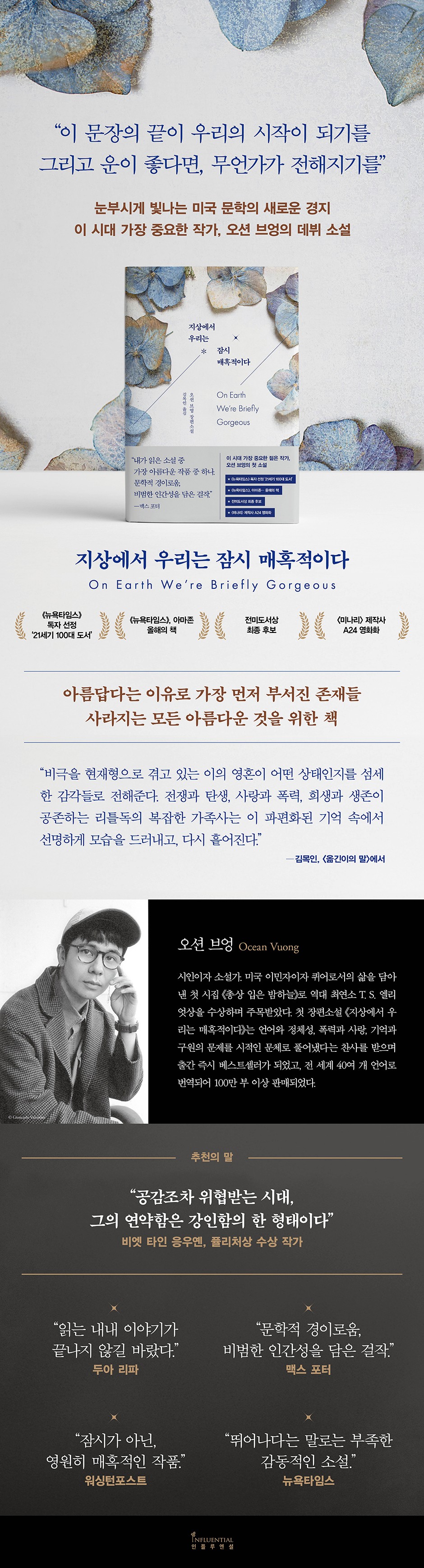¡¶Áö»ó¿¡¼ ¿ì¸®´Â Àá½Ã ¸ÅȤÀûÀÌ´Ù¡·´Â ½ÃÀû ¾ð¾î¿Í ¼»çÀû ½ÇÇèÀ» °áÇÕÇØ °íÅëÀ» Á¤¸éÀ¸·Î ¹Ù¶óº¸¸é¼ »îÀÇ Á¸¾ö°ú ¾Æ¸§´Ù¿òÀ» ³¡±îÁö ³õÁö ¾Ê´Â ÀÛǰÀ¸·Î Æò°¡¹Þ¾Ò´Ù. Àá½Ã ¸Ó¹°´Ù »ç¶óÁö´Â Á¸Àç·Î¼ Àΰ£ÀÌ ³²±æ ¼ö ÀÖ´Â ÈçÀûÀ» ÀÚ½ÅÀÇ µ¥ºßÀÛ¿¡ ±í°Ô »õ°Ü³ÖÀ¸¸ç, ¿À¼Ç ºê¾ûÀº »óó ÀÔÀº °³ÀÎÀÇ À̾߱Ⱑ ¾î¶»°Ô º¸ÆíÀû ¼»ç·Î È®ÀåµÉ ¼ö ÀÖ´ÂÁö¸¦ Áõ¸íÇØ³Â´Ù. ¡¶Áö»ó¿¡¼ ¿ì¸®´Â Àá½Ã ¸ÅȤÀûÀÌ´Ù¡·´Â 2024³â ¡¶´º¿åŸÀÓ½º¡· µ¶ÀÚµéÀÌ ¼±Á¤ÇÑ ¡®21¼¼±â 100´ë µµ¼¡¯¿¡ ¼±Á¤µÇ°í, ¡´¹®¶óÀÌÆ®¡µ, ¡´¹Ì³ª¸®¡µ µîÀ¸·Î Àß ¾Ë·ÁÁø A24¿¡¼ ¿µÈ Á¦ÀÛÀÌ È®Á¤µÇ¸ç ²ÙÁØÈ÷ ÁÖ¸ñÀ» ¹Þ°í ÀÖ´Ù. »õ·Ó°Ô Ãâ°£µÇ´Â Çѱ¹¾îÆÇÀº ÀÛ°¡ÀÌÀÚ ¹ÂÁö¼ÇÀÎ ±è¸ñÀÎÀÌ ¹ø¿ªÀ» ´Ùµë°í ¿Å±äÀÌÀÇ ¸»À» ´õÇß´Ù.