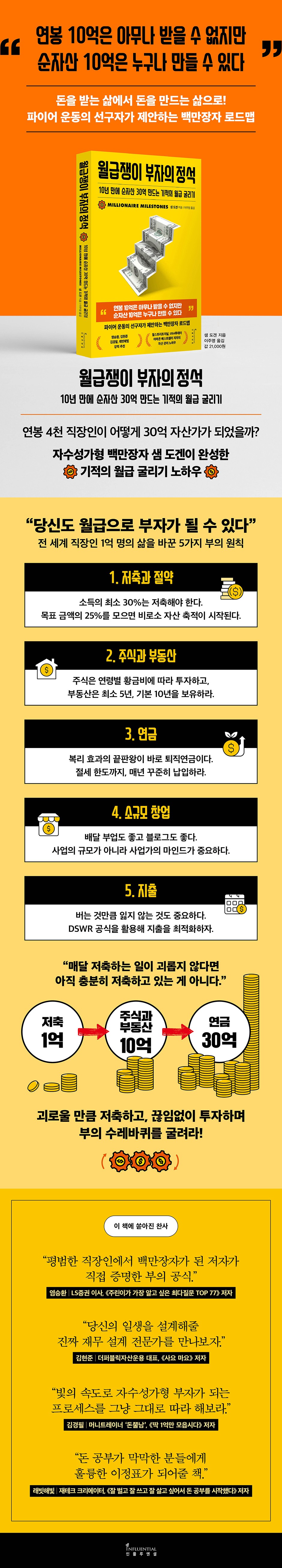 _14ÂÊ, ¡´ÇÁ·Ñ·Î±×¦¢ºÎ¸¦ ÇâÇÑ Ã¹°ÉÀ½¡µ ºÐ¸íÇÑ ¸ñÀûÀÌ ¾øÀ¸¸é ¼º°ø¿¡ ´ëÇÑ µ¿±âºÎ¿©µµ ¾î·Á¿öÁø´Ù. (¡¦) ´Ü¼øÈ÷ ÁýÀ» »ç°í ½Í´Ù°í »ý°¢ÇÏ´Â °Í°ú °¡Á·ÀÌ ÆíÇÏ°Ô »ì±â À§ÇØ ÇâÈÄ 5³â µ¿¾È ¿ù±ÞÀÇ 40%¸¦ ÀúÃàÇϰí, S&P 500 ETF¿¡ ÅõÀÚÇϸç, ÀÚµ¿Â÷¸¦ »ç´Â ´ë½Å ´ëÁß±³ÅëÀ» ÀÌ¿ëÇÏ¸é¼ ¹æ ¼¼ °³Â¥¸® ÁÖÅÃÀÇ ¸Å¸Å °è¾à±ÝÀ¸·Î 30¸¸ ´Þ·¯¸¦ ¸ðÀ¸°Ú´Ù°í »ý°¢ÇÏ´Â °Í¿¡´Â Å« Â÷À̰¡ ÀÖ´Ù. _28~29ÂÊ, ¡´1ºÎ¦¢´ç½ÅÀº ¿Ö ¹é¸¸ÀåÀÚ°¡ µÇ°í ½ÍÀº°¡¡µ °¡ÁöÁö ¸øÇÑ °Í¿¡ ºÒÆòºÒ¸¸À» ´Ã¾î³õÀ¸¸é¼ °¡¸¸È÷ À־ ¾È µÈ´Ù. ³Ê¹« ¸¹Àº »ç¶÷ÀÌ Àڱ⠿¬¹Î¿¡ ºüÁ® ÀλýÀ» ÇãºñÇÑ´Ù. ±×º¸´Ù´Â ÁÖ¾îÁø ½Ã°£°ú ¿¡³ÊÁö¸¦ ÃÖ´ëÇÑ È°¿ëÇØ ºÎÀÚ°¡ µÉ ¼ö ÀÖ´Ù°í ¹Ï¾î¾ß ÇÑ´Ù. _53ÂÊ, ¡´1ºÎ¦¢¹é¸¸ÀåÀÚ°¡ µÉ ¼ö ÀÖ´Ù°í È®½ÅÇÏ¶ó¡µ ¸Å´Þ ÀúÃàÇÏ´Â ÀÏÀÌ ±«·ÓÁö ¾Ê´Ù¸é ¾ÆÁ÷ ÃæºÐÈ÷ ÀúÃàÇϰí ÀÖ´Â °Ô ¾Æ´Ï´Ù. _67ÂÊ, ¡´2ºÎ¦¢1´Ü°è ¼ÒµæÀÇ 30% ÀÌ»óÀ» ÀúÃàÇÏ¶ó¡µ ¸Å³â ¼¼ÈÄ ¼ÒµæÀÇ 40%¸¦ ÀúÃàÇÏ¸é °æÁ¦Àû ÀÚÀ¯¸¦ 1³â °¡±îÀÌ ¾Õ´ç±æ ¼ö ÀÖ´Ù. ´õ »¡¸® ºÎÀÚ°¡ µÇ·Á¸é ¿¬ºÀ Àλó ÈÄ¿¡µµ ÁöÃâÀ» ÀÏÁ¤ÇÏ°Ô À¯ÁöÇϰųª ½ÉÁö¾î ´õ ³·Ãç ÀúÃà·üÀ» ³ôÀÌ´Â °ÍÀÌ ÁÁ´Ù. ¹Ì·¡¸¦ À§ÇØ ´õ ¸¹ÀÌ ÅõÀÚÇÒ¼ö·Ï °æÁ¦Àû ¸ñÇ¥¸¦ ºü¸£°Ô ´Þ¼ºÇÒ ¼ö ÀÖ´Ù. _75ÂÊ, ¡´2ºÎ¦¢1´Ü°è ¼ÒµæÀÇ 30% ÀÌ»óÀ» ÀúÃàÇÏ¶ó¡µ Áֽİú ä±ÇÀÇ µÎ °¡Áö Àڻ걺À¸·Î ÀÌ·ç¾îÁø Æ÷Æ®Æú¸®¿À¿¡¼ ä±ÇÀº ³ªÀÌ¿Í °°Àº ºñÁßÀ» µÐ´Ù. _90ÂÊ, ¡´2ºÎ¦¢2´Ü°è Áֽİú ä±Ç¿¡ ºÐ»ê ÅõÀÚÇÏ¶ó¡µ ¹é¸¸ÀåÀÚ°¡ µÇ°í ½Í´Ù¸é ù ¹øÂ° ¸ñÇ¥·Î 25¸¸ ´Þ·¯¸¦ ¸¸µé¾î¶ó. À̰ÍÀº °¡Àå Áß¿äÇÑ ÀÌÁ¤Ç¥À̹ǷΠũ°Ô µ¿±×¶ó¹Ì¸¦ ÃijõÀÚ. (¡¦) 401k¸¦ ÃÖ´ë ³³ÀÔ Çѵµ±îÁö ä¿ö³õ´Â »ç¶÷µéÀº ´©Àû Àû¸³±Ý¸¸À¸·Î ´ëºÎºÐ 11³â ¾È¿¡ ÀüȯÁ¡¿¡ µµ´ÞÇÑ´Ù. _106ÂÊ, ¡´2ºÎ¦¢3´Ü°è ÅðÁ÷¿¬±ÝÀ» ¼º½ÇÇÏ°Ô ¿î¿ëÇÏ¶ó¡µ ºÎµ¿»ê °¡°ÝÀº °æ±â°¡ Á¶±Ý ¾È ÁÁ¾ÆÁ³´Ù°í ÇÏ·ç¾ÆÄ§¿¡ 30% ÀÌ»ó Ç϶ôÇÏ´Â ÀÏÀÌ °ÅÀÇ ¹ú¾îÁöÁö ¾Ê´Â´Ù. ºÎµ¿»êÀº Áֽĺ¸´Ù ÈξÀ ´õ ¾ÈÁ¤ÀûÀ̱⠶§¹®¿¡ ¸¶À½ÀÌ Æò¾ÈÇØÁú »Ó ¾Æ´Ï¶ó ¿ª¼³ÀûÀ¸·Î ´õ ¸¹Àº µ·À» ¹ú¾î´Ù ÁØ´Ù. °á°úÀûÀ¸·Î ¸¹Àº »ç¶÷ÀÌ ±â²¨ÀÌ ºÎµ¿»êÀ» ´õ ´Ã¸®±â À§ÇØ ºú³»±â¸¦ ¸¶´ÙÇÏÁö ¾Ê´Â °ÍÀÌ´Ù. _125~126ÂÊ, ¡´2ºÎ¦¢4´Ü°è ÁýÀ» »çµÇ 5³â ÀÌ»ó º¸À¯ÇÏ¶ó¡µ ÁÖÅÃÀ» ¸Å¼öÇÒ ¶§´Â ±× Áý¿¡¼ ¿µ¿øÈ÷ »ì°Å³ª ±× ÁýÀ» ¿µ¿øÈ÷ º¸À¯ÇÑ´Ù°í »ý°¢ÇÏ´Â °ÍÀÌ ÀÌ»óÀûÀÌ´Ù. ±× Áý¿¡¼ ÃÖ¼Ò 5³âÀ» Áö³¾ ¼ö ¾ø´Ù¸é °è¼Ó ¼¼¸¦ µé¸é¼ ³²´Â µ·À» ÀúÃàÇÏ´Â ÆíÀÌ ³´´Ù. _135ÂÊ, ¡´2ºÎ¦¢4´Ü°è ÁýÀ» »çµÇ 5³â ÀÌ»ó º¸À¯ÇÏ¶ó¡µ »ç¾÷°¡·Î¼ »õ·Î¿î ¿©Á¤À» ½ÃÀÛÇϵç, ÅõÀÚÀڷμ ºñ»óÀå ±â¾÷¿¡ ÅõÀÚÇϵç, ¹é¸¸ÀåÀÚ°¡ µÇ±â À§Çؼ´Â ±â¾÷°¡Àû »ç°í¹æ½ÄÀÌ ¹Ýµå½Ã ÇÊ¿äÇÏ´Ù. Á÷ÀåÀÎÀ¸·Î ¿ù±ÞÀ» ¹Þ¾Æ ¼º½ÇÈ÷ ÀúÃàÇϰí ÅõÀÚÇÏ´Â ¹æ¹ýÀÌ ºÎ¸¦ ÃàÀûÇÏ´Â À¯ÀÏÇÑ ±æÀÌ ¾Æ´Ï¶ó´Â ¸»ÀÌ´Ù. _163~164ÂÊ, ¡´2ºÎ¦¢5´Ü°è ¼Ò±Ô¸ð â¾÷À¸·Î ¸Ó´Ï ÆÄÀÌÇÁ¶óÀÎÀ» ´Ã·Á¶ó¡µ FOMO(Fear Of Missing Out)¿Í ¿å¸ÁÀ» ¾ïÁ¦ÇØ¾ß ÇÑ´Ù. ¾Æ¹«¸® Çö¸íÇÑ »ç¶÷ÀÌ¶óµµ ÀÌ·± °¨Á¤¿¡ Áö¹è´çÇÏ¸é °æÁ¦ÀûÀ¸·Î ¼ºÀåÇÒ ¼ö ¾ø´Ù. _172ÂÊ, ¡´2ºÎ¦¢6´Ü°è ½Ç¼öÇÏÁö ¸»°í ºÒÈ®½Ç¼ºÀ» ÁÙ¿©¶ó¡µ ´ç½ÅÀÌ ¾Æ¹«¸® ´É·Â ÀÖ´Â »ç¶÷ÀÌ¶óµµ ÇöÀç »ì°í ÀÖ´Â µµ½Ã¿¡¼ °¡Àå Å« ȸ»çÀÇ ½Ã°¡ÃѾ×ÀÌ 10¾ï ´Þ·¯°¡ µÇÁö ¾Ê´Â´Ù¸é °áÄÚ ¹é¸¸ÀåÀÚ´Â µÇÁö ¸øÇÒ °ÍÀÌ´Ù. _200ÂÊ, ¡´2ºÎ¦¢7´Ü°è µ·ÀÌ ÀÖ´Â °÷À¸·Î °¡¶ó¡µ µÎ »ç¶÷ÀÌ ¾î·Á¿î »óȲ¿¡¼ ½ÃÀÛÇØ ÇÔ²² ÀÚ»êÀ» Çü¼ºÇÏ´Â °æÇèÀº Ưº°ÇÏ´Ù. °©ÀÛ½º·´°Ô ¾òÀº ºÎ, ƯÈ÷ ¿äÇàÀ¸·Î ¾òÀº ºÎ¿¡´Â ¿ÂÀüÈ÷ °¨»çÇϱⰡ ¾î·Æ´Ù. ¹Ý´ë·Î ÀÛÀº °Í¿¡¼ºÎÅÍ ½ÃÀÛÇØ ÇÔ²² ¾î·Á¿òÀ» ÇìÄ¡°í ÈûÀ» ¸ð¾Æ Àç»êÀ» ½×¾Æ³ª°¡¸é ¾öû³ ¼ºÃë°¨À» ´À³¥ ¼ö ÀÖ´Ù. _212~213ÂÊ, ¡´2ºÎ¦¢8´Ü°è ¶æÀ» °°ÀÌÇÏ´Â ÆÄÆ®³Ê¸¦ ±¸ÇÏ¶ó¡µ ¼Òºñ Æòźȶõ ¸ðÀº µ·À» ÀλýÀÇ ¸¶Áö¸· ´Ü°è¿¡ ¸ô¾Æ ¾²±âº¸´Ù´Â Æò»ý¿¡ °ÉÃÄ °í¸£°Ô ¼ÒºñÇÔÀ¸·Î½á °¡´ÉÇÑ ÇÑ ¿À·§µ¿¾È »îÀÇ ÁúÀ» ³ô°Ô À¯ÁöÇÏ´Â °ÍÀÌ´Ù. _243ÂÊ, ¡´3ºÎ¦¢Çö¸íÇÏ°Ô ¼ÒºñÇÏ¶ó¡µ ÃâÆÇ»ç ¼Æò¡Ú ¿°½Âȯ ÀÌ»ç, ±èÇöÁØ ´ëÇ¥, ±è°æÇÊ ¸Ó´ÏÆ®·¹À̳Ê, ·¡ºøÇغû °·Â Ãßõ