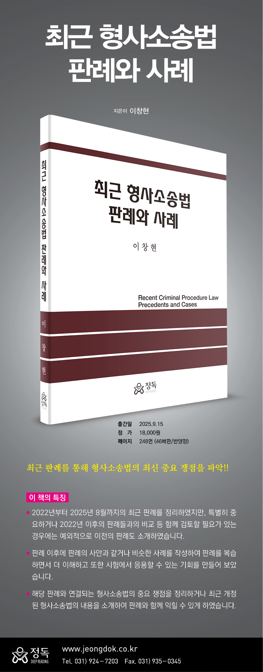 Ã¥¼ÓÀ¸·Î¸Ó¸®¸» ¿À·§µ¿¾È ¿©·¯ ·Î½ºÄð¿¡¼ ¡®ÃÖ±Ù 3³â°£ Çü»ç¼Ò¼Û¹ý ÆÇ·Ê¡¯¸¦ Ư° Çü½ÄÀ¸·Î °ÀÇÇØ ¿Ô½À´Ï´Ù. ·Î½ºÄð 1~2Çг⠽ñ⿡ »ç¿ëÇÑ ¹ýÇб³Àç¿¡´Â ¾ø´Â ÃÖ±Ù ÆÇ·Ê¸¦ ÅëÇØ Çü»ç¼Ò¼Û¹ýÀÇ ÃֽŠÁß¿ä ÀïÁ¡À» ÆÄ¾ÇÇÏ°Ô µÇ°í º¯È£»ç½ÃÇè¿¡µµ ÀÚÁÖ ÃâÁ¦µÇ±â¿¡ ¸¶¹«¸® Á¤¸®¸¦ °âÇØ¼ ÇÊ¿äÇÏ´Ù°í º¾´Ï´Ù. ÀÌ·± »óȲ¿¡¼ ¸¹Àº ·Î½ºÄðÀÇ Æ¯°¿¡ ¸ðµÎ ÀÀÇÒ ÇüÆíÀÌ µÇÁö ¾Ê°í, º¯È£»ç½ÃÇèÀ» ÁغñÇÏ´Â ÇлýµéÀÇ ¿äûµµ ÀÖ¾î¼ Çü»ç¼Ò¼Û¹ý Á¤¸®¿ë ±³À縦 ÁغñÇÏ°Ô µÇ¾ú½À´Ï´Ù. ÀÌ Ã¥ÀÇ ³»¿ëÀ̳ª Ư¡À» ¼Ò°³ÇÏ¸é ´ÙÀ½°ú °°½À´Ï´Ù. ù°, ¿øÄ¢ÀûÀ¸·Î 2022³âºÎÅÍ 2025³â 8¿ù±îÁöÀÇ ÃÖ±Ù ÆÇ·Ê¸¦ Á¤¸®ÇÏ¿´Áö¸¸ Ưº°È÷ Áß¿äÇϰųª 2022³â ÀÌÈÄÀÇ ÆÇ·Êµé°úÀÇ ºñ±³ µî ÇÔ²² °ËÅäÇÒ Çʿ䰡 ÀÖ´Â °æ¿ì¿¡´Â ¿¹¿ÜÀûÀ¸·Î 2022³â ÀÌÀüÀÇ ÆÇ·Êµµ ¼Ò°³ÇÏ¿´½À´Ï´Ù. ±×¸®°í ÆÇ·ÊÀÇ ³»¿ëÀº ±×´ë·Î À¯ÁöÇϸ鼵µ ¨ç, ¨è³ª ?, ?¿Í °°Àº ¼ø¹øÇ¥½Ã, ¹ØÁÙ°ú ÁøÇÑ ±Û¾¾ µîÀ¸·Î °¡´ÉÇÏ¸é ÆÇ·Ê¸¦ Àаí ÀÌÇØÇϱ⠽±µµ·Ï ³ë·ÂÇÏ¿´½À´Ï´Ù. µÑ°, ÆÇ·Ê ÀÌÈÄ¿¡ ÆÇ·ÊÀÇ »ç¾È°ú °°°Å³ª ºñ½ÁÇÑ »ç·Ê¸¦ ÀÛ¼ºÇÏ¿© ÆÇ·Ê¸¦ º¹½ÀÇÏ¸é¼ ´õ ÀÌÇØÇÏ°í ¶ÇÇÑ ½ÃÇè¿¡¼ ÀÀ¿ëÇÒ ¼ö ÀÖ´Â ±âȸ¸¦ ¸¸µé¾î º¸¾Ò½À´Ï´Ù. µû¶ó¼ 1ȸµ¶À» ÇÑ ÈÄ¿¡´Â ÆÇ·Ê¿Í »ç·Ê Áß¿¡ Çϳª¸¸À¸·Î »¡¸® º¹½ÀÀ» ÇÏ¸é ½Ã°£À» Àý¾àÇÒ ¼öµµ ÀÖÀ» °ÍÀÔ´Ï´Ù. ¼Â°, ÇØ´ç ÆÇ·Ê¿Í ¿¬°áµÇ´Â Çü»ç¼Ò¼Û¹ýÀÇ Áß¿ä ÀïÁ¡À» Á¤¸®Çϰųª ÃÖ±Ù °³Á¤µÈ Çü»ç¼Ò¼Û¹ýÀÇ ³»¿ëÀ» ¼Ò°³ÇÏ¿© ÆÇ·Ê¿Í ÇÔ²² ÀÍÈú ¼ö ÀÖ°Ô ÇÏ¿´½À´Ï´Ù. ÁÖ¿ä ÀïÁ¡À¸·Î´Â ¨ç ÇöÇà¹üüÆ÷ ¿ä°ÇÀ¸·Î¼ÀÇ ¡®Ã¼Æ÷ÀÇ Çʿ伺¡¯ ÆÇ´Ü±âÁØ, ¨è ½ÇÁúÀû ÇǾмöÀÚ¿¡ ÇØ´ç ¿©ºÎ, ¨é Á¤º¸ÀúÀå¸Åü¿¡ ´ëÇÑ ÀÓÀÇÁ¦Ãâ¹° ¾Ð¼ö¿Í Áõ°Å´É·Â ÀÎÁ¤ ¿©ºÎ, ¨ê ÀüÀÚÁ¤º¸¿¡ ´ëÇÑ ¾Ð¼ö¤ý¼ö»ö¿¡¼ÀÇ ÆÇ·Ê ÃßÀÌ, ¨ë ¾Ð¼ö¤ý¼ö»ö¿µÀå¿¡ ¡®¾Ð¼öÇÒ ¹°°Ç¡¯ÀÇ Æ¯Á¤ Á¤µµ, ¨ì Åë½ÅÁ¦ÇÑÁ¶Ä¡, Åë½Å»ç½ÇÈ®ÀÎÀÚ·á, Åë½ÅÀÚ·áÀÇ ±¸º°°ú ÇØ´ç ¿µÀå, ¨í °ø¼ÒÀ庯°æ °ü·Ã ÀïÁ¡ ¿ä¾à, ¨î À§¹ý¼öÁýÁõ°Å¹èÁ¦¹ýÄ¢ÀÇ ¿¹¿Ü·Î Áõ°Å´É·ÂÀÌ ÀÎÁ¤µÈ °æ¿ì µî ÀÔ´Ï´Ù. ÀÌ Ã¥ÀÌ º¯È£»ç½ÃÇèÀÇ ¸¶Áö¸· Á¤¸® ³»Áö ÆÇ·Ê º¸Ãæ ±³Àç·Î ¹ýÇеµµé¿¡°Ô µµ¿òÀÌ µÇ±æ ¹Ù¶ó´Â ¸¶À½¿¡¼ "Çü»ç¼Ò¼Û¹ý Á¦11ÆÇ" Ãâ°£ Á÷ÈÄ¿¡ Èûµé°Ô ¸¶·ÃÇÏ¿´´Âµ¥, ¸ðÂÉ·Ï ¼Ò±âÀÇ ¼º°ú¸¦ °ÅµÎ±æ ±â´ëÇØ º¾´Ï´Ù. »õ·Î¿î ÇüÅÂÀÇ ¼ÒÃ¥ÀÚ¸¦ ½Å¼ÓÇϰí Á¤¼º½º·´°Ô µµ¿ÍÁֽŠÁ¤µ¶ÀÇ ±èÁß¿ë »çÀå´Ô°ú ½É¼ºº¸ ÀÌ»ç´Ô, ±èÀμ÷ °úÀå´Ô²² °¨»ç¸¦ µå¸®¸ç, 2025³âÀÇ ³Ê¹« ´õ¿î ¿©¸§À» º¸³»°í Ǫ¸¥ °¡À»À» ¸ÂÀÌÇÏ°í ½Í½À´Ï´Ù. 2025³â 9¿ù Çѱ¹¿Ü´ë ¹ýÀü¿ø ¿¬±¸½Ç¿¡¼ ÀÌ Ã¢ Çö |