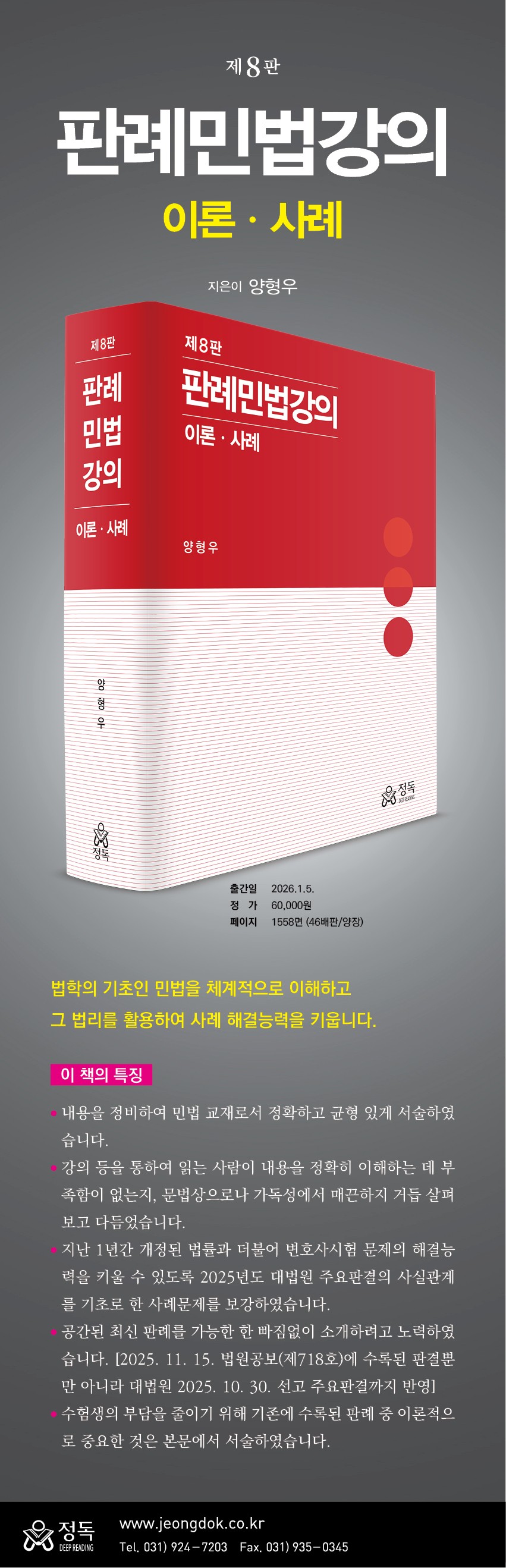 Ã¥¼ÓÀ¸·Î¸Ó¸®¸» µ¶ÀÚ ¿©·¯ºÐÀÇ ¼º¿ø¿¡ ¸Ó¸® ¼÷¿© °¨»çµå¸®¸ç, À̹ø °³Á¤ÆÇ¿¡¼µµ ±âÁ¸ÀÇ ±¸¼º ¹× ¼³¸í ¹æ¹ýÀ» ±×´ë·Î À¯ÁöÇÏ¸é¼ ³»¿ëÀ» ¼öÁ¤¤ýº¸¿ÏÇÏ¿´´Ù. ù°, ³»¿ëÀ» Á¤ºñÇÏ¿´´Ù. ¹Î¹ýÀÇ ±âº»¹ý¸®¿¡ ´ëÇÑ Á¤È®ÇÑ ÀÌÇØ¸¦ À§ÇÏ¿© ÇÊ¿äÇÑ ºÎºÐ¿¡ ¼³¸íÀ» Ãß°¡ÇÏ¿´À¸¸ç, º»¹®À̳ª ÆÇ·Ê¿¡¼ ÀÚÁÖ »ç¿ëÇÏ´Â ¹Î»ç¼Ò¼Û¹ý¤ý¹Î»çÁýÇà¹ý ¹ý·ü¿ë¾î¸¦ °¢ÁÖ¿¡¼ ¼³¸íÇÏ¿´´Ù. µÑ°, Á¦7ÆÇÀÌ Ãâ°£µÈ ÈÄ 2025. 11. 15.±îÁö ¹ß°£µÈ ¹ý¿ø°øº¸(Á¦718È£)»Ó¸¸ ¾Æ´Ï¶ó ´ë¹ý¿ø 2025. 10. 30. ¼±°í ÆÇ°á±îÁö ºÐ¼®ÇÏ¿© Áß¿äÇÑ °ÍÀº ¸ðµÎ ¹Ý¿µÇÏ¿´´Ù. ¶ÇÇÑ ÆÇ·ÊÀÇ ¹ý¸®¸¦ Á¤È®È÷ ÀÌÇØÇÒ ¼ö ÀÖµµ·Ï ÇÊ¿äÇÑ ºÎºÐ¿¡ ¼³¸íÀ» Ãß°¡ÇÏ¿´´Ù. ¼Â°, »ç·Ê¹®Á¦¸¦ º¸°ÇÏ¿´´Ù. »ç·Ê¹®Á¦´Â ´ë¹ý¿ø ÆÇ°á¿¡ ³ªÅ¸³ »ç½Ç°ü°è¿Í ÀïÁ¡À» Áß½ÉÀ¸·Î ¸¸µé¾ú´Ù. »ç·Ê¹®Á¦¸¦ Ãß°¡ÇÑ ºÎºÐÀº Ç¥Çö´ë¸®, ºÒ°¡ºÐ乫, »ó°è, ÀÓÂ÷±Çµî±â¸í·É, ½Çü°ü°è¿¡ ºÎÇÕÇÏ´Â µî±â µî °¢ 1¹®Á¦¾¿ÀÌ´Ù. ³Ý°, ¡®2025.11.1. ÀÌÈÄÀÇ ´ë¹ý¿ø ÃÖ½ÅÆÇ°á¡¯Àº ȨÆäÀÌÁö(www.jeongdok.co.kr) ÀÚ·á½Ç¿¡¼ ´Ù¿î¹ÞÀ» ¼ö ÀÖÀ¸¸ç QRÄڵ带 ÅëÇØ È®ÀÎÇÒ ¼öµµ ÀÖ´Ù. ³¡À¸·Î ÀÌ ÀÚ¸®¸¦ ºô¾î ¡¸ÆÇ·Ê¹Î¹ý°ÀÇ¡¹À» ±âº»±³Àç·Î »ï¾Æ °ÀÇÇϽô Àü±¹ÀÇ ±³¼ö´Ô, º¸¿ÏÇÒ ºÎºÐÀ» ¾Ë·ÁÁֽŠ¿µ³²´ëÇб³ ¹ýÇÐÀü¹®´ëÇпø ±è¼ö¹Î ±³¼ö´Ô, °æºÏ´ëÇб³ ¹ýÇÐÀü¹®´ëÇпø ¾öº¹Çö ±³¼ö´Ô, ¿µÁø»çÀ̹ö´ëÇб³ ºÎµ¿»êÇаú ±è¿µ¼ö ±³¼ö´Ô, ·ùÈ«¼® ¹ý¹«»ç´Ô, À¯º´Å ¹ý¹«»ç´Ô²² ¹«ÇÑÇÑ °¨»çÀÇ ¸»¾¸À» µå¸°´Ù. ±×¹Û¿¡ ÀÌ Ã¥À» ¼¼½ÉÇÏ°Ô ÀÐ°í ¼öÁ¤¤ýº¸¿ÏÀÌ ÇÊ¿äÇÑ ºÎºÐÀ» ¾Ë·ÁÁØ »ç¶û½º·± Á¦ÀÚ ÀÌǪ¸§ ±º, Á¶¼¼¿µ ±º, À¯¼øÈñ ¾ç¿¡°Ô °í¸¶¿òÀ» Ç¥Çϸç, ·Î½ºÄð¿¡ ÁøÇÐÇÏ¿© ¿ì¼öÇÑ ¼ºÀûÀ¸·Î º¯È£»ç½ÃÇè¿¡ ÇÕ°ÝÇÏ¿© ±¹°¡»çȸ¿¡ ºÀ»çÇÏ´Â ¹ýÁ¶ÀÎÀ¸·Î ´ë¼ºÇÏ±æ ±â¿øÇÑ´Ù. ¾Æ¿ï·¯ ±èÁß¿ë »çÀå´Ô, ½É¼ºº¸ ÆíÁýÀÌ»ç´Ô, ±èÀμ÷ °úÀå´ÔÀ» ºñ·ÔÇÑ µµ¼ÃâÆÇ Á¤µ¶ °ü°èÀÚ ¿©·¯ºÐÀÇ ³ë°í¿¡ ´ëÇØ °¨»çÀÇ ¸»¾¸À» ÀüÇÑ´Ù. 2025. 11. È«¹®°ü ¿¬±¸½Ç¿¡¼ ¾çÇü¿ì |