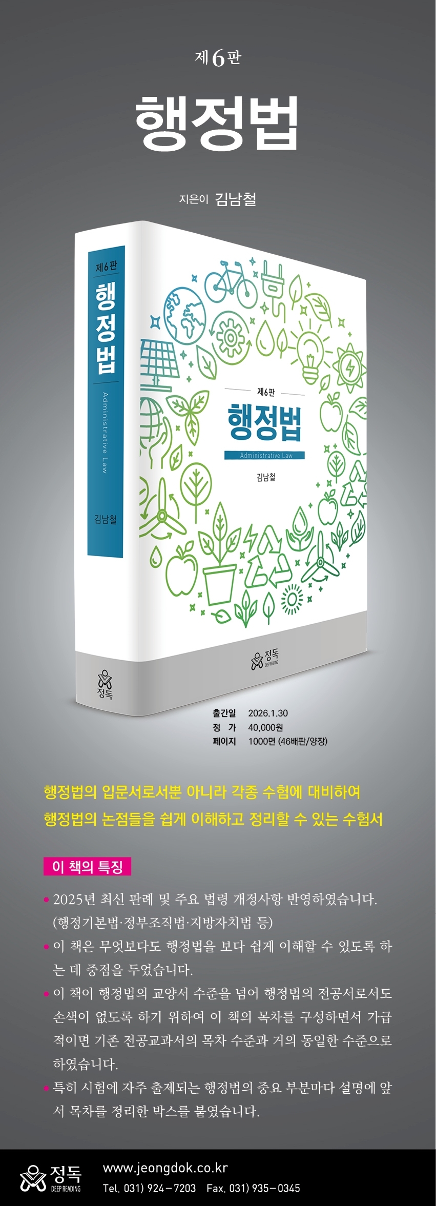 Ã¥¼ÓÀ¸·Î¸Ó¸®¸» ±è³²Ã¶ ±³¼ö´Ô²²¼ Áö³ 2024³â 5¿ù 28ÀÏ ÀÛ°íÇÏ½Ã°í ³ª¼ µÎ ¹øÂ° °³Á¤ÆÇÀÌ Ãâ°£µÇ¾ú½À´Ï´Ù. µ¶ÀÚ ¿©·¯ºÐµéÀÇ ¸¹Àº °ü½É°ú »ç¶ûÀ¸·Î Á¦6ÆÇÀ» Ãâ°£ÇÒ ¼ö ÀÖ°Ô µÈ °Í¿¡ ´ëÇÏ¿© Áø½ÉÀ¸·Î °¨»çµå¸³´Ï´Ù. Á¦6ÆÇÀº ÀÛ°íÇϽŠ±è³²Ã¶ ±³¼ö´Ô²²¼ Àú¼úÇϽбâÁ¸ ±³°ú¼ ¸ñÂ÷¿Í ³»¿ëÀ» À¯ÁöÇϸé¼, 2025³â ÃֽŠÆÇ·ÊÀÇ ÁÖ¿ä ³»¿ë ¹× ÇàÁ¤±âº»¹ý, Á¤ºÎÁ¶Á÷¹ý, Áö¹æÀÚÄ¡¹ý µî °¢Á¾ ¹ý·É Á¦¤ý°³Á¤ »çÇ×À» ¹Ý¿µÇÏ¿© ÇàÁ¤¹ýÀ» °øºÎÇϰųª °¢Á¾ ½ÃÇè¿¡ ´ëºñÇÏ´Â µ¥¿¡ ºÎÁ·ÇÔÀÌ ¾øµµ·Ï ÇÏ¿´½À´Ï´Ù. À̹ø °³Á¤ÀÛ¾÷Àº Á¦5ÆÇÀÇ °³Á¤ÀÛ¾÷°ú ¸¶Âù°¡Áö·Î ±è³²Ã¶ ±³¼ö´ÔÀÇ Á¦ÀÚµéÀÌ Áß½ÉÀÌ µÇ¾î °£ÇàÀ§¿øÈ¸(¿¬¼¼´ëÇб³ ¹æµ¿Èñ ±³¼ö, ºÎ»ê±¤¿ª½Ãû ±è°æÁØ ¹Ú»ç, ´ëÇѹα¹½ÃµµÁö»çÇùÀÇȸ ±èÈñÁø ¹Ú»ç, ºÎ»ê´ëÇб³ ³ë±âÇö ¹Ú»ç, ¼¿ï¿©ÀÚ´ëÇб³ ÀÓÇöÁ¾ ±³¼ö, ºÎ»ê´ëÇб³ ÀåÈ£Á¤ ¹Ú»ç, Çѱ¹¹ý·ÉÁ¤º¸¿ø Á¤ÁÖ¿µ ¹Ú»ç, ¿¬¼¼´ëÇб³ Á¶°¨»ç º¯È£»ç, ±¹¸³Àç³¾ÈÀü¿¬±¸¿ø Á¶¿µÁø ¹Ú»ç¼ö·á)¸¦ Á¶Á÷ÇÏ¿© ÁøÇàÇÏ¿´½À´Ï´Ù. ÀÌ Ã¥À» Ãâ°£ÇØ Áֽеµ¼ÃâÆÇ Á¤µ¶ÀÇ ±èÁß¿ë ´ëÇ¥´Ô, ÀÌ Ã¥ÀÇ ÆíÁý¤ý±³Á¤À» À§ÇÏ¿© ¾Ö½áÁֽнɼºº¸ ÆíÁýÀÌ»ç´Ô°ú ±èÀμ÷ °úÀå´Ô²²µµ Áø½ÉÀ¸·Î °¨»çµå¸³´Ï´Ù. ¹«¾ùº¸´Ùµµ ±è³²Ã¶ ±³¼ö´ÔÀÇ »ç¸ð´Ô°ú ÀÚÁ¦ºÐ(¼®¹Î, ¼®È¯)²²µµ Áø½ÉÀ¸·Î °¨»çµå¸³´Ï´Ù. ³¡À¸·Î ÀÌ Ã¥À» Á¸°æÇÏ°í »ç¶ûÇÏ´Â ±è³²Ã¶ ±³¼ö´Ô²² ¹ÙĨ´Ï´Ù. ÀÌ Ã¥ÀÌ °è¼ÓÇØ¼ µ¶ÀÚ¿¡°Ô »ç¶ûÀ» ¹ÞÀ» ¼ö ÀÖµµ·Ï ³ë·ÂÇϰڽÀ´Ï´Ù. 2026³â 1¿ù ͺ ±è³²Ã¶ ±³¼ö´Ô ÇàÁ¤¹ý °£ÇàÀ§¿øÈ¸ Àϵ¿ |