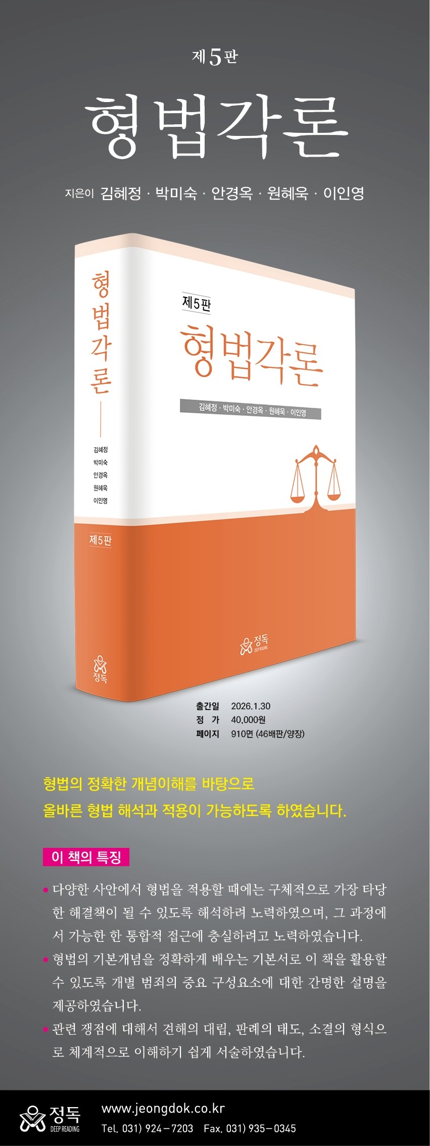 Ã¥¼ÓÀ¸·Î¸Ó¸®¸» Çü¹ýÀº ¿ì¸®ÀÇ »çȸÇö»ó°ú ¹ÐÁ¢ÇÏ°Ô ¿¬°áµÇ¾î ÀÖ´Ù. Çü¹ý¿¡ ¹üÁË·Î ±ÔÁ¤µÇ¾î ÀÖ´ø ÇàÀ§µéµµ ´õ ÀÌ»ó ó¹úÀÇ Çʿ伺ÀÌ ¾ø´Ù°í ÆÇ´ÜµÇ¸é ºñ¹üÁËȵǾî Çü¹ý¿¡¼ »èÁ¦µÇ°í, À̿ʹ ´Þ¸® ½Ã´ëÀÇ º¯È¿¡ µû¶ó »õ·Ó°Ô ó¹úÀÇ Çʿ伺ÀÌ ÀÖ´Â ÇàÀ§°¡ µîÀåÇÏ°Ô µÇ¸é Çü¹ý¿¡ ½Å¼³ÇÏ¿© ¹üÁË·Î ±ÔÁ¤Çϱ⵵ ÇÑ´Ù. 2025. 3. 18. Çü¹ý °³Á¤À» ÅëÇØ °øÁßÇù¹ÚÁË(Á¦116Á¶ÀÇ2), 2025. 4. 8. Çü¹ý °³Á¤À» ÅëÇØ °ø°øÀå¼Ò Èä±â¼ÒÁöÁË(Á¦116Á¶ÀÇ3)°¡ ½Å¼³µÇ¾ú´Ù. °øÁßÇù¹ÚÁË´Â ÃÖ±Ù Á¤º¸Åë½Å¸ÁÀ» ÅëÇØ ºÒƯÁ¤ ¶Ç´Â ´Ù¼öÀÇ »ç¶÷ÀÇ »ý¸í, ½Åü¿¡ ´ëÇÑ ¹üÁ˸¦ ¿¹°íÇÏ´Â »ç·Ê°¡ ¿©·µ ¹ß»ýÇÏ¿© ±¹¹ÎÀÇ ºÒ¾ÈÀÌ Ä¿Áö°í ÀÖÀ½¿¡µµ ÇöÇà¹ý»ó À̸¦ ó¹úÇÏ´Â ±ÔÁ¤ÀÌ ¾ø¾î ±× ´ëÀÀ¿¡ ¾î·Á¿òÀÌ ÀÖ´Ù´Â ¹®Á¦°¡ ÁöÀûµÊ¿¡ µû¶ó ½Å¼³µÈ ¹üÁËÀÌ´Ù. °ø°øÀå¼Ò Èä±â¼ÒÁöÁË´Â Èä±â¸¦ ¼ÒÁöÇÏ°í µµ·Î³ª °ø¿ø µîÀ» ¹èȸÇÒ °æ¿ì »çȸ ÀϹݿ¡ °øÆ÷½ÉÀ» ÁÖ°í Áß´ë ¹üÁË·Î À̾îÁú ¼ö ÀÖÀ½¿¡µµ ÇöÇà¹ýÀ» ÅëÇÑ ´ëÀÀ¿¡ ÇѰ谡 ÀÖ´Ù´Â ¹®Á¦°¡ ÁöÀûµÊ¿¡ µû¶ó ½Å¼³µÈ ¹üÁËÀÌ´Ù. 2025. 12. 23. Çü¹ý °³Á¤À» ÅëÇØ ºÒƯÁ¤ ´Ù¼öÀÇ ÇÇÇØÀÚ¸¦ ´ë»óÀ¸·Î ÇÏ´Â »ç±â¹üÁË¿¡ ´ëÇØ ÇÕ´çÇÏ°Ô Ã³¹úÇϱâ À§ÇØ »ç±âÁË, ÄÄÇ»ÅÍµî »ç¿ë»ç±âÁË ¹× ÁØ»ç±âÁ˸¦ 20³â ÀÌÇÏÀÇ Â¡¿ª ¶Ç´Â 5õ¸¸¿ø ÀÌÇÏÀÇ ¹ú±Ý¿¡ óÇϵµ·Ï ¹ýÁ¤ÇüÀ» °³Á¤ÇÏ¿´´Ù. Çü¹ýÀÇ °³Á¤Àº Çå¹ýÀçÆÇ¼ÒÀÇ ÇÕÇå, À§Çå ¶Ç´Â Çå¹ýºÒÇÕÄ¡ °áÁ¤ µîÀ» ¹Ý¿µÇÏ¿© ÀÌ·ç¾îÁö±âµµ ÇÑ´Ù. ÀÏ·üÀûÀ¸·Î ÇüÀ» ¸éÁ¦Çϴ ģÁ·»óµµ·Ê¸¦ ±ÔÁ¤Çϰí ÀÖ´Â Á¦328Á¶ Á¦1Ç׿¡ ´ëÇÑ Çå¹ýÀçÆÇ¼ÒÀÇ Çå¹ýºÒÇÕÄ¡ °áÁ¤À» ¹Ý¿µÇÏ¿© ±¹È¸´Â 2025. 12. ÀÏÁ¤ÇÑ Àç»ê¹üÁ˸¦ ÁöÀº »ç¶÷ÀÌ ÇÇÇØÀÚ¿Í Ä£Á·ÀÎ °æ¿ì, ÇØ´ç ¹üÁ˸¦ ÇÇÇØÀÚÀÇ °í¼Ò°¡ ÀÖ¾î¾ß °ø¼Ò¸¦ Á¦±âÇÒ ¼ö Àִ ģ°íÁË·Î Çϰí, ÀÌ °æ¿ì Çü»ç¼Ò¼Û¹ý Á¦224Á¶ ¹× ±º»ç¹ý¿ø¹ý Á¦266Á¶ÀÇ Àû¿ë ¹èÁ¦±ÔÁ¤À» µÎ¾î, Àڱ⠶Ǵ ¹è¿ìÀÚÀÇ Á÷°èÁ¸¼ÓÀ» °í¼ÒÇÒ ¼ö ÀÖµµ·Ï °³Á¤ÇÏ¿´´Ù. À̹ø °³Á¤ÆÇ¿¡¼´Â ÀÌ·¯ÇÑ Çü¹ý °³Á¤³»¿ëÀ» ¹Ý¿µÇÏ¿´´Ù. ÀúÀÚµéÀº À̹ø °³Á¤ÆÇ¿¡¼µµ Á¦4ÆÇÀÇ Àü¹ÝÀûÀÎ ³»¿ëÀ» ²Ä²ÄÈ÷ °ËÅäÇÏ¿© ¿ÀÅ»ÀÚ ¼öÁ¤»Ó ¾Æ´Ï¶ó ³»¿ëµµ º¸¿ÏÇÏ¿´°í, º¯°æµÈ ÆÇ·Ê¿Í ÃֽŠÆÇ·Ê¸¦ ¹Ý¿µÇÏ¿© º» Ã¥À» Á¢ÇÏ´Â µ¶ÀÚµéÀÌ Çü¹ý °¢·ÐÀ» ½±°í Á¤È®ÇÏ°Ô ÀÌÇØÇÒ ¼ö ÀÖµµ·Ï Á¤¸®ÇÏ¿´´Ù. 2025³â 12¿ù ÇÑ ÇØ¸¦ ¸¶¹«¸®ÇÏ´Â ³¡ÀÚ¶ô¿¡¼ ¹Ù»Û ÀÏÁ¤¿¡µµ ºÒ±¸Çϰí Á¦5ÆÇ °³Á¤ÆÇÀÇ Ãâ°£À» À§ÇØ ¾Æ³¦¾øÀÌ Áö¿øÀ» ÇØÁֽеµ¼ÃâÆÇ Á¤µ¶ÀÇ ±èÁß¿ë ´ëÇ¥´Ô°ú ÆíÁý, ±³Á¤À» ¸Ã¾ÆÁֽбèÀμ÷ °úÀå´Ô²² Ưº°ÇÑ °¨»ç¸¦ µå¸°´Ù. 2026³â 1¿ù ÀúÀÚ Àϵ¿ |