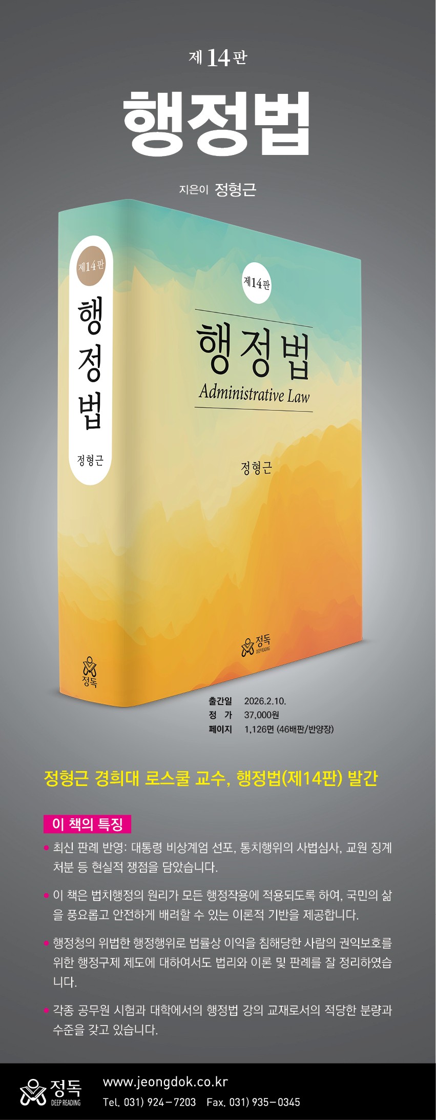 Ã¥¼Ò°³2026³â »õÇØ¸¦ ¸ÂÀÌÇÏ¸é¼ »õ·Î¿î Ã¥ ÇàÁ¤¹ý Á¦14ÆÇÀ» Ãâ°£ÇÏ°Ô µÈ °ÍÀ» °¨»çÇÏ°Ô »ý°¢ÇÑ´Ù. ÇàÁ¤±ÇÀ» Çà»çÇÏ´Â ±¹°¡¿Í Áö¹æÀÚÄ¡´Üü´Â ¹ý¿¡ µû¸¥ ÇàÁ¤ÀÇ ¿øÄ¢À» ÁؼöÇØ¾ß ÇÑ´Ù. ±Ç·ÂÀ» Çà»çÇÏ´Â ±â°üÀº ³²¿ëÀÇ À§ÇèÀÌ Àֱ⠶§¹®¿¡ ¹ýÀÌ Á¤ÇÏ´Â ÅëÁ¦¸¦ ¹Þ¾Æ¾ß ÇÑ´Ù. ¹ýÀÌ ÁöÇâÇÏ´Â Á¤ÀÇ´Â Àû¹ýÇÑ ÀýÂ÷¸¦ ÅëÇØ¼ ±¸ÇöµÇ±â ¶§¹®¿¡ ½ÇüÀû¤ýÀýÂ÷ÀûÀÎ ¹ý¸®ÀÇ ¿¬±¸¿Í Á¦µµÀÇ °³¼±ÀÌ ÇÊ¿äÇÏ´Ù.