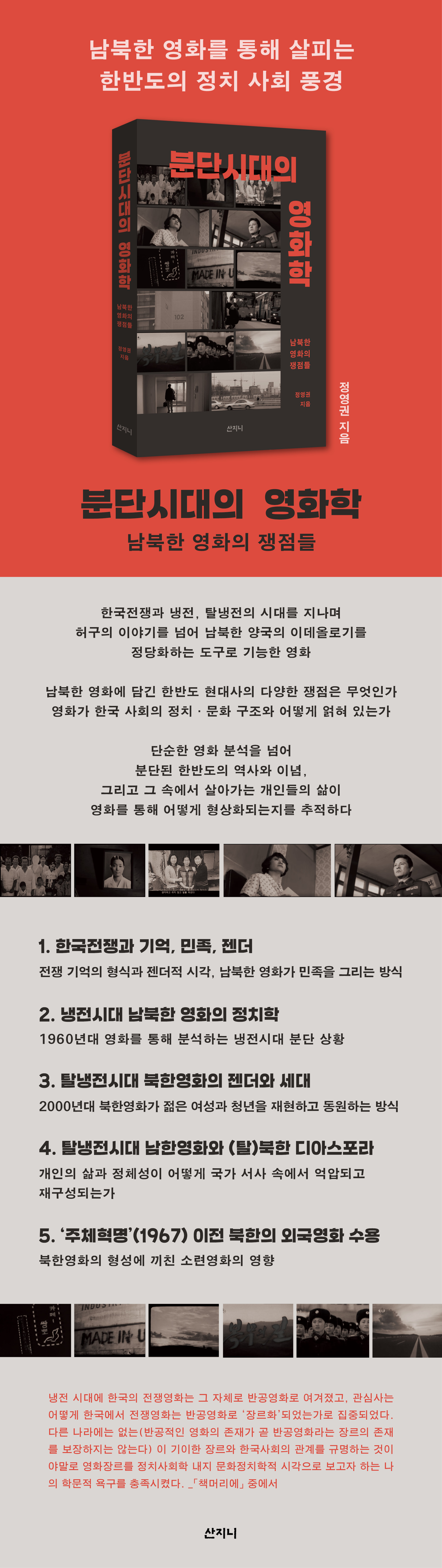 ¿À·§µ¿¾È ÀüÀ¹Ý°ø¡¤ºÐ´Ü¿µÈ À帣¸¦ Á¤Ä¡»çȸÇÐÀû ½Ã°¢À¸·Î ¿¬±¸Çؿ Á¤¿µ±ÇÀº ÀÌ Ã¥¿¡¼ ³²ºÏÇÑ ¿µÈÀÇ ¼»ç¿Í ±× ¹è°æÀ» ºÐ¼®Çϸç Çѱ¹ÀüÀïÀÇ ÀçÇö, ¹Î°£ÀÎ Çлì, Á¨´õ ¹× Å»ºÏÀÚ ¹®Á¦ µîÀ» Á¶¸íÇÑ´Ù. ÀÌ Ã¥Àº ´Ü¼øÇÑ ¿µÈ ºÐ¼®À» ³Ñ¾î, ºÐ´ÜµÈ ÇѹݵµÀÇ ¿ª»ç¿Í À̳ä, ±×¸®°í ±× ¼Ó¿¡¼ »ì¾Æ°¡´Â °³ÀεéÀÇ »îÀÌ ¿µÈ¸¦ ÅëÇØ ¾î¶»°Ô Çü»óȵǴÂÁö¸¦ ÃßÀûÇÑ´Ù.