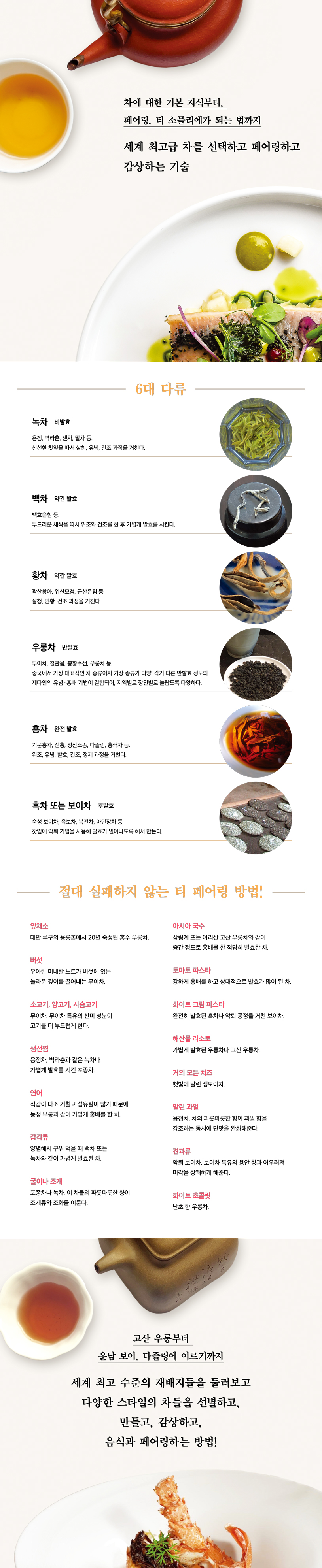 Ƽ Æä¾î¸µÀº ¿ÍÀÎ Æä¾î¸µ°ú ºñ½ÁÇÑ ¹æ½ÄÀ¸·Î À¯·´¿¡¼ óÀ½ Àα⸦ ¾ò¾úÀ¸¸ç, ÀÌÁ¦´Â ±× ¿µÇâÀÌ Àü ¼¼°èÀûÀ¸·Î È®»êµÇ°í ÀÖ´Ù. ¿©·¯ °¡Áö ¸é¿¡¼ Ƽ Æä¾î¸µÀº ¿ÍÀÎ Æä¾î¸µ°ú ºñ½ÁÇÏ´Ù. ¿ÍÀΰú ¸¶Âù°¡Áö·Î Â÷µµ ¾Æ·Î¸¶, ¸À, º¸µð°¨, µÞ¸À µîÀÌ º¯È¹«½ÖÇÏ°Ô ÆîÃÄÁø´Ù. ¶ÇÇÑ ¿ÍÀΰú ¸¶Âù°¡Áö·Î Â÷µµ Å×·ç¾Æ¿Í ±ä¹ÐÇÏ°Ô ¿¬°áµÇ¾î ÀÖ°í, Â÷¸¦ ÇÑ ¸ð±Ý ¸¶½Ç ¶§¸¶´Ù ±× Â÷ÀÇ µ¶Æ¯ÇÑ Å×·ç¾Æ´Â ¹°·Ð ¼ö¼¼±â¿¡ °ÉÄ£ ÀüÅë°úµµ À̾îÁø´Ù. Â÷¸¦ À½¹ÌÇÏ°í °¨»óÇϸé¼, ¾Æ·Î¸¶, ´Ü¸À, µÞ¸À, »ýµ¿°¨, ±×À¹ÇÔ µî Â÷ÀÇ Æ¯¼ºÀ» ÀνÄÇÏ°Ô µÇ´Â °ÍÀÌ´Ù. Â÷¸¦ À½½Ä°ú °áÇÕÇϸé ÀÌ·¯ÇÑ ÀνÄÀÌ À½½ÄÀÇ ¾Æ·Î¸¶¿Í ¸ÀÀ» ¼ö¿ëÇÏ´Â µ¥±îÁö È®ÀåµÈ´Ù. ¹«¾ùº¸´Ùµµ °¡Àå ¸Å·ÂÀûÀÎ Á¡Àº, ¾î¶°ÇÑ ¹æ½ÄÀ¸·Î ´Ù¾çÇÑ Â÷µéÀÌ À½½Ä°ú Æä¾î¸µµÇ¾î ¸À°ú ÇâÀ» Çâ»ó½ÃŰ´ÂÁö, ¾î¶»°Ô ´õ ½Ä»ç¸¦ Áñ°Ì°Ô ÇÒ ¼ö ÀÖ´ÂÁö¸¦ ½ÃµµÇغ¼ ¼ö ÀÖ´Ù´Â °ÍÀÌ´Ù.