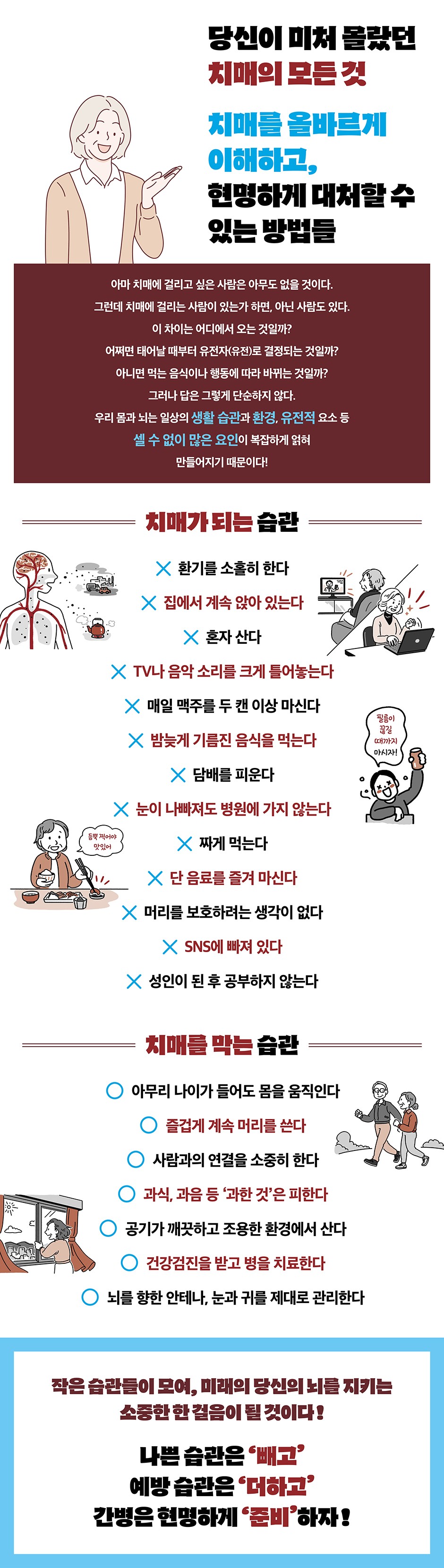 Á¦1Àå Ä¡¸Å¿¡ °É¸®´Â »ç¶÷ÀÇ »ýȰ ½À°ü ¿©±â¼ ¿Ö ±Í À̾߱⸦ ÇÏ´À³Ä Çϸé, »ç½Ç ³Ã»ÀÌ Ä¡¸Å À§Çè ¿äÀÎ °¡¿îµ¥, Àα¸ Àüü¸¦ ±âÁØÀ¸·Î º¸¾ÒÀ» ¶§ °¡Àå Å« ¿µÇâÀ» ¹ÌÄ¡´Â ¿äÀÎÀ¸·Î ¾Ë·ÁÁ® Àֱ⠶§¹®ÀÌ´Ù. ³ëȳª ´Ù¸¥ °Ç° ¹®Á¦¿Í´Â µ¶¸³ÀûÀ¸·Î, û·Â ÀúÇÏ ÀÚü°¡ Ä¡¸Å À§ÇèÀ» Å©°Ô ³ôÀÏ ¼ö ÀÖ´Ù´Â °ÍÀÌ´Ù. Á¦1Àå Ä¡¸Å¿¡ °É¸®´Â »ç¶÷ÀÇ »ýȰ ½À°ü ÀÌ·± ¿¬±¸ °á°ú¸¦ Á¾ÇÕÇØº¸¸é, ¿µ¾çÁ¦(¼Çø®¸ÕÆ®)°¡ Ä¡¸Å ¿¹¹æ¿¡ µµ¿òÀÌ µÈ´Ù°í È®½ÇÈ÷ ¸»Çϱâ´Â ¾î·Æ´Ù. ºÐ¸í ÀϺΠȿ°ú°¡ ±â´ëµÇ´Â ¿µ¾çÁ¦µµ ÀÖÁö¸¸, ±×Á¶Â÷ Áö±ÝÀ¸·Î¼´Â È®½ÇÇÏÁö ¾Ê´Ù. ¶ÇÇÑ ´ëºÎºÐÀÇ ¿µ¾çÁ¦°¡ ±ÇÀå·®À» ÁöŰ¸é ¾ÈÀüÇÏ´Ù°í ¾Ë·ÁÁ® ÀÖÁö¸¸, ¾à¹°°úÀÇ »óÈ£ÀÛ¿ëÀ¸·Î À§ÇèÀÌ ÀÖÀ» ¼ö ÀÖ°í, Àå±â°£ º¹¿ëÇÒ °æ¿ì ±× ¾ÈÀü¼ºµµ ¸íÈ®È÷ ¹àÇôÁöÁö ¾ÊÀº °æ¿ì°¡ ¸¹´Ù. Á¦2Àå »ç½ÇÀº Ä¡¸Å ¿¹¹æ¿¡ È¿°ú°¡ ¾ø´Â °Íµé ¿îµ¿ÀÌ ÀÎÁö ±â´É¿¡ À¯ÀÍÇÑ ÀÌÀ¯·Î´Â ¿îµ¿À» ÅëÇØ Ç÷¾× ¼øÈ¯ÀÌ ÁÁ¾ÆÁ® ³ú ±â´ÉÀÌ °³¼±µÈ´Ù´Â Á¡ÀÌ ²ÅÈù´Ù. ÀÌ·Î ÀÎÇØ ³úÀÇ ½Å°æ¼¼Æ÷°¡ »õ·Î ž°í ¿°ÁõÀÌ »ý±â±â ¾î·Á¿öÁö´Â °ÍÀÌ´Ù. ¶ÇÇÑ ¿îµ¿À» ²ÙÁØÈ÷ ÇÏ´Â »ç¶÷Àº °ÅÀÇ ¿îµ¿ÇÏÁö ¾Ê´Â »ç¶÷¿¡ ºñÇØ ³úÀÇ ¿ëÀûÀÌ ´õ Å« °æÇâÀÌ ÀÖ´Ù. ³ú ¿ëÀûÀÌ Å©´Ù´Â °ÍÀº ³ú °Ç°ÀÌ ÁÁÀ» ¼ö ÀÖ´Ù´Â °¡´É¼ºÀ» ÀǹÌÇÑ´Ù. Á¦3Àå Ä¡¸Å¿¡ °É¸®Áö ¾Ê´Â »ç¶÷ÀÇ »ýȰ ¹æ½Ä ¿¹¸¦ µé¾î, ¾Õ¿¡¼ ¼Ò°³ÇÑ Çѱ¹ÀÇ ´ë±Ô¸ð ¿¬±¸¿¡¼´Â ±Ý¿¬ÇÑ »ç¶÷ÀÌ °è¼Ó ´ã¹è¸¦ ÇÇ¿î »ç¶÷º¸´Ù Ä¡¸Å À§ÇèÀÌ ³·¾Ò´Ù. ƯÈ÷ 65¼¼ ¹Ì¸¸¿¡¼ ±Ý¿¬ÇßÀ» ¶§ È¿°ú°¡ ´õ ¶Ñ·ÇÇß´Ù. ÀÌ·± ¿¬±¸ °á°ú¿¡¼, Áö±Ý±îÁö Èí¿¬À» ÇÑ »ç¶÷ÀÌ¶óµµ ±Ý¿¬À» ÇÏ¸é °è¼Ó ÇÇ¿üÀ» ¶§º¸´Ù Ä¡¸Å À§ÇèÀ» ÁÙÀÏ ¼ö ÀÖ´Ù »ý°¢µÈ´Ù. ¶Ç À½ÁÖ ½À°ü¿¡ ´ëÇÑ ¿¬±¸ °á°úµµ ÀÖ´Ù. ¾à 400¸¸ ¸íÀ» ´ë»óÀ¸·Î ÇÑ Çѱ¹ÀÇ ¿¬±¸¿¡ µû¸£¸é, ÇÏ·ç Æò±Õ ĵ¸ÆÁÖ µÎ ĵ ³Ñ°Ô ¸¶½Ã´ø »ç¶÷ÀÌ ÀýÁÖ¿¡ ¼º°øÇϸé Ä¡¸Å À§ÇèÀÌ ÁÙ¾îµé¾ú´Ù. üÁß °ü¸®¿¡¼µµ °úüÁß È¤Àº ºñ¸¸ÀÎ »ç¶÷À» ´ë»óÀ¸·Î ÇÑ ¿¬±¸¿¡¼, ´Ü 2kg °¨·®¸¸À¸·Îµµ ÀÎÁö ±â´ÉÀÌ Çâ»óµÇ¾ú´Ù´Â °á°ú°¡ ÀÖ´Ù. Á¦3Àå Ä¡¸Å¿¡ °É¸®Áö ¾Ê´Â »ç¶÷ÀÇ »ýȰ ¹æ½Ä ÀÌ ¶§¹®¿¡ Ä¡¸ÅÀÇ Á¶±â Áø´ÜÀº ¹Ýµå½Ã ÀûÀýÇÑ Áö¿ø ü°è°¡ ÇÔ²² ¸¶·ÃµÇ¾î¾ß ÇÑ´Ù. ±×·³¿¡µµ º»Àΰú °¡Á·ÀÌ ¾ÕÀ¸·ÎÀÇ »îÀ» ±àÁ¤ÀûÀ¸·Î À̾±â À§ÇÑ Áß¿äÇÑ Ãâ¹ßÁ¡À̶ó´Â Á¡¿¡¼ Á¶±â Áø´ÜÀÇ Àǹ̴ ũ´Ù. °¡´ÉÇÑ ÇÑ »¡¸® Àü¹®°¡¿Í »ó´ãÇϰí ÇÊ¿äÇÑ Áö¿øÀ» ¹Þ´Â °ÍÀÌ ºÒ¾ÈÀ» ÁÙÀÌ°í ¹Ì·¡¸¦ ÁغñÇÏ´Â µ¥ µµ¿òÀÌ µÈ´Ù. ´Ù¸¸, Áõ»óÀÌ ¾ø´Â »ç¶÷¿¡°Ô Ä¡¸Å °Ë»ç¸¦ ÇÏ´Â °ÍÀÇ ÀåÁ¡¿¡ ´ëÇØ¼´Â ¾ÆÁ÷ ÃæºÐÇÑ ±Ù°Å°¡ ¾ø´Ù. ÀÌ ¶§¹®¿¡ ¹Ì±¹ ¿¹¹æÀÇÇÐÀü¹®À§¿øÈ¸(USPSTF)´Â Áõ»óÀÌ ¾ø´Â °í·ÉÀÚ¿¡°Ô Ä¡¸Å °Ë»ç¸¦ ½ÃÇàÇÏ´Â °ÍÀ» ±ÇÀåÇÏÁö ¾Ê´Â´Ù. Áï, ¿©±â¼ ¸»ÇÏ´Â °Ë»ç´Â ¾îµð±îÁö³ª ¡®Ä¡¸Å°¡ ÀǽɵǴ Áõ»óÀÌ ÀÖ´Â »ç¶÷¡¯À» À§ÇÑ °ÍÀÌ´Ù. Á¦4Àå Ä¡¸Å¿¡ °É·Áµµ Á¤¸» ÇÊ¿äÇÑ °Ç ÀÌ°Í»Ó ÃâÆÇ»ç ¼Æò³ª»Û ½À°üÀº ¡®»©°í¡¯,