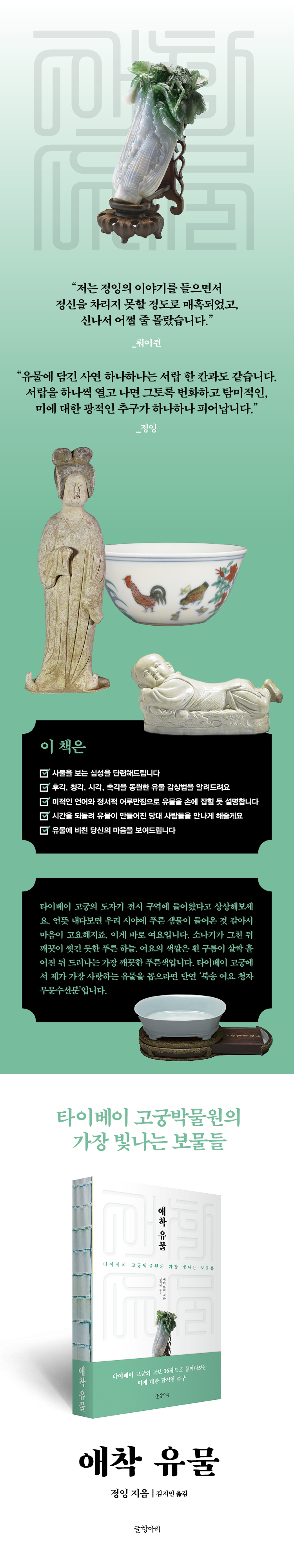 À¯¹°À» °¨»óÇÏ·Á¸é, ÇØ¼³ÇÏ·Á¸é ÀÌ »ç¶÷ó·³ ÇØ¾ß ÇÑ´Ù°í ¸»ÇÒ ¼ö Àִ åÀÌ ÀÖ´Ù. ¹Ù·Î Á¤À×ÀÇ ¡º¾ÖÂø À¯¹°¡»ÀÌ´Ù. °¨½Ä¾È°ú ÇØ¼®, ÇØ¼³, ±Û¾²±â¿¡¼ ¹ß±ºÀÇ ±âÁö¸¦ ¹ßÈÖÇϰí ÀÖ´Ù. Áß±¹ °íÀü¹®ÇÐÀ» Àü°øÇÑ ÀúÀÚ´Â ÀÇ´ë¿¡¼ ÇлýµéÀ» °¡¸£Ä£´Ù. ±×·±µ¥ »çÈêÀÌ ¸Ö´Ù Çϰí À̵é°ú ÇÔ²² ŸÀ̺£ÀÌ °í±Ã¹Ú¹°¿ø¿¡ °£´Ù. ¹®ÅÎÀÌ ´â°í ½Å¹ßâÀÌ ÇØÁö´Â ¸¸Å À¯¹°¿¡ ´ëÇÑ ¹Ú½Ä°ú ¾ÖÁ¤ÀÌ ±í¾îÁ®, ÃÑ 36Á¡ÀÇ º¸¹°À» ¼Ò°³ÇÏ´Â µ¥ 500ÂÊ ºÐ·®ÀÇ Ã¥À» ¾²°Ô µÆ´Ù. ÀúÀÚ´Â ¿ª»çÀû ÁöÃþÀ» ¼¼¹ÐÈÇϰí, ÇØ¼®À» ´Ù¾çÈÇϸç, ±ÛÀÇ °áÀ» dzºÎÈ÷ ÇÏ¸é¼ ÃÑõ¿¬»ö À¯¹° ÇØ¼³À» ¼±º¸ÀδÙ.