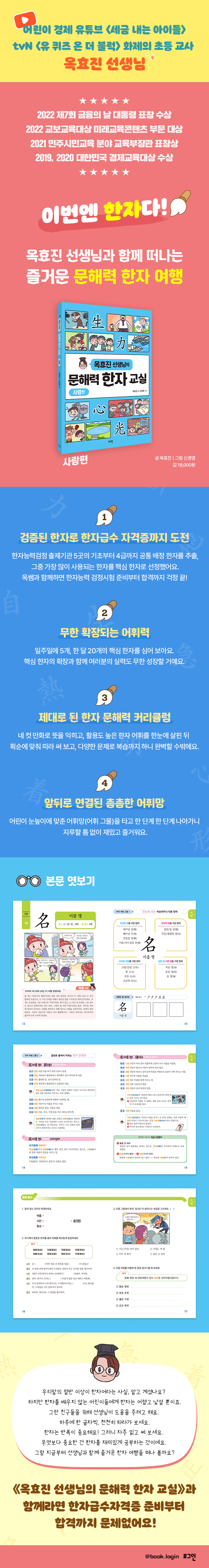 ÀÌ Ã¥ ¡¶¿ÁÈ¿Áø ¼±»ý´ÔÀÇ ¹®ÇØ·Â ÇÑÀÚ ±³½Ç¡·Àº ¸ÅÀÏ ÇÑ °³ÀÇ ÇÑÀÚ¸¦ °øºÎÇÏ´Â °úÁ¤¿¡¼ ÇÑÀÚ¿Í Ä£ÇØÁú ¼ö ÀÖ°Ô ¸¸µç ¡®Âü ½¬¿î ÇÑÀÚ ÇнÀ¼¡¯´Ù. ¾î¸°ÀÌ °æÁ¦ ºÐ¾ß º£½ºÆ®¼¿·¯ ¡¶¼¼±Ý ³»´Â ¾ÆÀ̵顷°ú °ú¸ñº° °³³ä ÇнÀ¼ ¡¶¿ÁÈ¿Áø ¼±»ý´ÔÀÇ °³³ä »çÀü ½Ã¸®Áî¡··Î ´ëÇѹα¹ ¸ðµç ¾î¸°À̵éÀÇ ¼±»ý´ÔÀ¸·Î ÀÚ¸®¸Å±èÇÑ ¿ÁÈ¿Áø ÀÛ°¡°¡ »õ·Ó°Ô ¼±º¸ÀÌ´Â ÇнÀ ±³¾ç ½Ã¸®ÁîÀ̱⵵ ÇÏ´Ù. ¡®»ç¶÷Æí¡¯°ú ¡®¼ýÀÚÆí¡¯ÀÇ Ãâ°£À» ½ÃÀÛÀ¸·Î ¡®ÀÚ¿¬Æí¡¯, ¡®»çȸÆí¡¯, ¡®±³¾çÆí¡¯, ¡®»ýȰÆí¡¯±îÁö À̾îÁú ÀÌ Ã¥À» ÅëÇØ ¿ì¸® ¾î¸°À̵éÀÌ ¸»°ú ±ÛÀ» Á» ´õ Àß ÀÌÇØÇϰí, ¼¼»ó º¸´Â ´«À» ´õ¿í ³ÐÈú ¼ö Àֱ⸦ ±â´ëÇÑ´Ù. ÇÙ½É ÄÛÄÛ! Àç¹Ì ¾¦¾¦! ¾îÈַ°ú ¹®ÇØ·ÂÀÌ µ¿½Ã¿¡ ³ô¾ÆÁö´Â Áñ°Å¿î ÇÑÀÚ °øºÎ.