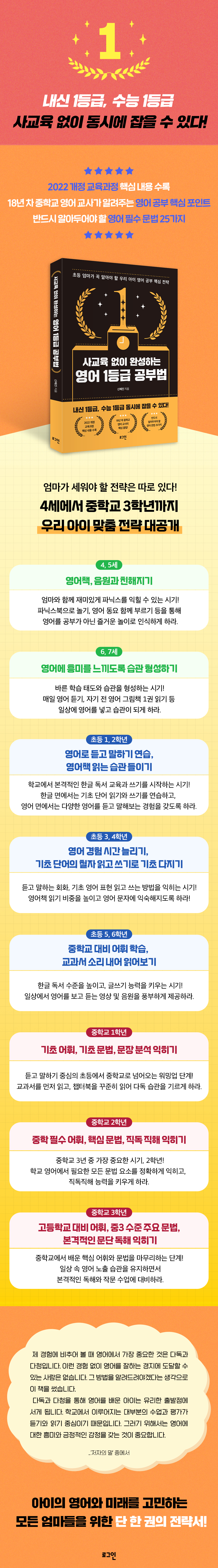 _1Àå ¡®¿µ¾î ÀßÇÏ´Â ¾ÆÀ̵éÀº ¹«¾ùÀÌ ´Ù¸¦±î?¡¯ Áß¿¡¼ 2022 °³Á¤ ÃÊ¡¤ÁßµîÇб³ ¹× Ư¼ö±³À° ±³À°°úÁ¤ È®Á¤¡¤¹ßÇ¥ º¸µµ ÀÚ·á¿¡ µû¸¥ ±³°ú ±³À°°úÁ¤ÀÇ ÁÖ¿ä °³Á¤ ³»¿ëÀº µÎ °¡Áö·Î Á¤¸®ÇÒ ¼ö ÀÖ´Ù. ù°, ÇÙ½É ¾ÆÀ̵ð¾î¸¦ Áß½ÉÀ¸·Î ÇнÀ ³»¿ëÀ» ÀûÁ¤ÈÇÏ°í ¿ª·®À» Ű¿ì´Â µ¥ ÃÊÁ¡À» µÐ´Ù. ¿ì¸® ¾ÆÀ̵éÀº ÀÌÁ¦ ÀÚ½ÅÀÇ »î°ú ¿¬°èµÈ ½Ç»ýȰÀÇ ¸Æ¶ô ¼Ó¿¡¼ ±íÀÌ ÀÖ´Â ÇнÀÀ» Çϰí, ±³°ú ³»¿ë °£ÀÇ ¿¬°è¼ºÀ» °ÈÇÏ¿© Á¾ÇÕÀû¡¤À¶ÇÕÀûÀ¸·Î Áö½ÄÀ» ¹è¿ì¸ç, ±× °úÁ¤¿¡¼ ¹Ì·¡ »çȸ¿¡ ÇÊ¿äÇÑ ¿ª·®À» Ű¿ì°Ô µÉ °ÍÀÌ´Ù. µÑ°, ÇнÀ ¿ª·®À» ±â¸¦ ¼ö ÀÖ´Â ´Ù¾çÇÑ Çлý ÁÖµµÇü ¼ö¾÷À» ÅëÇØ ÇнÀÀÚ ÁÖµµ¼ºÀ» ±â¸£µµ·Ï °Á¶ÇÑ´Ù. À̸¦ À§ÇØ ºñÆÇÀû Áú¹®, ÅäÀÇ¡¤Åä·Ð ¼ö¾÷, Çù¾÷ ¼ö¾÷ µî ´Ù¾çÇÑ ¹®Á¦ ÇØ°á »óȲ¿¡ ´ëÇØ Àڱ⠴ɷ°ú ¼Óµµ¿¡ ¸ÂÃß¾î ÀڽŸ¸ÀÇ ¹æ½ÄÀ¸·Î ÇнÀ ¿ª·®À» ±â¸¦ ¼ö ÀÖµµ·Ï ±âȸ¸¦ Á¦°øÇÑ´Ù. _1Àå ¡®2022 °³Á¤ ±³À°°úÁ¤, ¹«¾ùÀÌ ´Þ¶óÁ³À»±î?¡¯ Áß¿¡¼ Çб³ ³»½Å ½ÃÇèÀº »ýȰ ¼Ó¿¡¼ ¿µ¾î·Î º¸±â, µè±â, Àб⸦ ÅëÇØ ¿µ¾î¿¡ ÃæºÐÈ÷ ³ëÃâµÈ °æ¿ì¶ó¸é ±³°ú ½Ã°£¿¡ ¼ö¾÷À» µè°í º¹½ÀÇÏ´Â °Í¸¸À¸·Îµµ ÁÁÀº °á°ú¸¦ ¾òÀ» ¼ö ÀÖ´Ù. ÁßÇб³ ¿µ¾î ±³À° °úÁ¤Àº ±ÛÀ» Àаí ÀÌÇØÇÒ ¼ö ÀÖ´Â ¹®Çط°ú Çб³ ¼ö¾÷À» µû¶ó°¥ ¼ö ÀÖ´Â ÇнÀ·ÂÀ» °®Ãß¾úÀ¸¸é Å©°Ô ¾î·ÆÁö ¾Ê±â ¶§¹®ÀÌ´Ù. ±×·¯³ª ¼ö´É ½ÃÇè¿¡¼ °íµæÁ¡À» ¾òÀ» ¼ö ÀÖ´Â ½Ç·ÂÀ» °®Ãß±â À§Çؼ´Â Ã»ÇØ, ¾îÈÖ, ¹®¹ý, µ¶ÇØ ³× °¡Áö¸¦ ²ÙÁØÈ÷ ÇнÀÇØ¾ß ÇÑ´Ù. ÀÌ ³× °¡Áö ¿µ¿ªÀ» ¸ÅÀÏ Á¶±Ý¾¿ ²ÙÁØÈ÷ ÇØ¾ß ¼ö´É ½ÃÇè¿¡¼ ¸¸Á·ÇÒ ¸¸ÇÑ °á°ú¸¦ ¾òÀ» ¼ö ÀÖ´Ù. ¿©±â¼ Æ÷ÀÎÆ®´Â ¡®Á¶±Ý¾¿¡¯ÀÌ´Ù. Á¶±Ý¾¿, ¾Æ½¬¿ï Á¤µµ·Î ÇØ¾ß ¸ÅÀÏ ±×¸®°í ²ÙÁØÈ÷ ÇØ³ª°¥ ¼ö ÀÖ´Ù. ¿µ¾î´Â °¨°¢À» ÀÍÈ÷°í, Çѹø ÀÍÈù °¨°¢À» ÀÒÁö ¾Ê´Â °ÍÀÌ Áß¿äÇÏ´Ù. ¡®°¡´Ã°í ±æ°Ô¡¯ °¡¾ß ÇÏ´Â °ú¸ñÀÓÀ» Àؾ ¾È µÈ´Ù. _2Àå ¡®¿Ö ¿µ¾î¸¦ °øºÎÇϳª¿ä?¡¯ Áß¿¡¼ ¿µ¾îÀÇ °æ¿ì ÅÂ¾î³ ÀÌÈÄ µè±â ÀÎDz ¾çÀÌ ¾ÆÀ̸¶´Ù ´Ù¸£´Ù. ¾î·Á¼ºÎÅÍ ¿µ¾î ÀÎDzÀÇ Á߿伺À» ¾Æ´Â ºÎ¸ð´Â µè±â ½Ã°£À» ÃÖ´ëÇÑ È®º¸ÇÏ¿© ¾ÆÀ̰¡ ÀÎDz(µè±â)¿¡¼ ¾Æ¿ôDz(¸»Çϱâ) ¼öÁØ¿¡ À̸£°Ô ÁغñÇÑ´Ù. ¹Ý´ë·Î ¿µ¾î¸¦ °ÅÀÇ Á¢ÇÏÁö ¾Ê°í ¼ºÀåÇÑ ¾ÆÀÌ´Â ¿µ¾î¿¡ ¹«°ü½ÉÇϰųª ¿µ¾î¿¡ ºÎÁ¤ÀûÀÎ °¨Á¤À» °¡Áú ¼ö ÀÖ´Ù. ÇÏÁö¸¸ Ãʵî 3, 4ÇгâºÎÅÍ º»°ÝÀûÀÎ ¿µ¾î ÇнÀÀÌ ÀÌ·ç¾îÁö´Â ¸¸Å ±× Àü¿¡ ¿µ¾î¸¦ Á¢ÇÑ °æÇèÀÌ ¾ø´Â ¾ÆÀ̶ó ÇÒÁö¶óµµ Àû±âÀÎ 1, 2ÇгâÀ» ³õÃļ´Â ¾È µÈ´Ù. Ãʵî 1, 2ÇгâÀº ÇÑ±Û ¸é¿¡¼´Â ±âÃÊ ÇÑ±Û ´Ü¾î Àбâ¿Í ´Ü¾î ¾²±â¸¦ ¿¬½ÀÇϰí, ¿µ¾î ¸é¿¡¼´Â ´Ù¾çÇÑ ¿µ¾î¸¦ µè°í ¸»Çغ¸´Â °æÇèÀ» °®´Â °ÍÀ» ¸ñÇ¥·Î ÇÑ´Ù. À̶§´Â ¹ÌÃëÇÐ ¾Æµ¿ÀÌ ÇѱÛÀ» Á¢ÇÑ ¼öÁØÀ¸·Î °¡º±°Ô ¿µ¾î¸¦ µè°í ¸»ÇÒ ±âȸ¿Í µ¶¼ °æÇèÀ» Á¦°øÇÏ´Â Á¤µµ¸é ÃæºÐÇÏ´Ù. _3Àå ¡®Ãʵî 1, 2Çгâ: ¿µ¾î·Î µè°í ¸»Çϱ⠿¬½À, ¿µ¾îÃ¥ Àд ½À°ü µéÀ̱⡯ Áß¿¡¼ Ãʵî 5, 6ÇгâÀº ³í¸®Àû »ç°í·ÂÀÌ ¹ß´ÞÇÔ¿¡ µû¶ó ÇÑ±Û µ¶¼ ¼öÁØÀ» ³ôÀ̰í, ±Û¾²±â ´É·ÂÀ» Ű¿ì´Â ½Ã±â´Ù. ¿µ¾î¿¡ À־µ ´Ù¾çÇÏ°í ¾î·Á¿î ÁÖÁ¦¸¦ ÀÌÇØÇÒ ¼ö ÀÖ´Â ½Ã±âÀ̹ǷΠÀϻ󿡼 ¿µ¾î¸¦ º¸°í µè´Â ¿µ»ó ¹× À½¿ø ÀڷḦ dzºÎÇÏ°Ô Á¦°øÇØÁÖ´Â °ÍÀÌ ÁÁ´Ù. ÇÏ·ç ¿µ»ó 1Æí, ¿µ¾îÃ¥ À½¿ø 1°³ µè±â ·çƾÀ» À̾µÇ ¿µ»óÀº ¿µÈ³ª ¾Ö´Ï¸ÞÀ̼ǻӸ¸ ¾Æ´Ï¶ó ´ÙÅ¥¸àÅ͸®±îÁö, À½¿øÀº ¼Ò¼³°ú ¹®ÇÐ ¿Ü¿¡ °úÇÐÀ̳ª ¿ª»ç, »çȸ µî ºñ¹®ÇÐ Áö¹®±îÁö È®´ëÇÏ¿© Á¢Çϵµ·Ï ÇØÁØ´Ù. º»°ÝÀûÀÎ Àбâ, ¾²±â ±³À°ÀÌ ½ÃÀ۵Ǵ ¸¸Å ¿µ¾îÃ¥Àº ¸®´õ½ººÏ»Ó¸¸ ¾Æ´Ï¶ó ±×¸²ÀÌ ÀûÀýÈ÷ Æ÷ÇÔµÈ ÂªÀº È£ÈíÀÇ AR 2~3Á¡´ë éÅͺϱîÁö È®ÀåÇØ ÁÖ´Â °ÍÀÌ ÁÁ´Ù. ¿µ¾îÃ¥ Àб⠼öÁØÀ» ÇÑ ¹ø¿¡ ²ø¾î¿Ã¸®·Á Çϱ⺸´Ù´Â ¾ÆÀÌÀÇ ÇÑ±Û µ¶¼ ¼öÁذú °ü½É ÁÖÁ¦¸¦ °í·ÁÇÏ¿© ¼øÂ÷ÀûÀ¸·Î ³ô¿©¾ß È¿°úÀûÀÌ´Ù. _3Àå ¡®Ãʵî 5, 6Çгâ: ÁßÇб³ ´ëºñ ¾îÈÖ ÇнÀ, ±³°ú¼ ¼Ò¸® ³»¾î Àо±â¡¯ Áß¿¡¼ ¿µ¾î °øºÎ¿¡ ÀÖ¾î ÁßÇб³ 2ÇгâÀº ÁßÇб³ 3³â Áß °¡Àå Áß¿äÇÑ ½Ã±â´Ù. 1ÇгâÀº µè°í ¸»Çϱâ Áß½ÉÀÇ ÃÊµî ±³À°°úÁ¤¿¡¼ ÁßÇб³ ±³À°°úÁ¤À¸·Î ³Ñ¾î¿À´Â ¿ö¹Ö¾÷ ´Ü°è´Ù. 2ÇгâÀº Çб³ ¿µ¾î¿¡¼ ÇÊ¿äÇÑ ¸ðµç ¹®¹ý ¿ä¼Ò¸¦ ´Ù·ç°í, Çʼö ¾îÈÖ¸¦ ¹ÙÅÁÀ¸·Î °¢ ¹®ÀåÀ» Á¤È®ÇÏ°Ô ÇØ¼®ÇÏ´Â Á÷µ¶Á÷ÇØ¸¦ ¹è¿ì´Â ´Ü°è´Ù. ±×¸®°í 3ÇгâÀº 2Çг⠶§ ¹è¿î ¾îÈÖ¿Í ¹®¹ý ¿ä¼Ò¸¦ ¹ÙÅÁÀ¸·Î ¸î °¡Áö °í±Þ ¿µ¹®¹ýÀ» Ãß°¡·Î ¹è¿ì´Â ½Ã