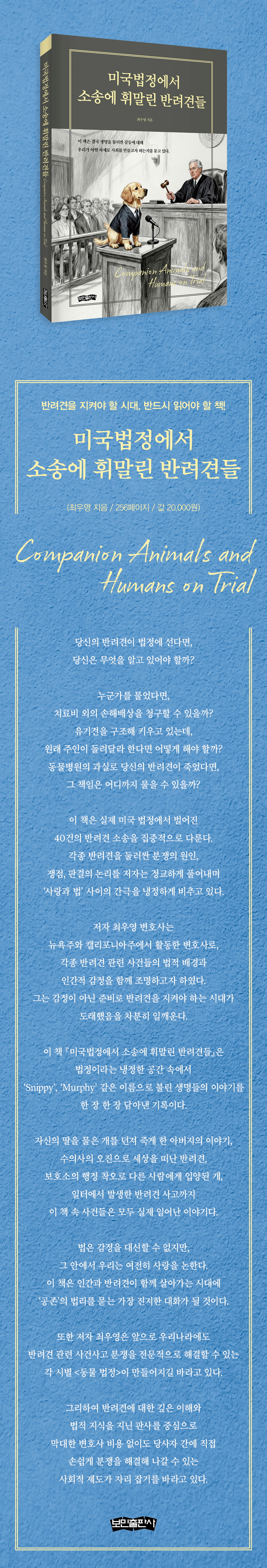 ¹«¾ùº¸´Ù Àλó ±íÀº Á¡Àº, ÀúÀÚ°¡ ´Ü¼øÇÑ ¹ý·ü ÇØ¼³ÀÚ¿¡ ¸Ó¹«¸£Áö ¾Ê°í, »ç°Ç À̸éÀÇ Àΰ£Àû °¨Á¤±îÁö ÇÔ²² µé¿©´Ùº»´Ù´Â Á¡ÀÌ´Ù. °¢ Àå¿¡´Â ÆÇ°á ´ë»óÀÌ µÈ ¹Ý·Á°ßÀÇ À̸§°ú ÇÔ²², ±×µéÀÇ »ý¾Ö¿Í º¸È£ÀÚ¿ÍÀÇ °ü°è°¡ °£°áÇÏÁö¸¸ µû¶æÇÏ°Ô ±â·ÏµÇ¾î ÀÖ´Ù. ÀúÀÚ´Â ¡®Snippy¡¯³ª ¡®Murphy¡¯¶ó´Â À̸§À» ÅëÇØ, ¹ý ¾Õ¿¡¼Á¶Â÷ °³°¡ ´Ü¼øÇÑ ¹°°ÇÀÌ ¾Æ´Ï¶ó ÇÑ °¡Á·ÀÇ ÀÏ¿øÀ̾ú´Ù´Â »ç½ÇÀ» ÀØÁö ¾Ê°Ô ÇÑ´Ù. ÀÌ Ã¥Àº °á±¹ »ý¸íÀ» µÑ·¯½Ñ °¥µî¿¡ ´ëÇØ, ¿ì¸®°¡ ¾î¶² ÀÚ¼¼·Î »çȸ¸¦ ¸¸µé°íÀÚ ÇÏ´ÂÁö¸¦ ¹¯°í ÀÖ´Ù.