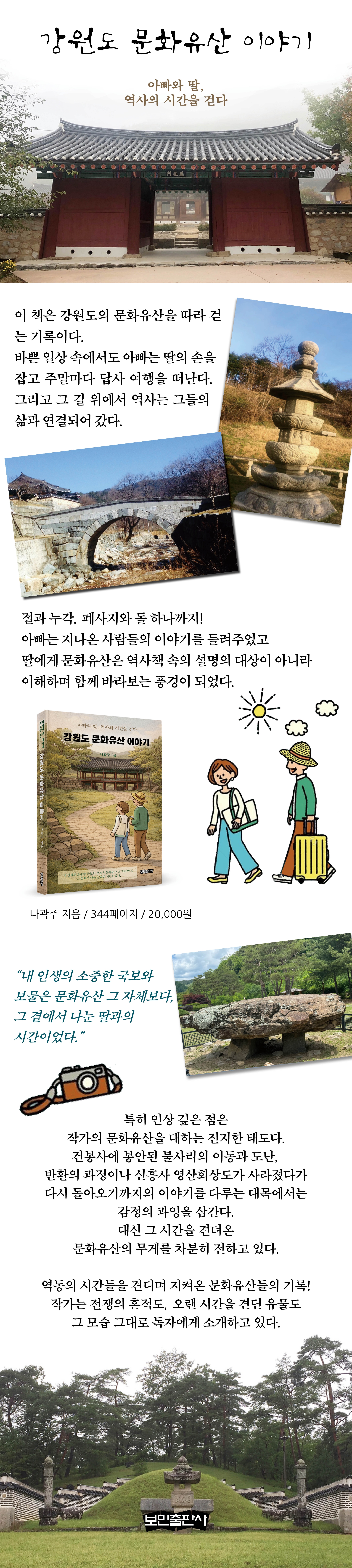 ¡°»ïÈ»ç ¾Æ·§¸¶À»¿¡ »ç´Â ÇÑ ³óºÎÀÇ ¾Æ³»°¡ ºÎó´ÔÀ» ã¾Æ¿Í ¿Â ¸¶À»¿¡ Àü¿°º´ÀÌ Ã¢±ÈÇØ ³²ÆíÀ̸ç ÀÚ½ÄÀÌ ´Ù Á×°Ô »ý°åÀ¸´Ï »¡¸® ³´°Ô ÇØ´Þ¶ó°í ºô¾ú´Ù. ±×·¯³ª ±×³à°¡ Áö±ØÁ¤¼ºÀ¸·Î ºô¾îµµ Àü¿°º´Àº Á»Ã³·³ ÅðÄ¡µÇÁö ¾Ê¾Ò´Ù. ¾Æ³«Àº ¼Ò¿øÀ» µé¾îÁÖÁö ¾Ê´Â ºÎó°¡ ¾ß¼ÓÇϱ⵵ ÇßÁö¸¸ ¡®³» Á¤¼ºÀÌ ¸ðÀÚ¶õ °ÍÀΰ¡¡¯¶ó°í »ý°¢Çß´Ù. °ñ¶ÊÈ÷ »ý°¢ÇÏ´ø ¾Æ³«Àº Æò¼Ò¿¡ ºÎó´Ô²² °ø¾çÇÏ´ø ¹äÀ̳ª °úÀÏ ´ë½Å ¹«¾ð°¡ »õ·Î¿î À½½ÄÀ» ¿Ã¸®¸é ÁÁ¾ÆÇÏÁö ¾ÊÀ»±î ½Í¾ú´Ù.¡± ¡°¸¶Ä¡ Çö´ëÀÇ À̸ðƼÄÜó·³ ¾ó±¼ÀÌ ¼®»ó ÀüüÀÇ 3ºÐÀÇ 1À» Â÷ÁöÇÑ´Ù. ¾ó±¼ Ç¥Á¤, ¿Ü¸ð, ÀÚ¼¼ µîµµ °¢¾ç°¢»öÀÌ´Ù. °¡»ç¸¦ ¸Ó¸®ºÎÅÍ µÚÁý¾î¾²°Å³ª ¾î±ú¿¡ °ÉÄ£ ³ªÇÑ, ¸ðÀÚ¸¦ ¾²°Å³ª ¹Î¸Ó¸®¸¦ ÇÑ ³ªÇÑ, ȯÇÏ°Ô ¿ô°Å³ª ¹Ì¼Ò¸¦ ¶í ³ªÇÑ, ¾ó±¼À» Âô±×¸®°Å³ª ¸í»ó¿¡ Àá±ä µíÇÑ ³ªÇÑ, °í°³¸¦ µé°Å³ª ¼÷ÀÎ ³ªÇÑ, °í°³¸¦ °¼¿ì¶×Çϰųª ¿·À» º¸´Â ³ªÇÑ, ¾ó±¼¿¡ ÁÖ¸§ÀÌ ÀâÈ÷°Å³ª ÁÖ¸ÔÄÚ¸¦ Áö´Ñ ³ªÇÑ µîÀº ¿ì¸®³× ¾ó±¼°ú ¸¶À½À» ºñÃ纸´Â µíÇÏ´Ù. ¿À¹é³ªÇѰú ÇÔ²²ÇÏ´Â ÀÌ ¼ø°£Àº ÀÏ»ó»ç¸¦ ÀØ°í °í¿äÈ÷ ³ª¿¡°Ô·Î ¶°³ª´Â ¿©Á¤ÀÌ µÈ´Ù.¡± - ÀÌ Ã¥ º»¹® ñé¿¡¼ ÃâÆÇ»ç ¼Æò³ª°ûÁÖ ÀÛ°¡ÀÇ ±ÛÀ» Àд٠º¸¸é °¿øµµ Áö¿ªÀÇ ¿ì¸®³ª¶ó ¹®ÈÀ¯»êÀ» µû¶ó °È°í ÀÖ´Ù´Â ´À³¦º¸´Ù´Â µ¶ÀÚµéÀÌ ¸¶Ä¡ ÀÛ°¡¿Í µþÀÌ Áö³ª¿Â ½Ã°£µéÀ» ÇÔ²² °È°í ÀÖ´Ù´Â ´À³¦ÀÌ ¸ÕÀú ´Ù°¡¿Â´Ù. ÀÌ Ã¥Àº °¿øµµ °÷°÷¿¡ ³²¾Æ ÀÖ´Â ¹®ÈÀ¯»êµéÀ» ¼Ò°³Çϴ åÀÌÁö¸¸, ±×º¸´Ù ¾Õ¼ ÇÑ ¾Æ¹öÁö°¡ µþ°ú ³ª¶õÈ÷ ¼±â À§ÇØ ¼±ÅÃÇÑ ¼ÒÅëÀÇ ±â·ÏÀÌ´Ù. ÀÛ°¡´Â ¹Ù»Û ÀÏ»ó ¼Ó¿¡¼ ¼ÒÁßÇÑ »ç¶÷µé°ú Á¡Á¡ ÁÙ¾îµå´Â ´ëȸ¦ ºÙÀâ°í ½Í¾ú°í, ±× ¹æ¹ýÀ» ¿©Çà¿¡¼, ±×Áß¿¡¼µµ ¹®ÈÀ¯»ê ´ä»ç¿¡¼ ã¾Ò´Ù. ¡°µþ, ¾Æºü¶û ¿©Çà °¥±î?¡±¶ó´Â ¸Ó¸®¸»ÀÇ ÇÑ ¹®ÀåÀ¸·Î ÀÌ Ã¥ÀÇ ¿©Á¤Àº ±×·¸°Ô ½ÃÀ۵ȴÙ.