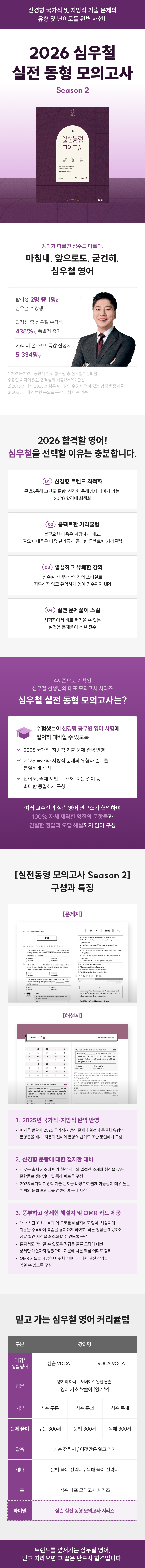 Ã¥¼Ò°³¡º2026 ½É¿ìö ½ÇÀü µ¿Çü ¸ðÀǰí»ç¡»´Â ÃÑ ³× ½ÃÁðÀ¸·Î ±âȹµÈ ½É¿ìö °»çÀÇ ´ëÇ¥ ¸ðÀǰí»ç ½Ã¸®ÁîÀÌ´Ù. 2025³âºÎÅÍ ÃâÁ¦ ±âÁ¶°¡ ´ëÆø °³ÆíµÇ¸é¼, ±âÁ¸ ±âÃâ ¹®Á¦ÀÇ ÇнÀ È¿¿ë¼ºÀÌ Å©°Ô °¨¼ÒÇÔ¿¡ µû¶ó »õ·Î¿î À¯Çü°ú ÃâÁ¦ ¹æÇâ¿¡ ¸ÂÃá ¹®Á¦ Ç®À̰¡ ¼öÇè»ý¿¡°Ô ÇʼöÀûÀÎ »óȲÀÌ µÇ¾ú´Ù. µû¶ó¼ º» µ¿Çü ¸ðÀǰí»ç´Â ¼öÇè»ýµéÀÌ ½Å°æÇâ °ø¹«¿ø ¿µ¾î ½ÃÇè¿¡ öÀúÈ÷ ´ëºñÇÒ ¼ö ÀÖµµ·Ï 2025 ±¹°¡Á÷¡¤Áö¹æÁ÷ ±âÃâ ¹®Á¦¸¦ ¿Ïº®ÇÏ°Ô ¹Ý¿µÇÏ¿´´Ù. 2025 ±¹°¡Á÷¡¤Áö¹æÁ÷ ¹®Á¦ÀÇ À¯Çü°ú ¼ø¼¸¦ µ¿ÀÏÇÏ°Ô ¹èÄ¡ÇÑ °ÍÀº ¹°·ÐÀ̰í, ³À̵µ, ÃâÁ¦ Æ÷ÀÎÆ®, ¼ÒÀç, Áö¹® ±æÀÌ ¶ÇÇÑ ÃÖ´ëÇÑ µ¿ÀÏÇÏ°Ô ±¸¼ºÇÏ¿´´Ù. ¡º2026 ½É¿ìö ½ÇÀü µ¿Çü ¸ðÀǰí»ç¡»´Â ¿©·¯ ±³¼öÁø°ú ½É½¼ ¿µ¾î ¿¬±¸¼Ò°¡ Çù¾÷ÇÏ¿© 100% ÀÚü Á¦ÀÛÇÑ ¾çÁúÀÇ ¹®Ç×µé·Î ±¸¼ºµÇ¾î ÀÖÀ¸¸ç, Ä£ÀýÇÑ Á¤´ä°ú ¿À´ä ÇØ¼³±îÁö ´ã¾Æ ¼öÇè»ýµéÀÇ ÆíÀǸ¦ µ½°íÀÚ ÇÏ¿´´Ù. ¡º2026 ½É¿ìö ½ÇÀü µ¿Çü ¸ðÀǰí»ç¡»¸¦ ÅëÇØ ¼öÇè»ýµéÀº ¸¶¹«¸® Á¡°Ë°ú ÃÖÁ¾ ½ÇÀü ÈÆ·ÃÀ» ÇÏ¸ç ½Å°æÇâ ½ÃÇè¿¡µµ ÀڽŠÀÖ°Ô ´ëºñÇÒ ¼ö ÀÖÀ» °ÍÀÌ´Ù.