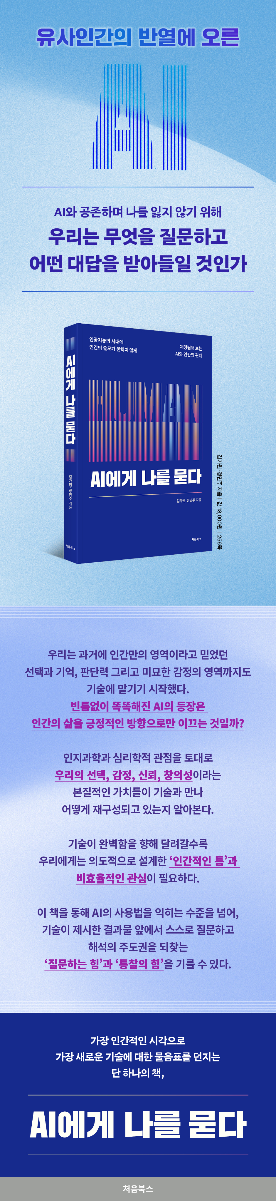 ÀÌ Ã¥ ¡ºAI¿¡°Ô ³ª¸¦ ¹¯´Ù¡»´Â ÀΰøÁö´É°ú °øÁ¸Çϸç '³ª'¶ó´Â ÁÖü¼ºÀ» ÀÒÁö ¾Ê±â À§ÇØ ¹«¾ùÀ» Áú¹®ÇÏ°í ¾î¶»°Ô ´ëÃ³ÇØ¾ß ÇÏ´ÂÁö¸¦ ±íÀÌ ÀÖ°Ô ¼ºÂûÇÑ´Ù. ÀúÀÚµéÀº ÀÎÁö°úÇаú ½É¸®ÇÐÀû °üÁ¡À» Åä´ë·Î, ¿ì¸®ÀÇ ¼±ÅÃ, °¨Á¤, ½Å·Ú, âÀǼºÀ̶ó´Â º»ÁúÀûÀÎ °¡Ä¡µéÀÌ ±â¼ú°ú ¸¸³ª ¾î¶»°Ô À籸¼ºµÇ°í ÀÖ´ÂÁö Áý¿äÇÏ°Ô ÆÄ°íµç´Ù. ƯÈ÷ ¿ì¸®°¡ È¿À²¼ºÀ̶ó´Â ¸í¸ñÇÏ¿¡ '»ý°¢ÀÇ ¿µ¿ª'±îÁö ¿ÜÁÖÈÇÏ¸é¼ ½º½º·Î °í¹ÎÇϰí Àγ»ÇÏ´Â '»çÀ¯ÀÇ ±ÙÀ°'À» ÅðȽÃ۰í ÀÖÁö´Â ¾ÊÀºÁö ³¯Ä«·Î¿î ¹°À½Ç¥¸¦ ´øÁø´Ù.