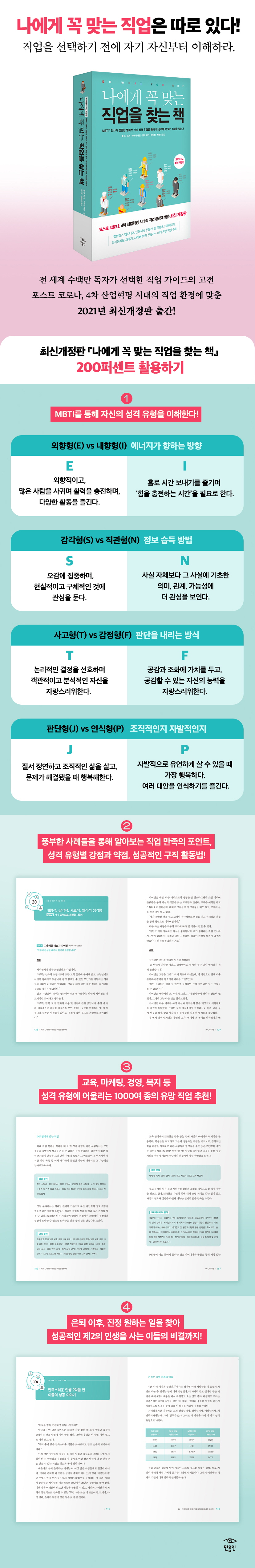 ÀÚ½ÅÀÇ ¼º°Ý¿¡ ¸Â´Â ÃÖ°íÀÇ Á÷¾÷À» ãµµ·Ï µ½´Â ¾È³»¼ ¡º³ª¿¡°Ô ²À ¸Â´Â Á÷¾÷À» ã´Â Ã¥¡»ÀÇ ÃֽŰ³Á¤ÆÇÀÌ ¢ß¹ÎÀ½Àο¡¼ Ãâ°£µÇ¾ú´Ù. ÀÌ Ã¥Àº ¡¶Æ÷Ãá¡·ÀÌ ¼±Á¤ÇÑ 500´ë ±â¾÷À» ºñ·ÔÇØ ±¹³» ´ë±â¾÷¿¡¼ Ȱ¿ëÇϰí ÀÖ´Â MBTI Å×½ºÆ®¸¦ ÅëÇØ, ÀÚ½ÅÀÇ ¼º°ÝÀ» ÀÌÇØÇÏ°í ±×¿¡ ¸Â´Â Á÷¾÷À» ãµµ·Ï µ½´Â´Ù. Á÷¾÷ Àü¹®°¡ÀÎ ÀúÀÚµéÀº 30³â ÀÌ»ó ÇöÀå¿¡¼ ½×¾Æ ¿Â °æÇèÀ» ¹ÙÅÁÀ¸·Î °¢ ¼º°Ý À¯Çü¿¡¼ ¼º°øÇÑ À̵éÀÇ »ç·Ê¸¦ »ý»ýÇÏ°Ô µé·ÁÁÖ¸ç, °¢ À¯ÇüÀÇ Àå´ÜÁ¡°ú ±¸Á÷ Ȱµ¿ ½Ã ÁÖÀÇÇØ¾ß ÇÒ Á¡ µîÀ» Á¶¾ðÇÑ´Ù. ¼¼°èÀûÀÎ ½ºÅ׵𼿷¯·Î ÀÚ¸® ÀâÀº ÀÌ Ã¥Àº ±¹³»¿¡¼µµ 20¼â ÀÌ»ó Áß¼âµÇ¸ç, û¼Ò³âºÎÅÍ Á÷¾÷ »ó´ã»ç±îÁö ´Ù¾çÇÑ µ¶ÀÚµé·ÎºÎÅÍ ²ÙÁØÈ÷ »ç¶û¹Þ°í ÀÖ´Ù.